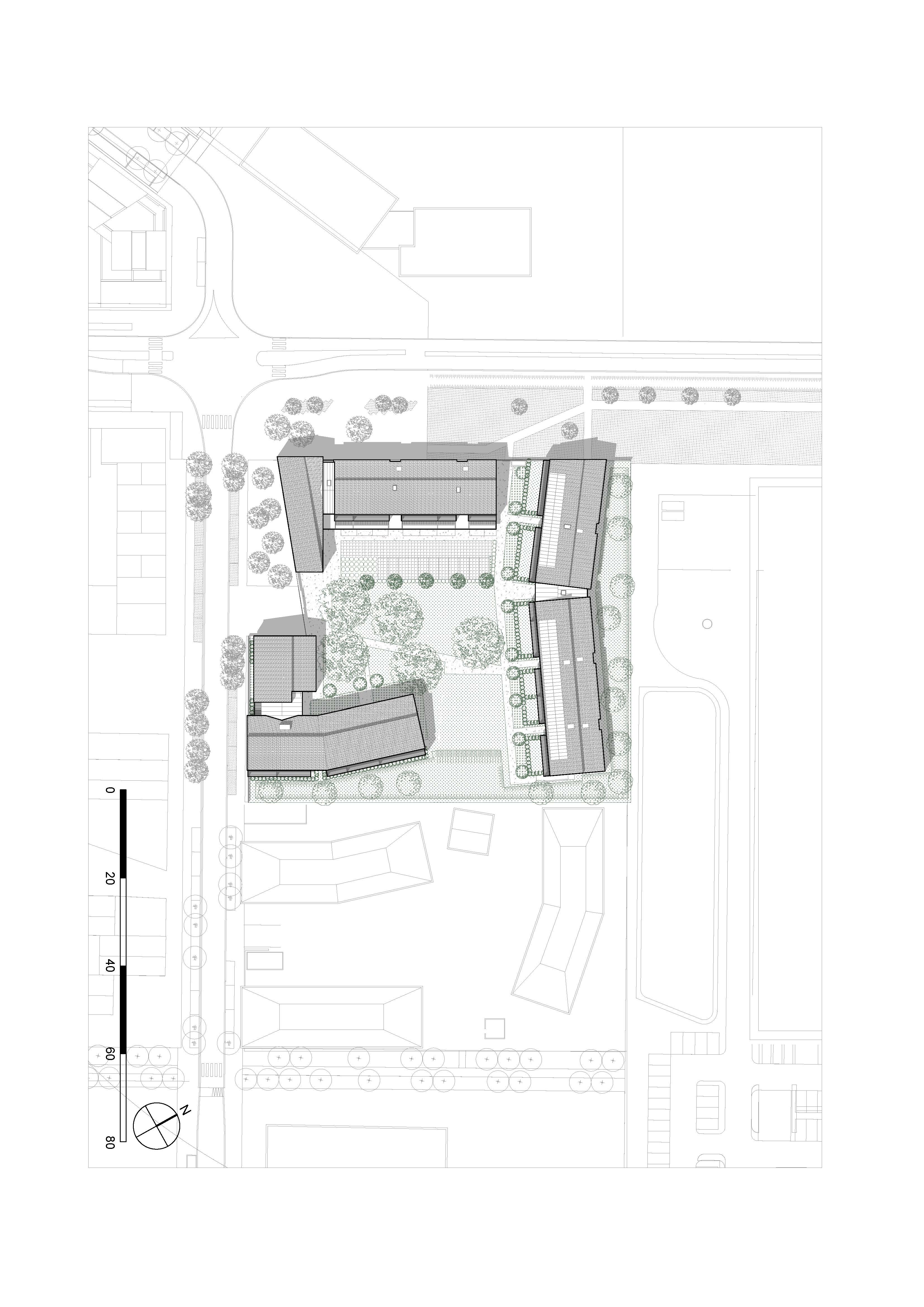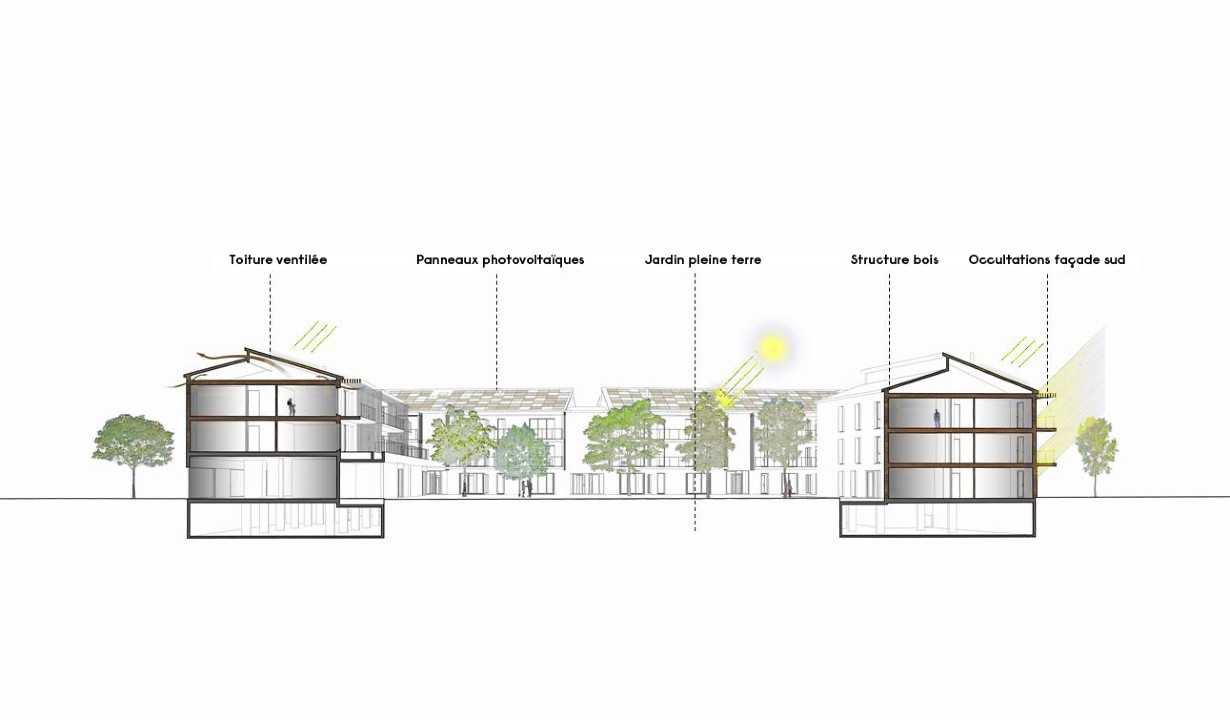 Le projet exprime le corps de ferme qui tient les limites du terrain et déploie un grand cœur d’îlot. La forme de longères, met en scène dualité d’écriture et dualité d’usage : côté rue, des façades presque silencieuses ponctuées de fenêtres étroites et verticales qui éclairent les chambres, associées à des volets en bois. côté cœur d’ilot des façades animées, prolongées par de grands balcons sur le jardin. Le bois y est plus présent sous la forme de claustras de mélèze. Les toitures, dissociées en deux éléments mettent en valeur le versant « soleil » qui reçoit les panneaux photovoltaïques.