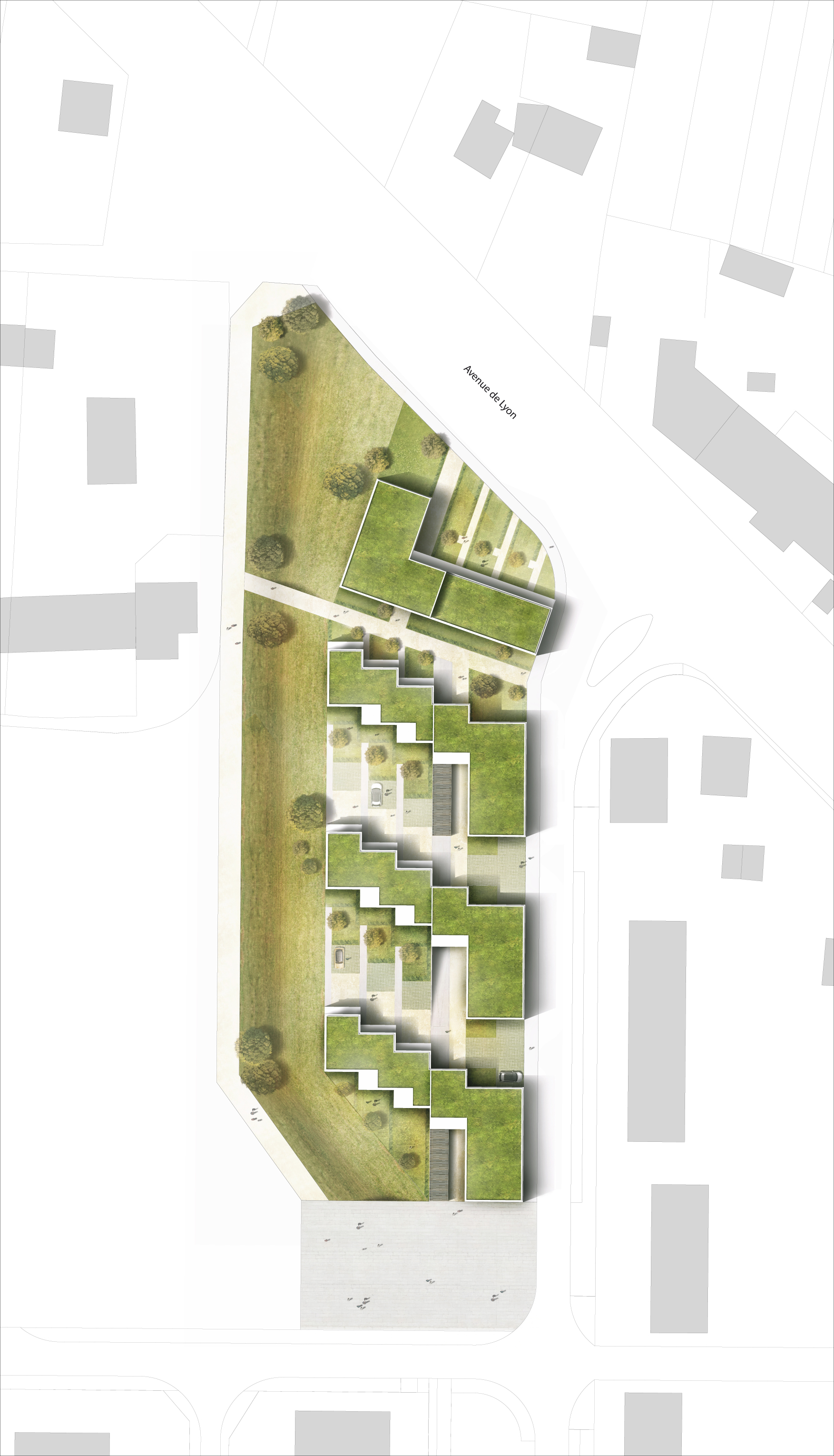 Le plan de masse du projet de logements sociaux collectifs et intermédiaires faisant l’objet du groupement de commande des deux bailleurs sociaux, Logidôme et l’OPHIS, obéit à une composition en lanières orientées Nord/Sud qui ordonne l’ensemble du projet et lui donne sa cohérence. Ce principe de composition s’appuie directement sur la trame longiligne du parcellaire agricole qui occupaient le site jusqu’au milieu du 20ème siècle, aujourd’hui largement effacée.