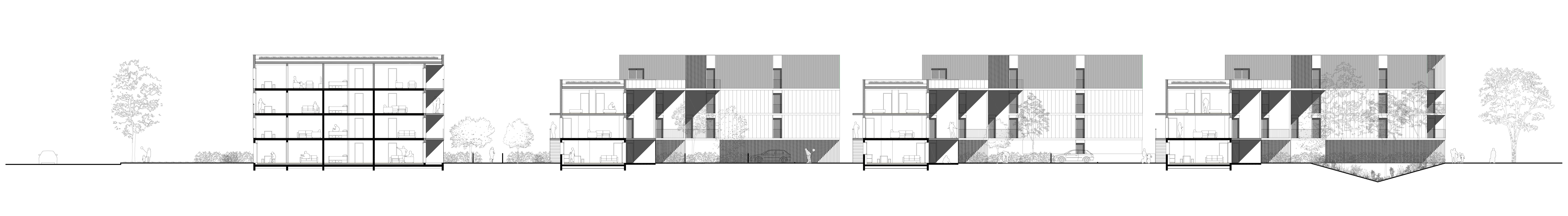 Approche environnementale : Le dessin en lanières est articulé à la noue du site, grande figure paysagère ordonnant le nouveau quartier Le Petit Mortaix en lui donnant une direction Nord/Sud affirmée. La composition en lanières s’applique à la morphologie et à l’implantation du bâti. Plutôt que de comprendre le projet comme une articulation simple de deux programmes de logements sociaux émanant de deux bailleurs, nous avons considéré le projet comme une seule entité et qui fabrique un fragment urbain clairement identifiable.