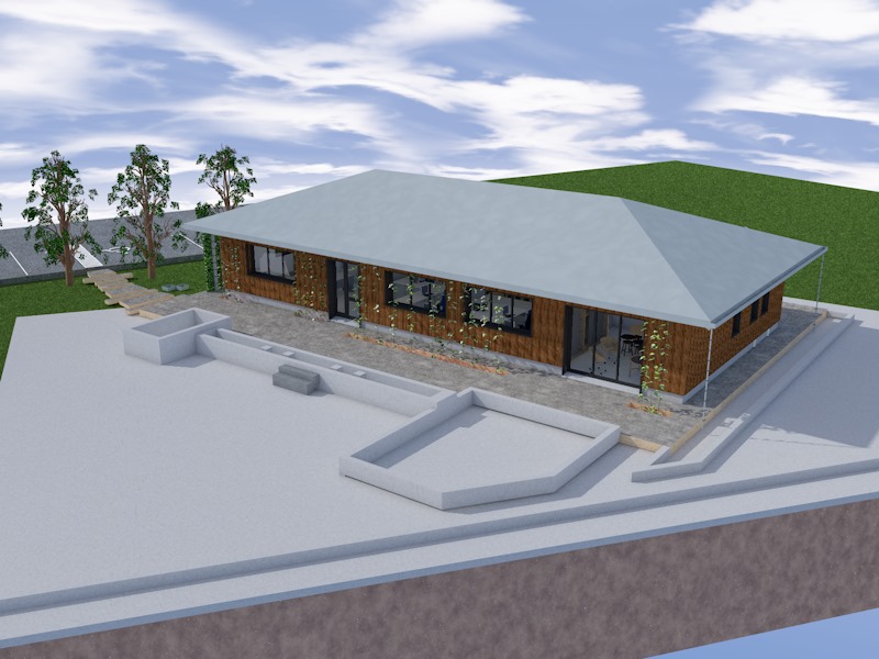 Descriptif technique : Le volume de la construction est simple: - Un volume en ossature bois couvert à 4 pentes en ZINC et bardé d'un bardage naturel. - Projet isolé en laine de bois extérieure, en GR32 entre montant et en laine métisse sur l'intérieur. Les fermettes de toitures sont elles isolées en laine de verre soufllée