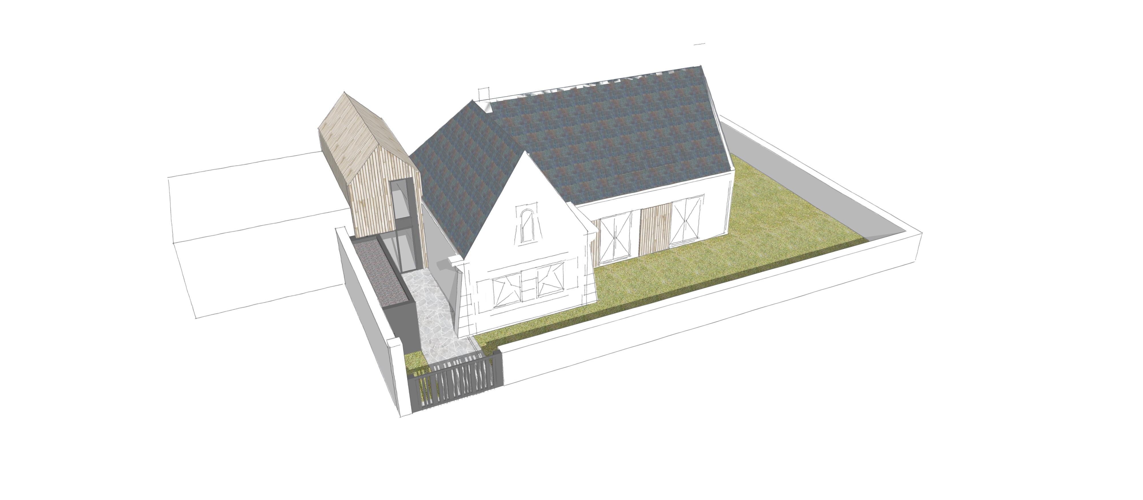 Le projet consiste à remplacer le garage d'une habitation par une extension contemporaine. Le RDC comprend des rangements et un vestiaire, l’étage est aménagé en chambre. Le volume de l’extension est simple : tout en bois, avec une toiture double pente respectant les typologies environnantes. L'unité de matériau lui confère une certaine originalité dans ce quartier pavillonnaire. Les volets de l'habitation principale sont remplacés par des volets dans le même bois, moyen de raccorder discrètement l'extension à la néo bretonne.