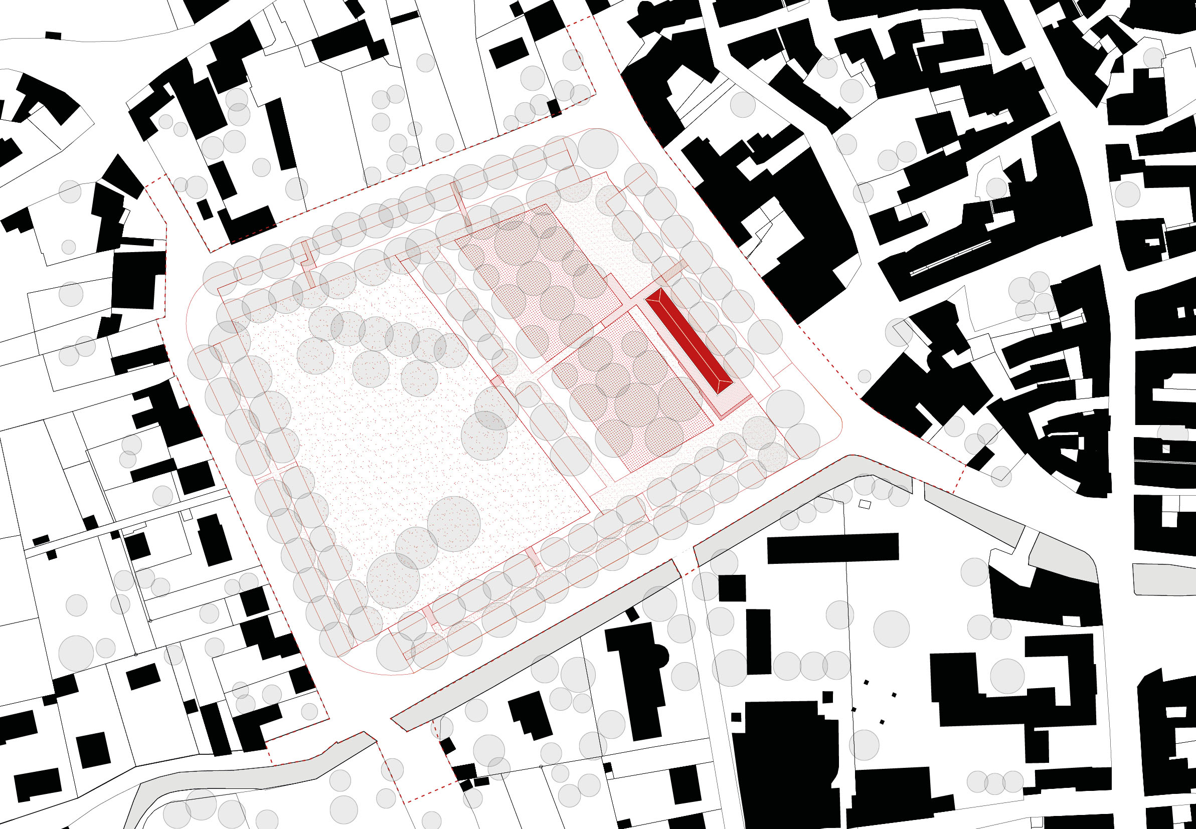 La halle multifonctionnelle s’installe à proximité du centre-ville, à l’Est de la place du Champ de Foire de Gannat. Elle s’inscrit dans le réaménagement de la place et de ses abords. L'édifice abrite dans son extrémité Nord un local associatif, ouvert sur la place et le terrain de pétanque. A l’opposé, le café-boutique éphémère s’ouvre entièrement sur l’espace extérieur et couvert. Entre les deux, se trouve le programme technique, une loge, des toilettes publiques, un local poubelle et un espace de stockage.