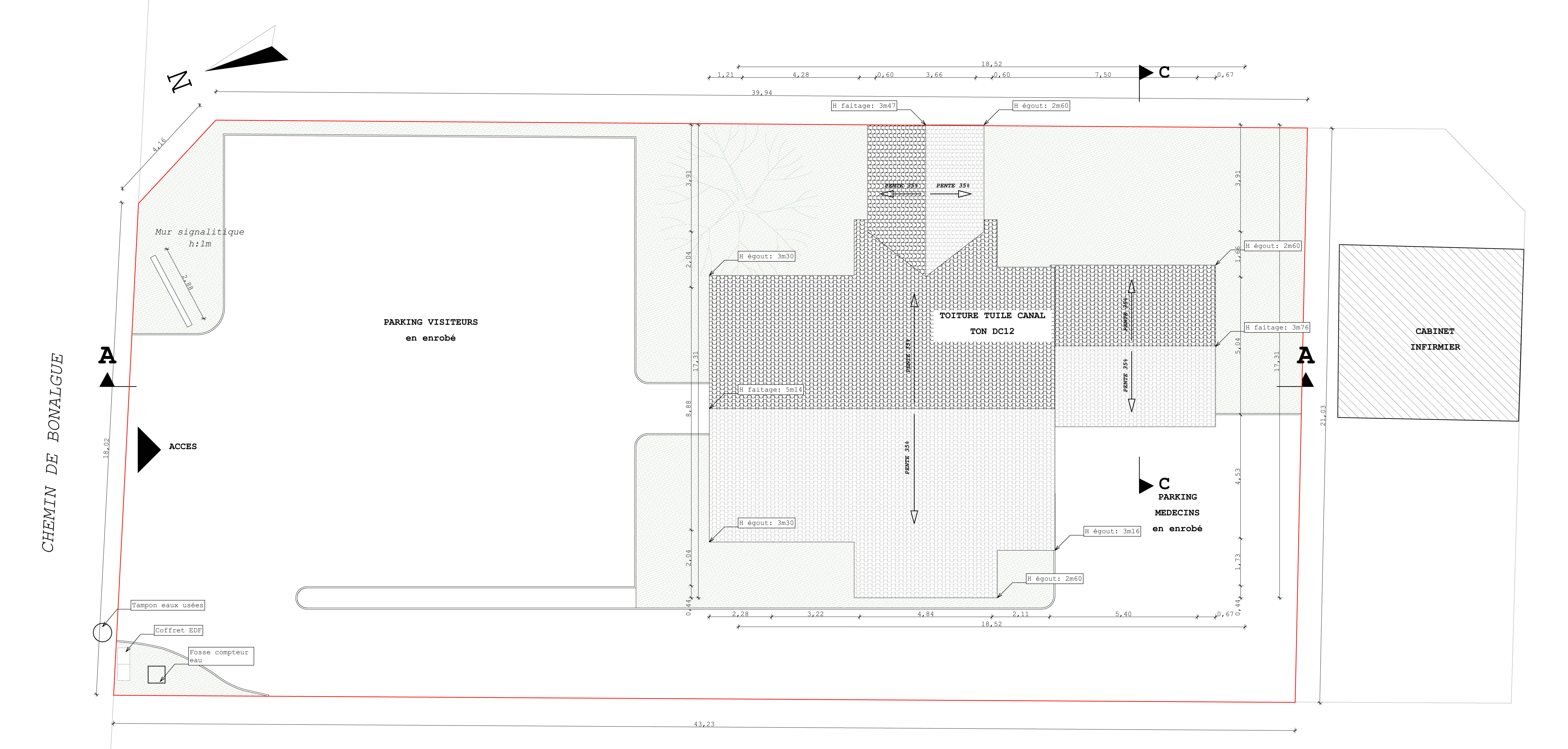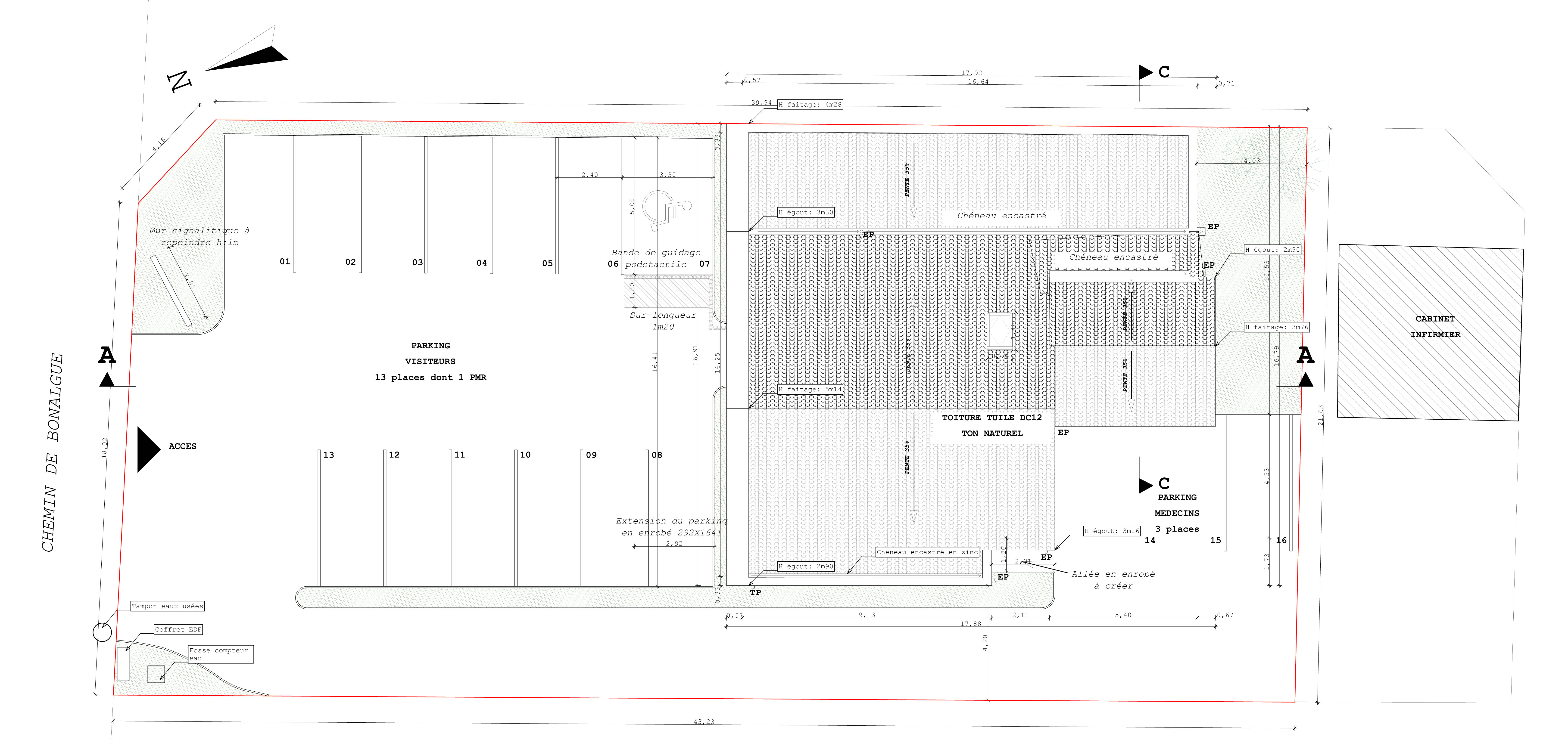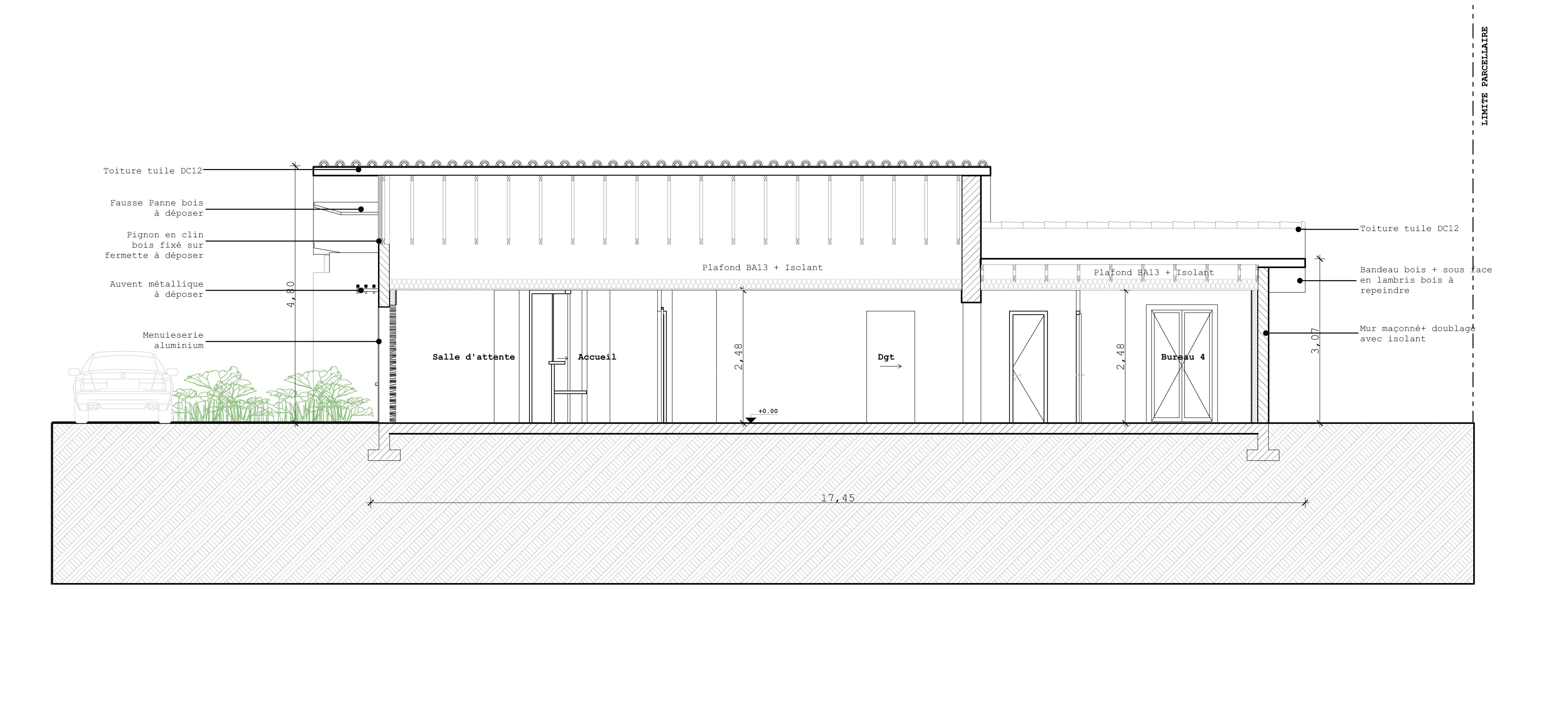 Suite au développement de l'activité des maître d'ouvrage (médecins), le centre médical existant était devenu trop étroit et ne correspondait plus aux besoins de leur pratique. Le projet consiste en l’agrandissement de la salle d’attente et des bureaux et la rénovation complète des locaux. La conception s’attache à dessiner une ligne claire. Les extensions s’inscrivent dans le prolongement des toitures existantes. Des poteaux bois rythment la façade et sont cerclés par un bandeau métallique blanc.