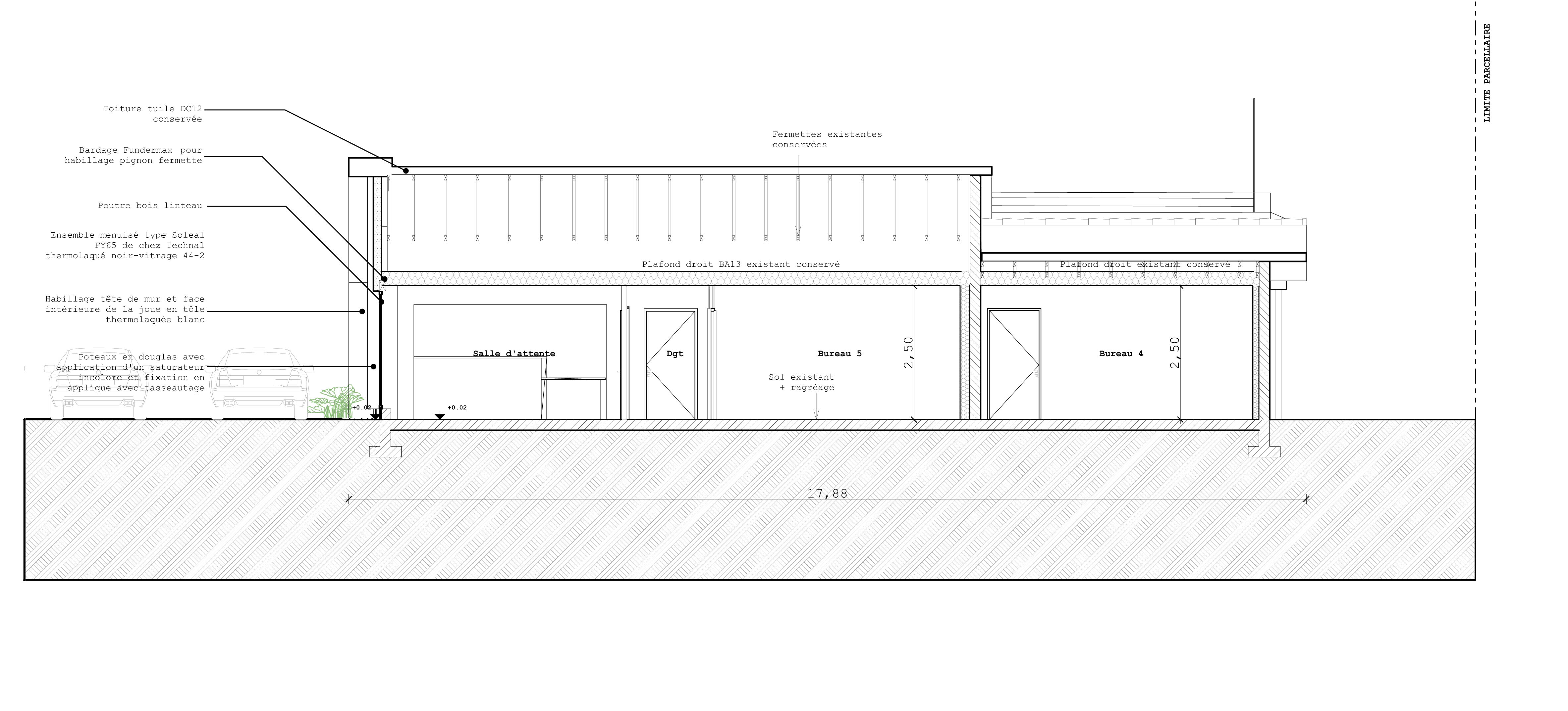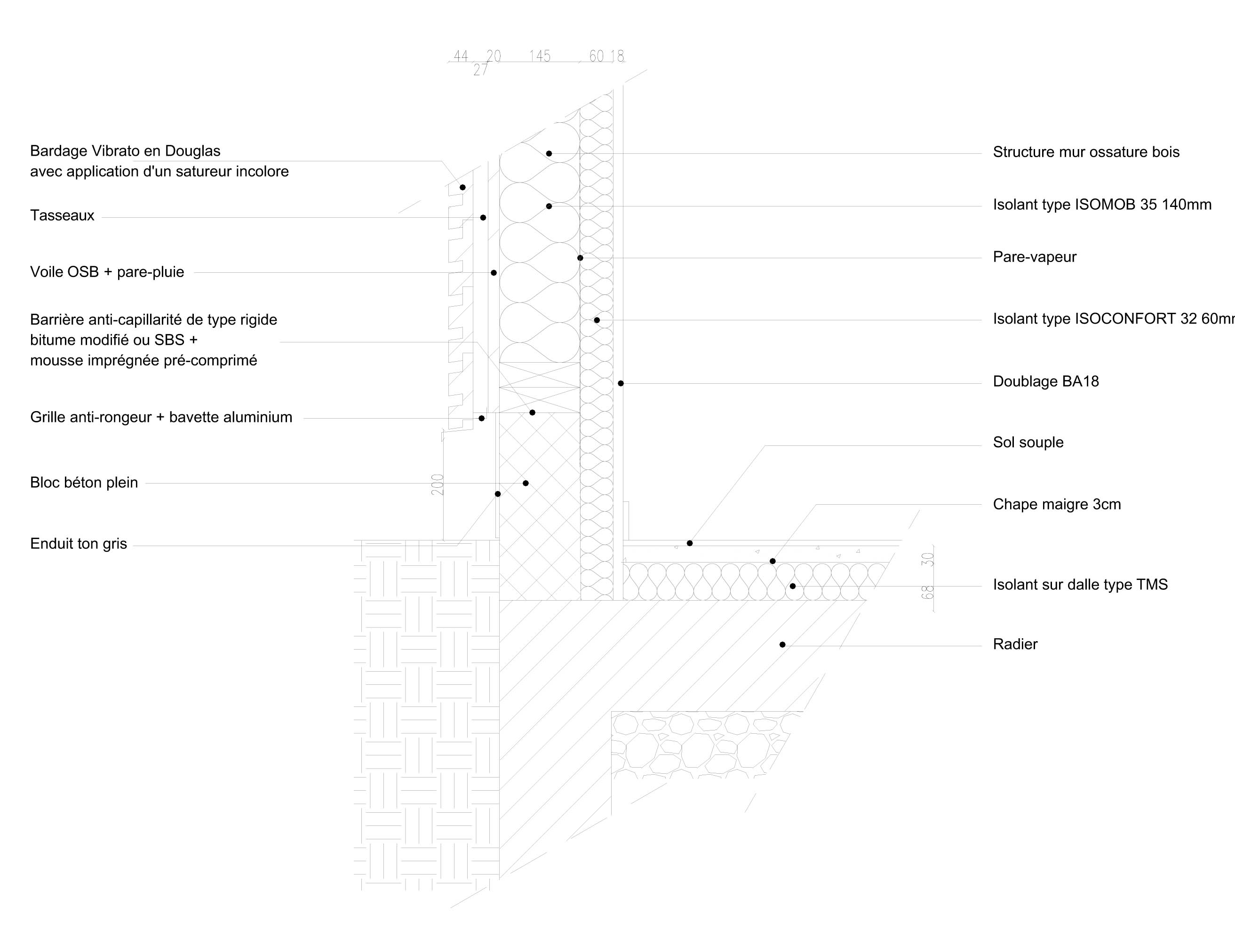 Descriptif technique : Mur ossature bois avec bardage en pin autoclave ton brun, menuiserie aluminium, ITE en fibre de bois et enduit monocouche, Charpente traditionnelle (extension) avec couverture en tuile canal. Chauffage/climatisation réversible sur PAC.