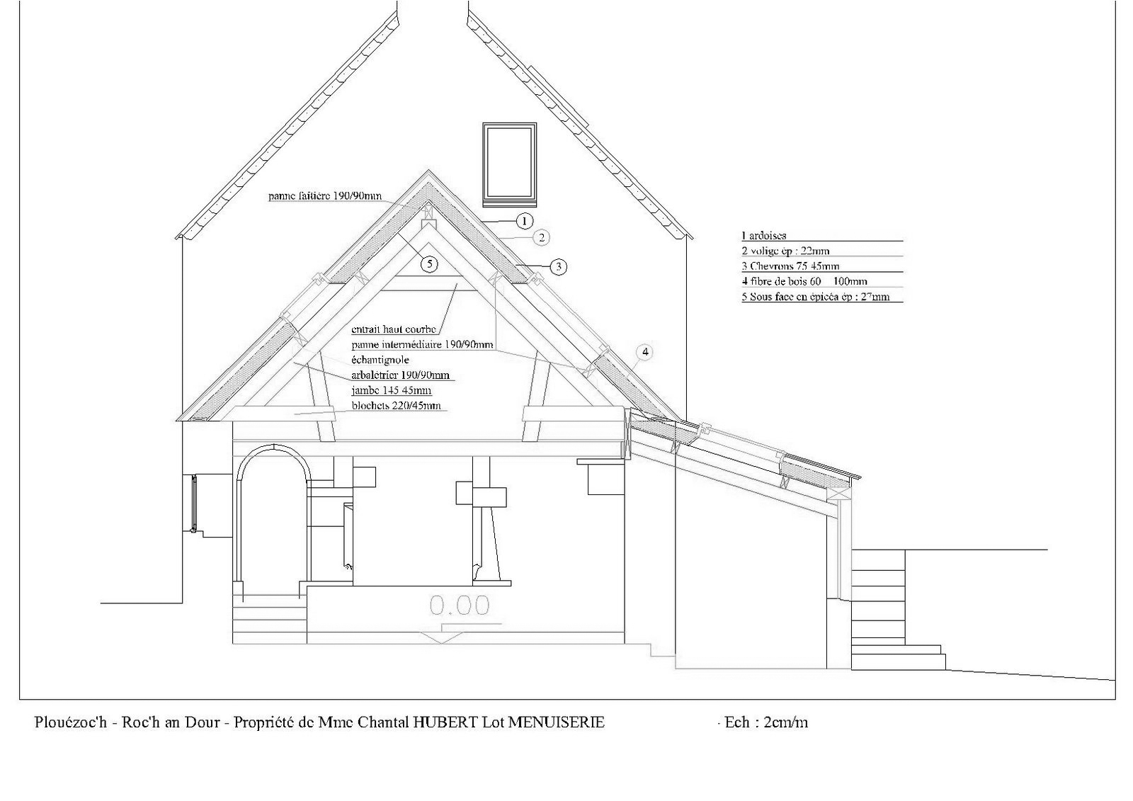Descriptif technique de l'aménagement : Surface habitable : 260 m² + terrain de 1500 m² Orientation Sud/Sud est Le bâtiment date du 17ème siècle en schiste et granit. Matériaux : Schiste, granit, charpente et plancher bois. La toiture est en ardoise. Vélux créés en toiture. Exposition : Nord (façade sur maison voisine) – Sud (façade sur jardin). Façades : Sud : création d’un jardin d’hiver vitré. Ouest : façade en bardage et menuiserie bois. Nord : Déplacement de fenêtres. Isolation / apport solaire : Sol (Polystyrène 100mm), plafond, murs intérieurs en enduit chaux chanvre. - murs ext en enduits chaux chanvre (pour utiliser au max l’inertie des murs). - combles en fibre de bois. (16 cm) - Cloisons contreplaqué de peuplier + ouate de cellulose - fenêtres en double vitrage + argon - Jardin d’hiver sud - Mur pignon ouest : bardage douglas + laine de chanvre Chauffage/ECS : Chaudière granulés bois et plancher chauffant. * Chaudière à granulés de bois (hargassner).= 15-35 kw - Chauffage par le sol en rdc et radiateurs à l’étage. Dalles chauffantes en chaux chanvre (+serpentin) recouvertes de terre cuite. - Eau chaude sanitaire * 2 poêles à bois : Pignon Ouest + Pignon Est * 1 cheminée à foyer ouvert (agrément) Ventilation : VMC simple flux hygroréglable. Production d’energie electrique : panneaux photovoltaiques sur l’atelier (orienté plein sud). Récupération eau de source (bas du terrain, par une pompe située ds l’atelier)) pour eaux sanitaires (WC, LV, LL, Jardin) ISOLATION : - Toiture Panneaux de fibre de bois croisés 2 épaisseurs de 8 cm sur longère Ouate de cellulose 20cm sur cuisine - jardin d'hiver Ouate de cellulose 20cm sur gîte - Pignon Ouest Laine de bois 14cm - Murs de pierre Enduit intérieur Chaux Chanvre de 5cm