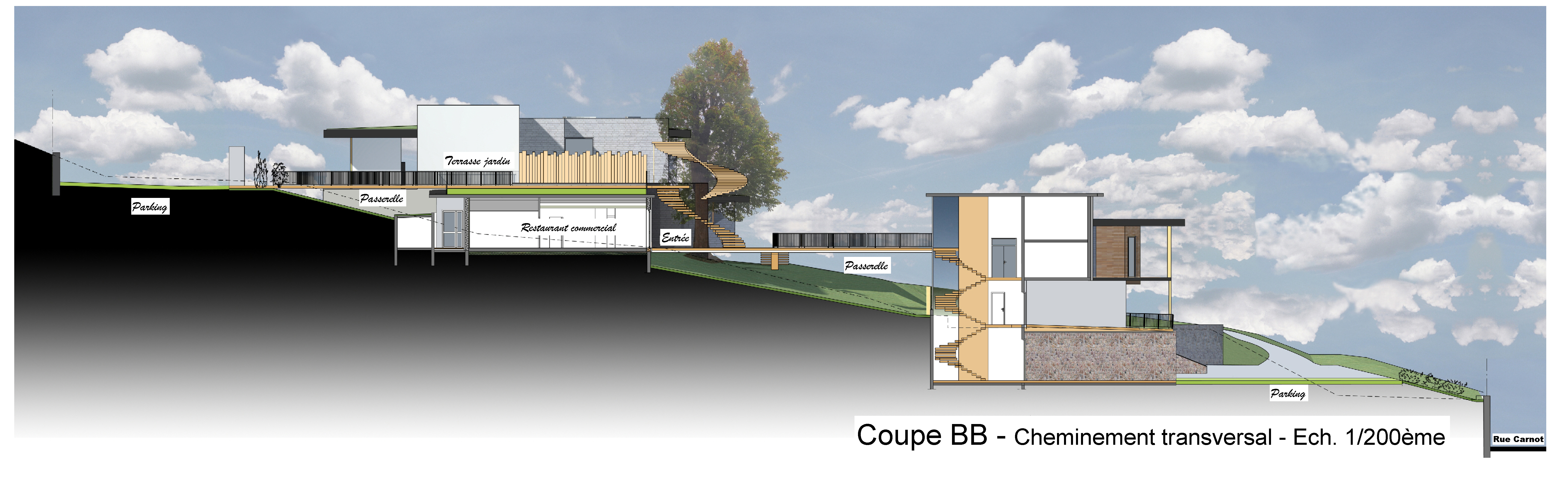 Cette opération comprend la construction de 2 bâtiments permettant d'accueillir un pôle de restauration (cuisine centrale, restaurant commercial, restaurant social et restaurant scolaire avec quatre salles), un espace de formation et un espace médico-social. Le projet architectural s'est attaché à préserver au maximum les éléments paysagers remarquable du site. Le bâti accompagne la topographie et se développe sous forme de plateaux superposés, décalés, pour former des terrasses et des patios, dans lesquels s’insèrent la végétation.