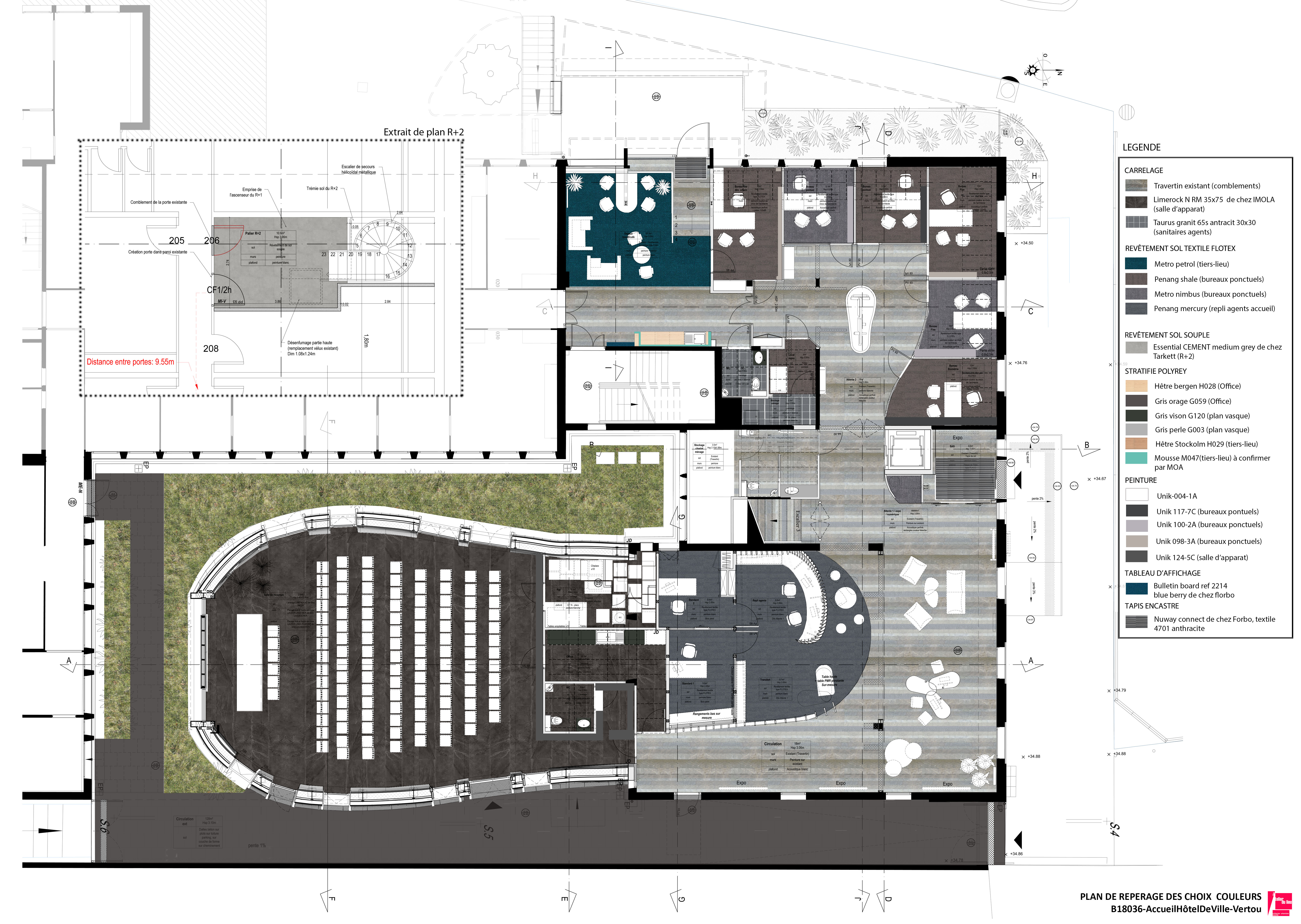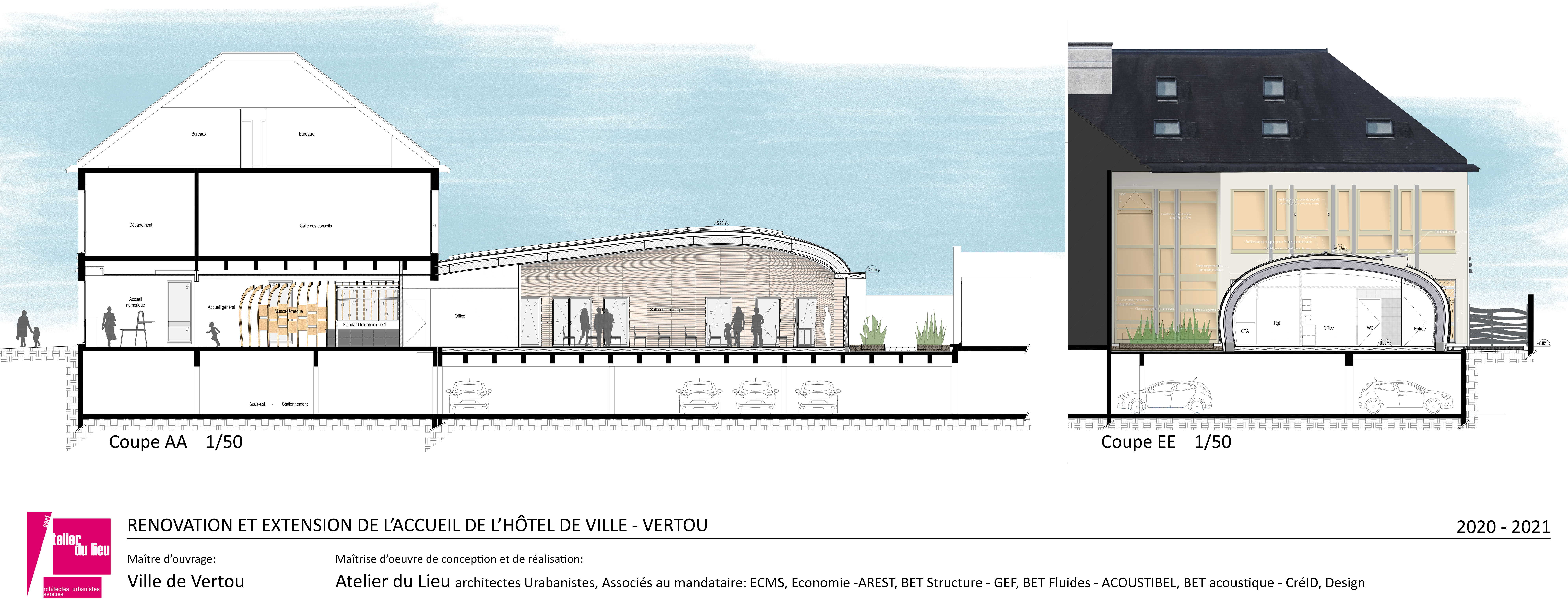 Le projet consiste à réenvisager complètement la manière d’accueillir les usagers de la mairie, en trois lieux distincts : 1-Un espace d’accueil général où les agents d’accueil viennent à la rencontre des usagers, dans lequel se situe un « cocon de bois » créant un espace de repli pour les agents, 2-Un espace d’attente entouré de six bureaux, délimités par des menuiseries bois vitrées sur lesquelles une vitrophanie raconte le territoire, 3-La nouvelle salle des mariages et du conseil municipal qui prend place dans le patio, au-dessus du parking enterré existant, en forme de « bulle de bois ».