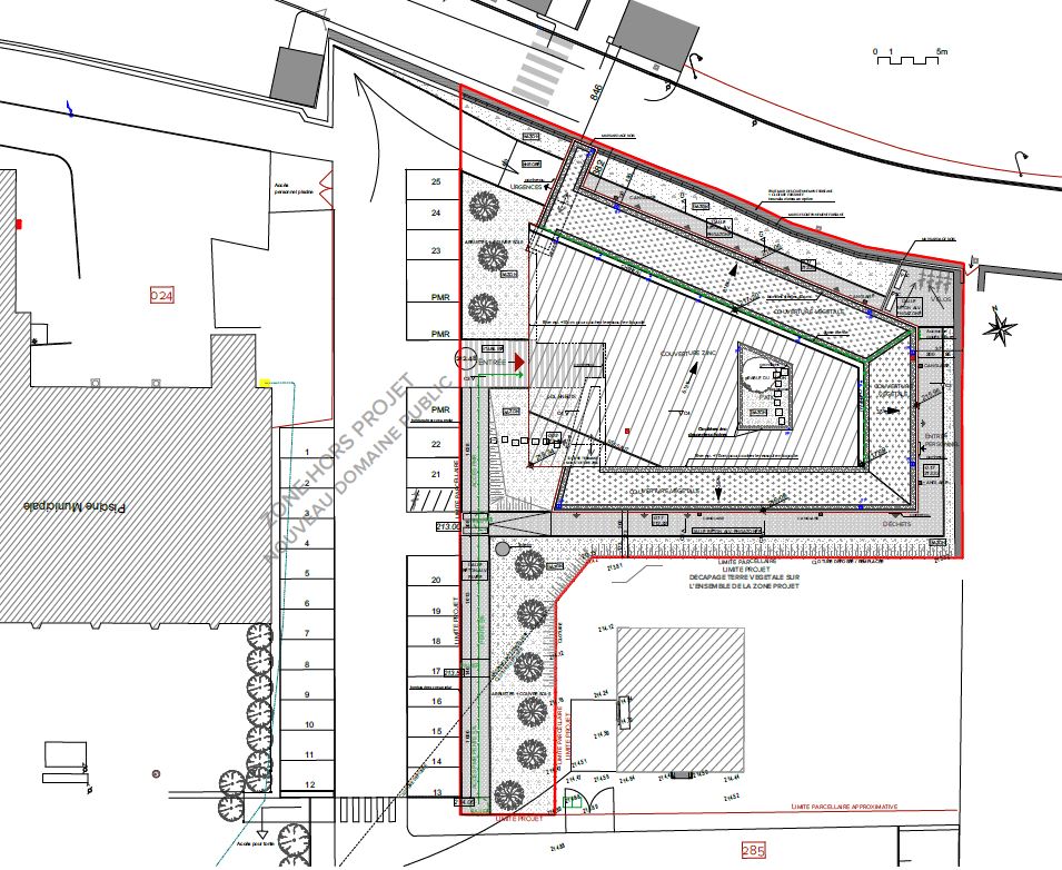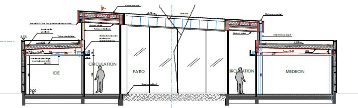 Descriptif technique : Deux types constructifs se côtoient : le béton qui apportent de la masse, utile pour le confort thermique du bâtiment et l'isolation acoustique entre locaux. L'ossature bois qui nous a permis de construire rapidement les petites "boites" des locaux de soins. L'ensemble de la maison de santé bénéficie de chauffage et de climatisation via des PAC Air-Air, situées à l'extérieur, dissimulées derrière une mur-claustra de bois. PEFC (Gestion forestière durable) FSC (Gestion forestière responsable) Marquage CE