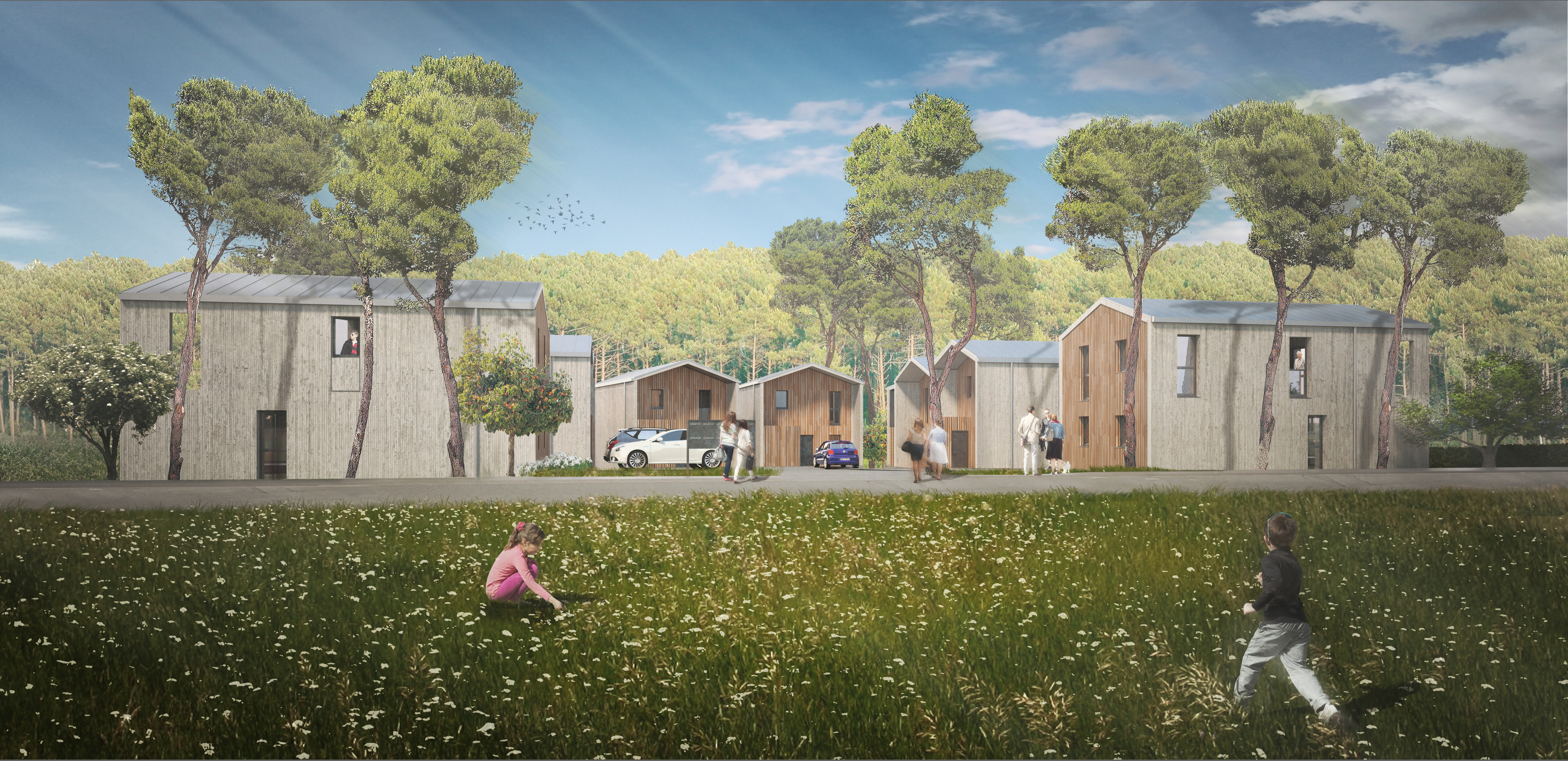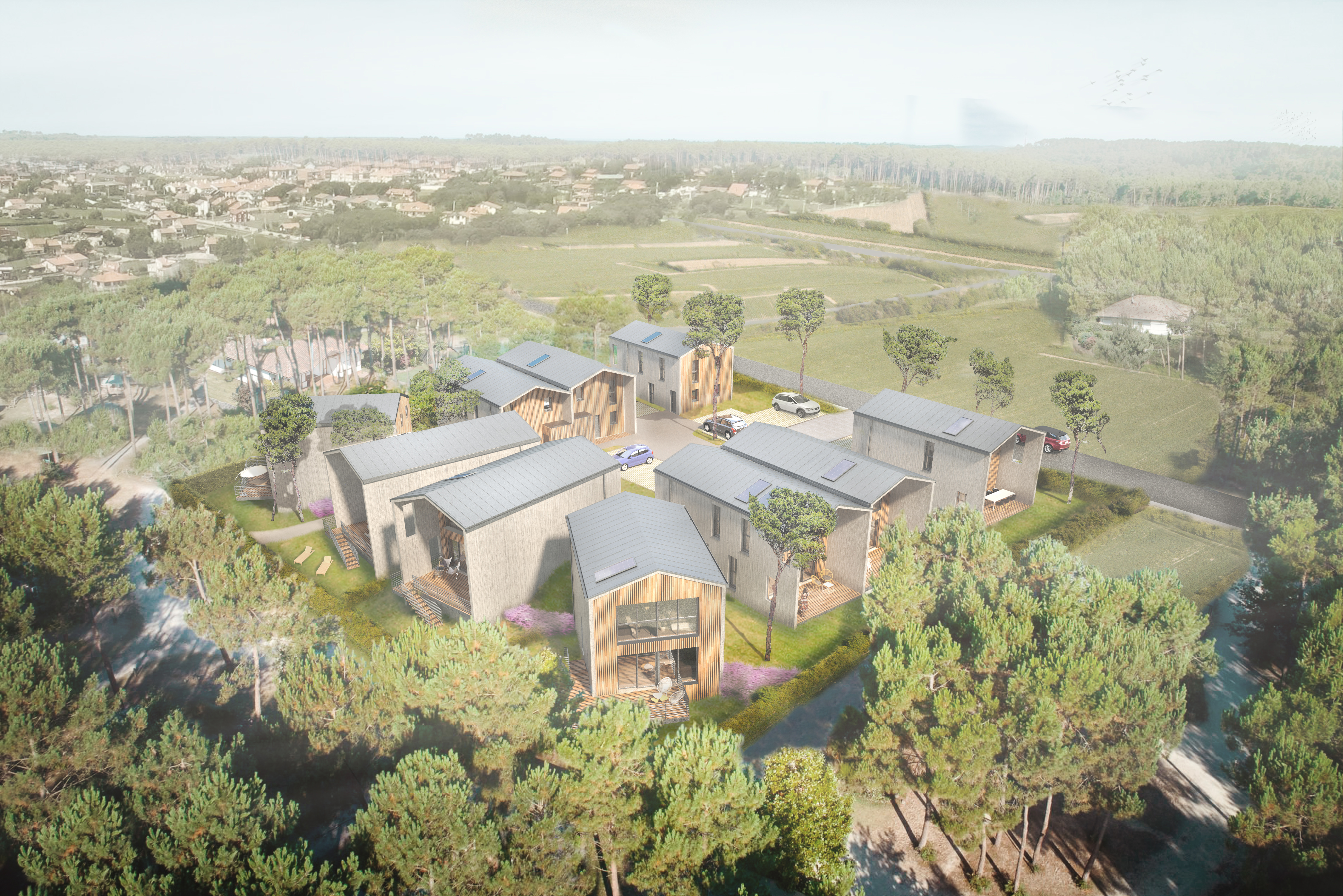 Descriptif technique : Les volumes bâtis sont simples et prennent la forme d’habitations contemporaines. Les murs des façades ont deux finitions différentes : Les murs latéraux sont en béton brut. Les revêtements sur les façades d’accès aux logements et les façades donnant aux terrasses sont en bois. Les couvertures des maisons sont en zinc. Un panneau photovoltaïque positionné sur la couverture de chacune des maisons permet la production d’eau chaude sanitaire et le chauffage. Les clôtures en limites séparatives sont réalisées avec la plantation d’haies vives d’essences locales.