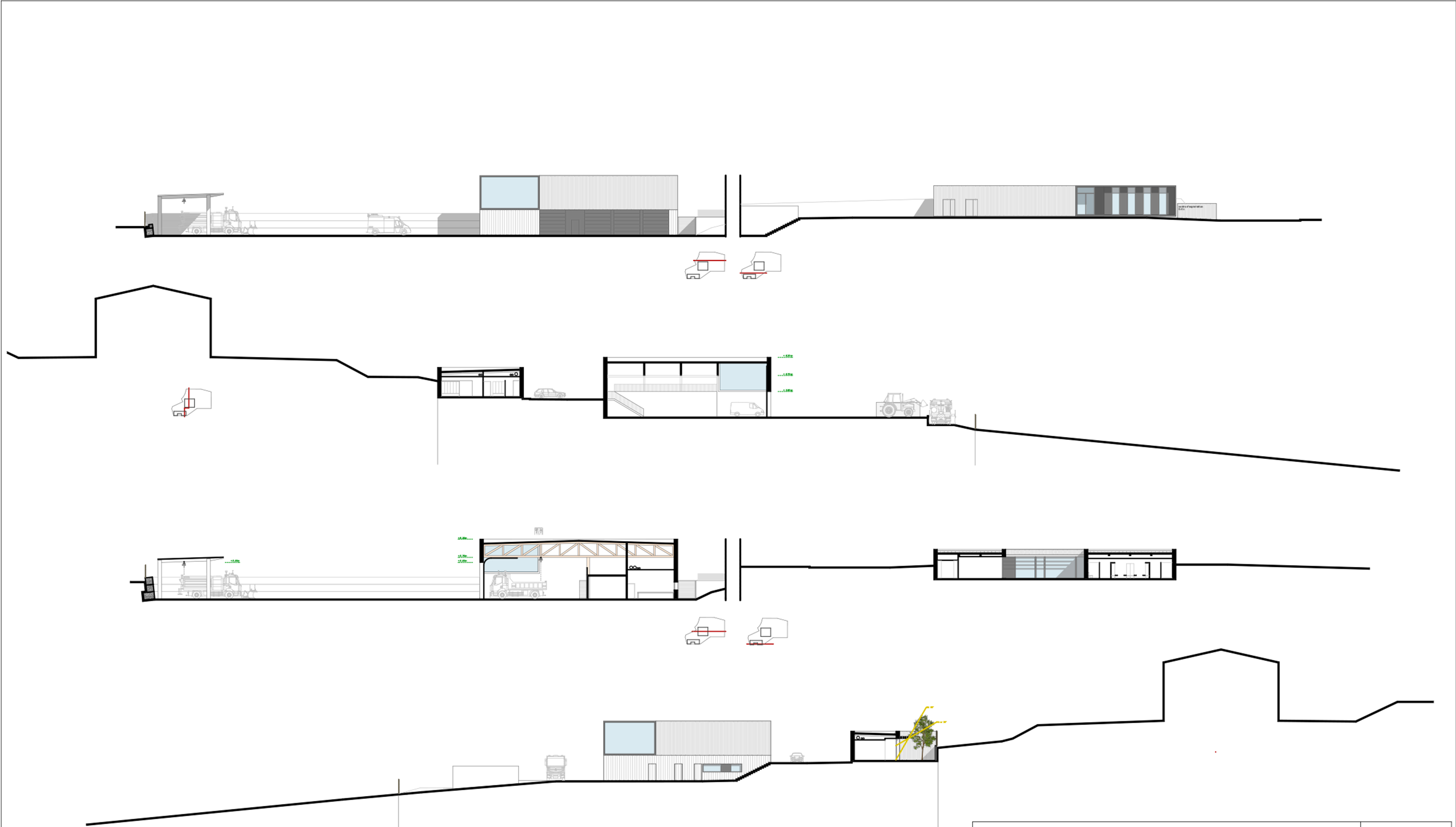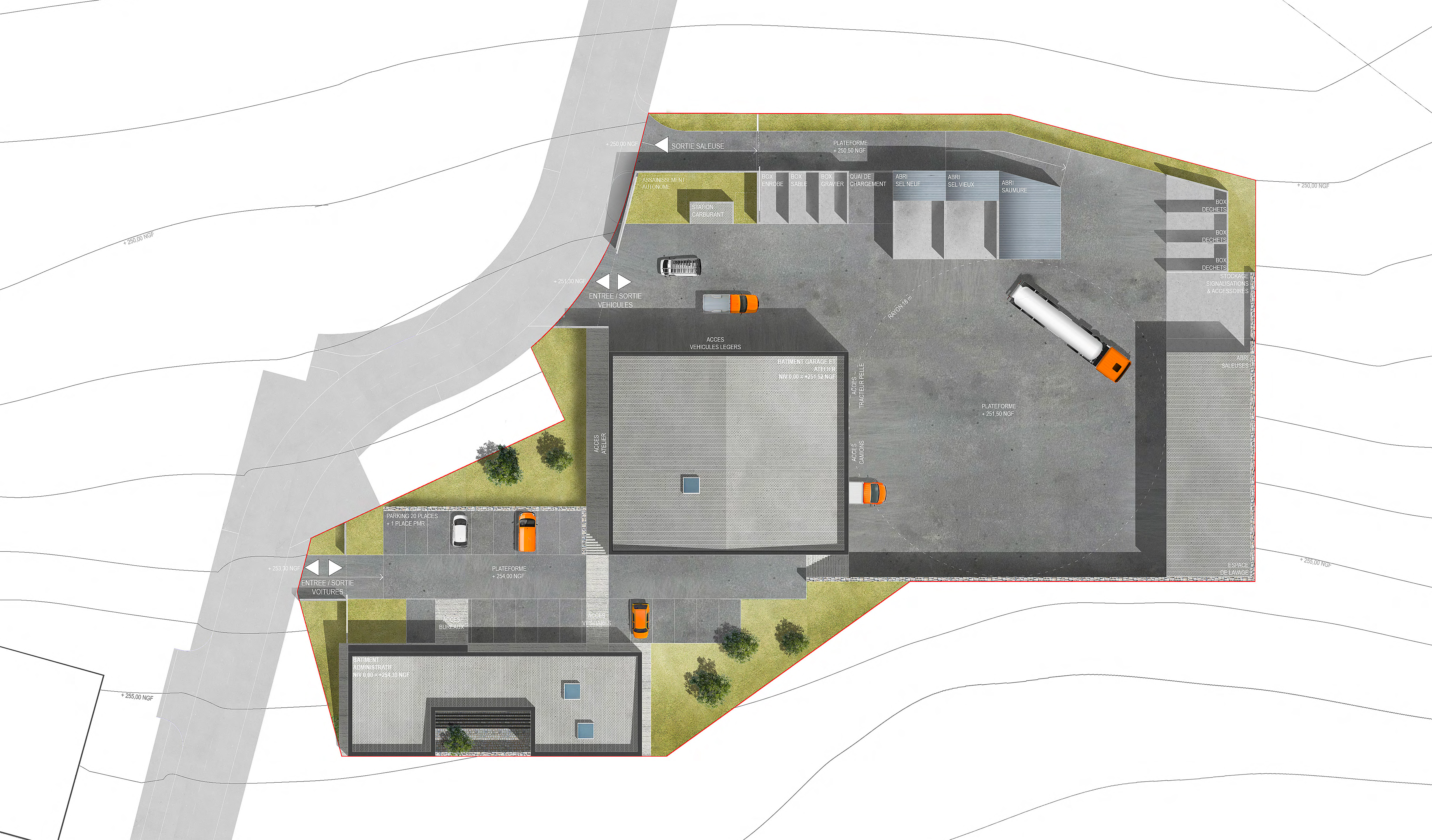 Le Centre Technique (Bâtiment Atelier & Administratif), est un « Bâtiment Outil » structurant, fédérateur, unitaire aux volumétries pures et minimales, ouvert sur son environnement. Le bâtiment étant implanté sur un coteau un travail fin sur la topographie a été mené. Une des préoccupations majeures dans la conception de l’organisation des espaces extérieurs & des locaux est d’offrir des espaces adaptés aux utilisateurs, aux engins & aux machines... La qualité du projet est garanti notamment par l’emploi du bois massif et donc local en s’inscrivant ainsi pleinement dans le cadre du programme