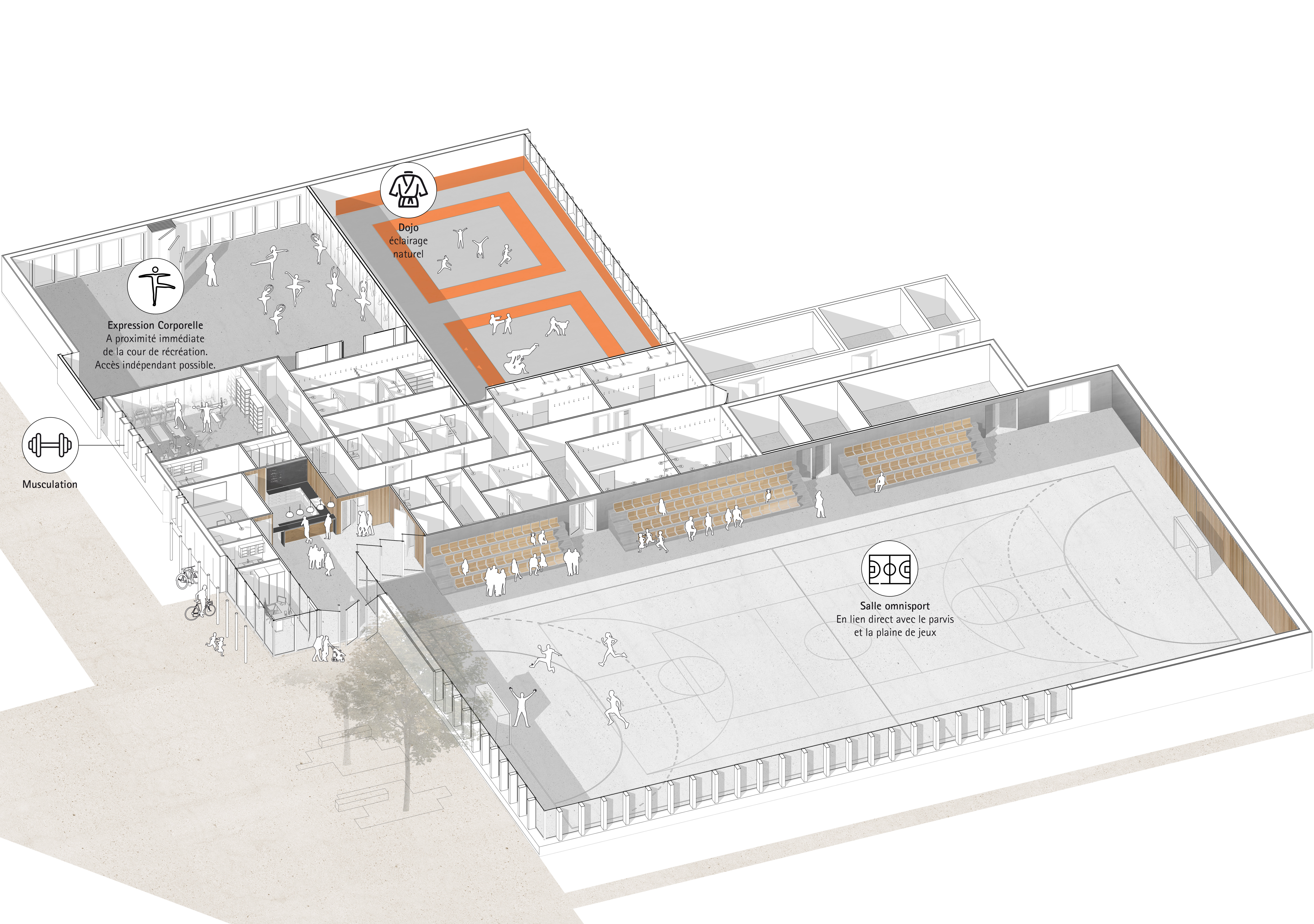 Approche environnementale : La halle des sports conjugue frugalité carbone et sobriété énergétique. La généralisation du bois en structure et des isolants biosourcés : paille, fibre de bois, ouate de cellulose, répond aux critères du niveau 3 du label biosourcé. Ces matériaux renouvelables et locaux encouragent la pérennisation des savoir-faire et la relocalisation des emplois. La sobriété énergétique (RT12 – 20%), est atteinte par la compacité des volumes et la conception bioclimatique. Le projet garantit une bonne maîtrise des apports solaires, un accès généreux à la lumière du jour et à la ventilation naturelle.