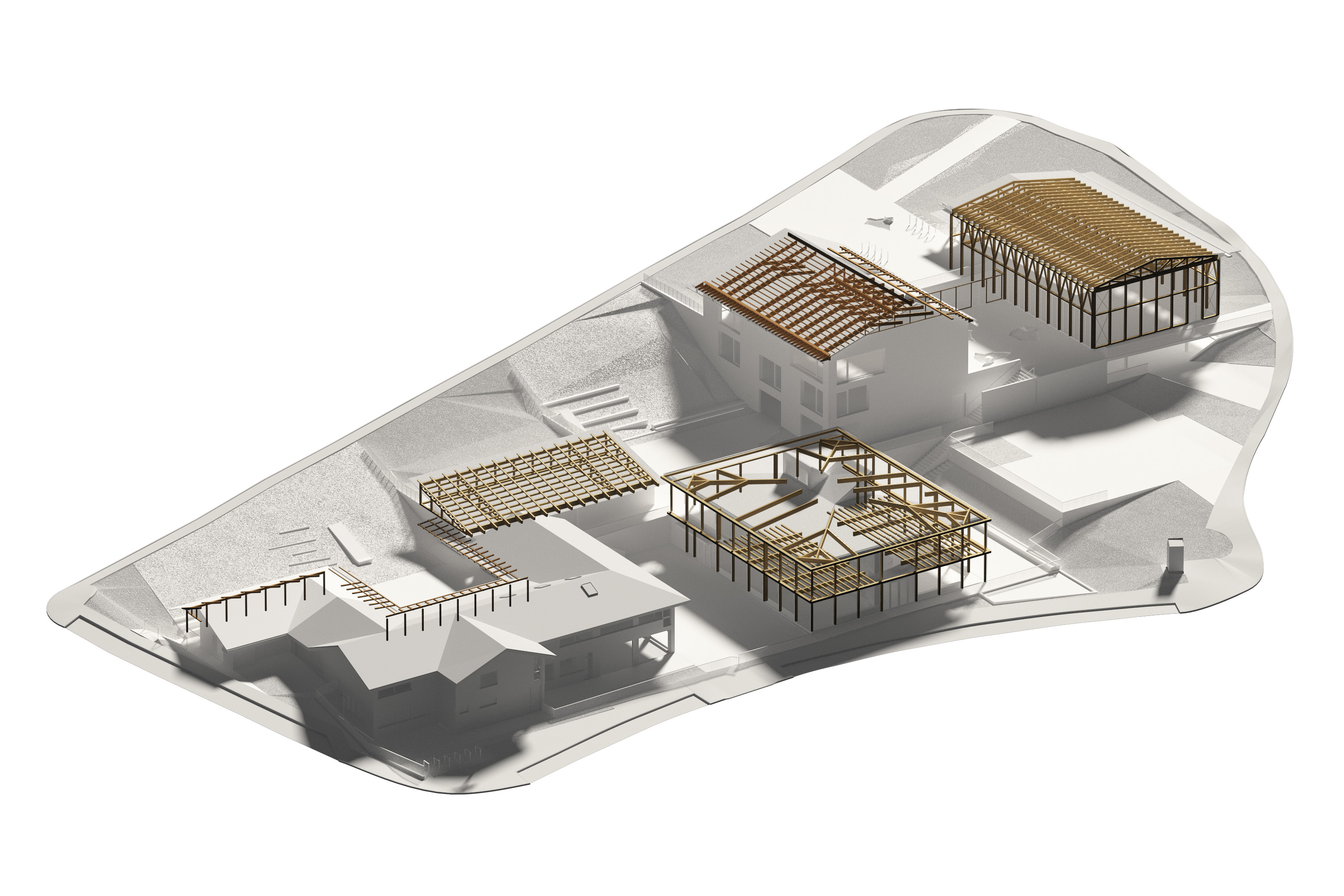 Le programme pour le site de Milly était dense, nous y avons vu une grande diversité, potentiellement une famille de bâtiments. Leur imbrication dans la pente a été pensée pour que les relations entre chaque équipement puissent se tisser avec le voisinage. Plus les bâtiments sont imposants, plus ils sont transparents, le regard circule. Ainsi, les plus gros programmes : gymnase et école élémentaire sont en structure bois, laissant la vue depuis la ville et les bâtiments filer vers le grand paysage et le lac Léman.