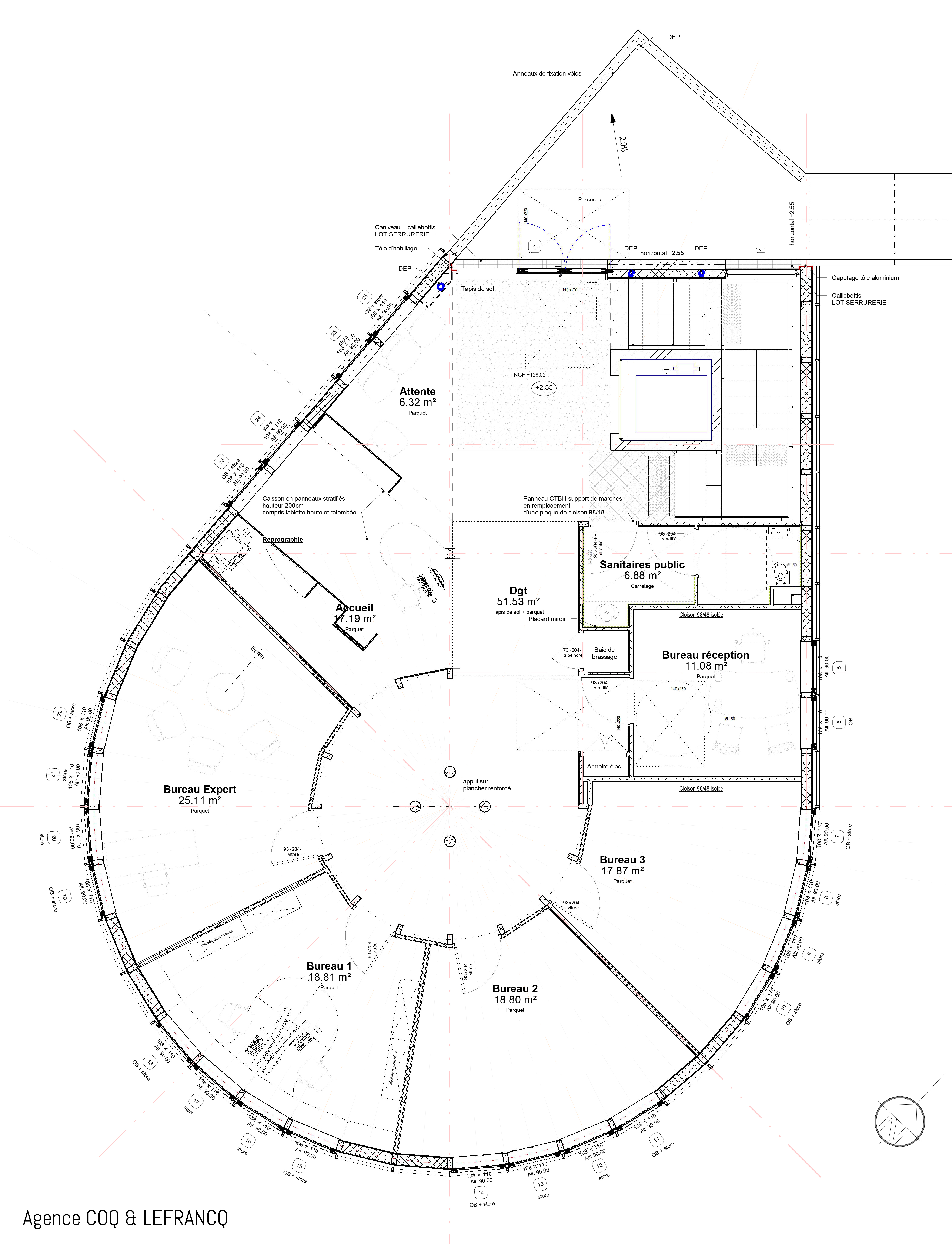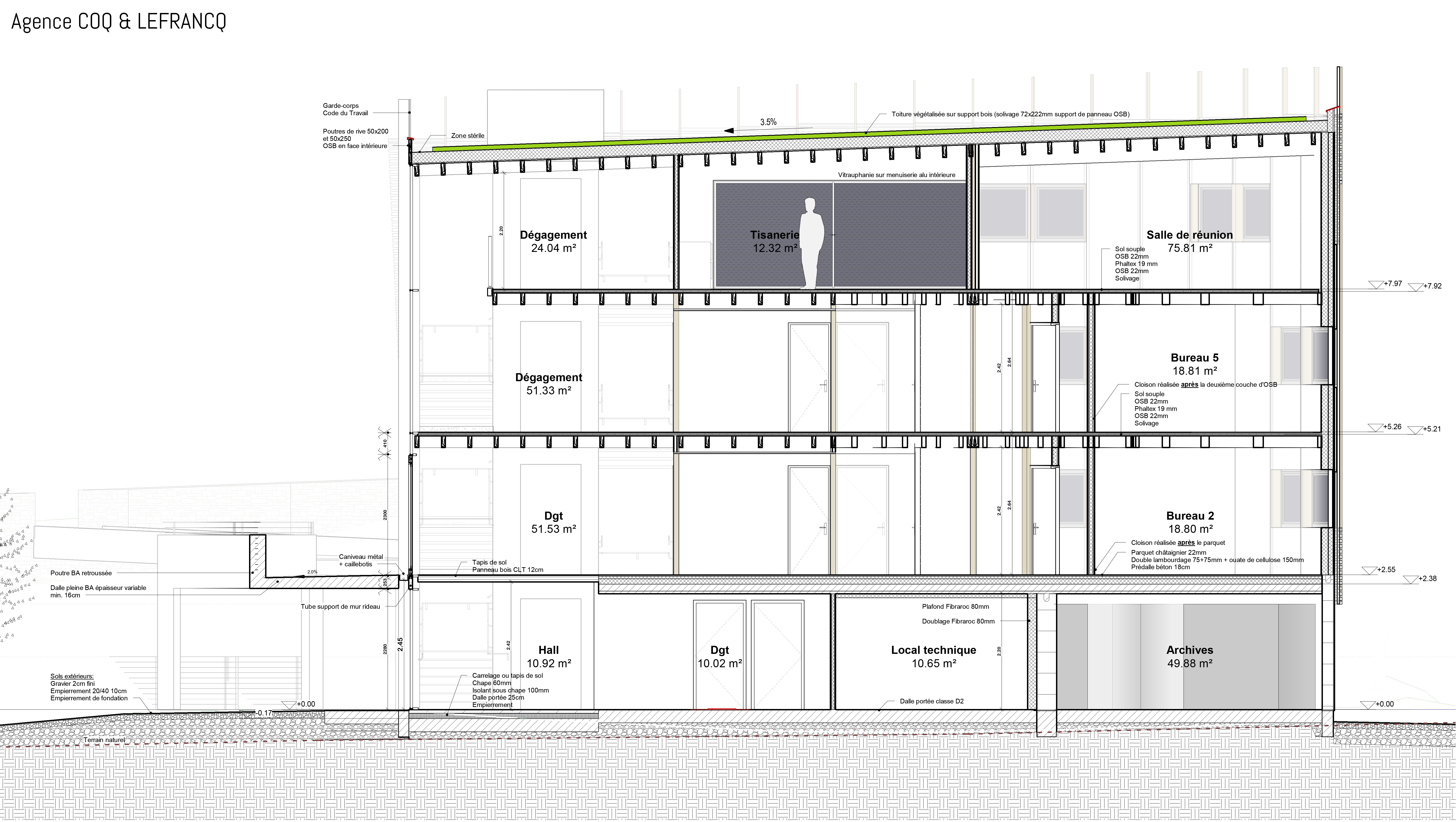Descriptif technique : Le socle maçonné du rez-de-chaussée accueille les locaux techniques et archives (coupe-feu, acoustique loi de masse). Les trois autres niveaux sont construits en poteaux/poutres bois et murs à ossature bois en façade. Des essences locales sont utilisées en sol (parquet châtaignier) et en doublages (peuplier). Le bois est utilisé jusque dans les menuiseries extérieures (chêne/aluminium) et le mobilier en chêne : bureaux des collaborateurs et de direction, banques d’accueil, salle de réunion, étagères pour dossiers suspendus.