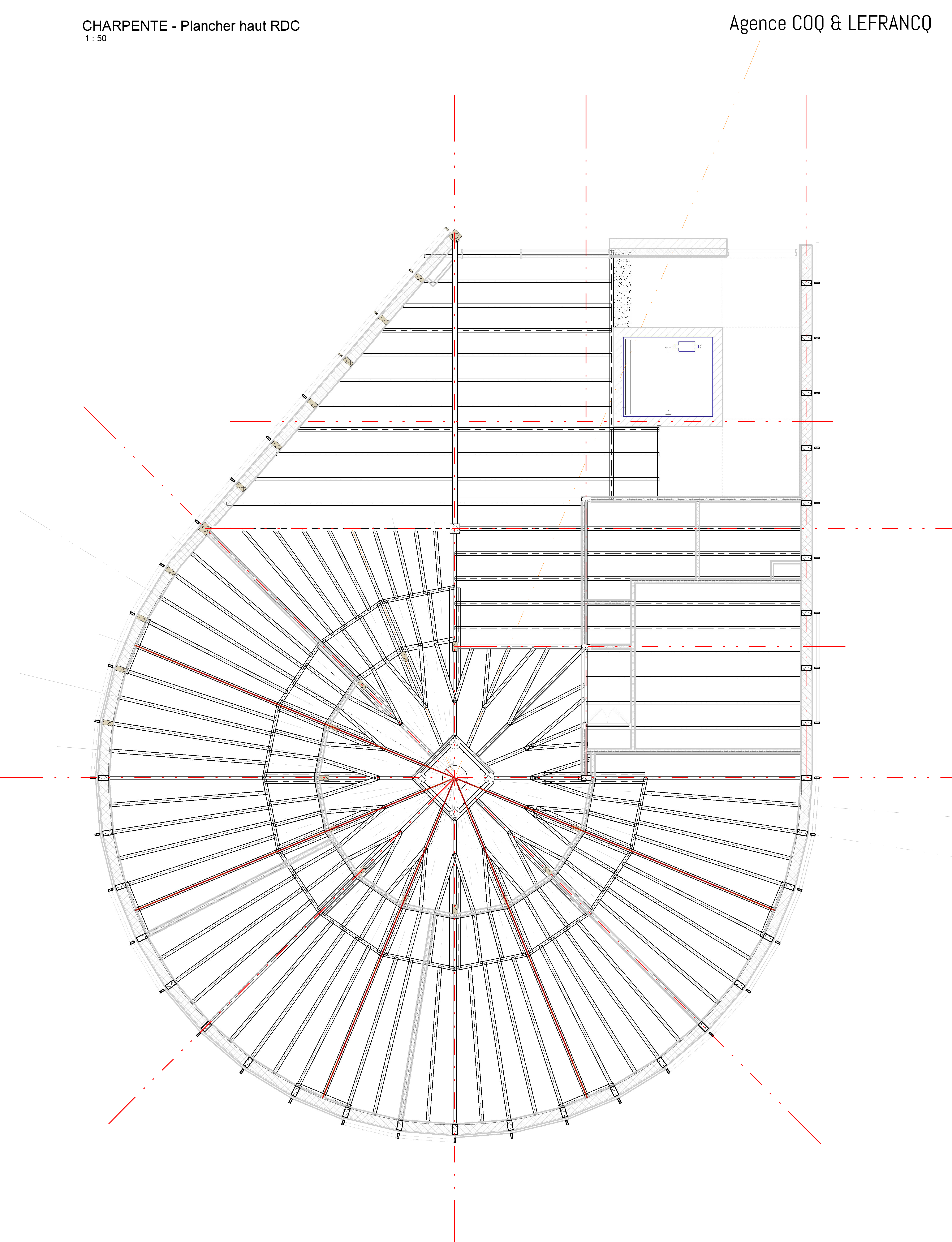 Un Maître d'Ouvrage volontariste + un site contraignant = un projet atypique. Le délaissé d’un giratoire donnait une surface constructible limitée. Il fallait alors développer le programme sur 4 niveaux pour loger les surfaces requises, l’occasion de faire signal à l’entrée de ville. L’emprise du bâtiment ainsi définie façonne un objet à la géométrie singulière, de bois vêtu. A l’intérieur, la volonté d’usage intensif du bois se traduit par une structure de plancher rayonnant et de poteaux, qui rendent bien lisibles l’organisation spatiale.