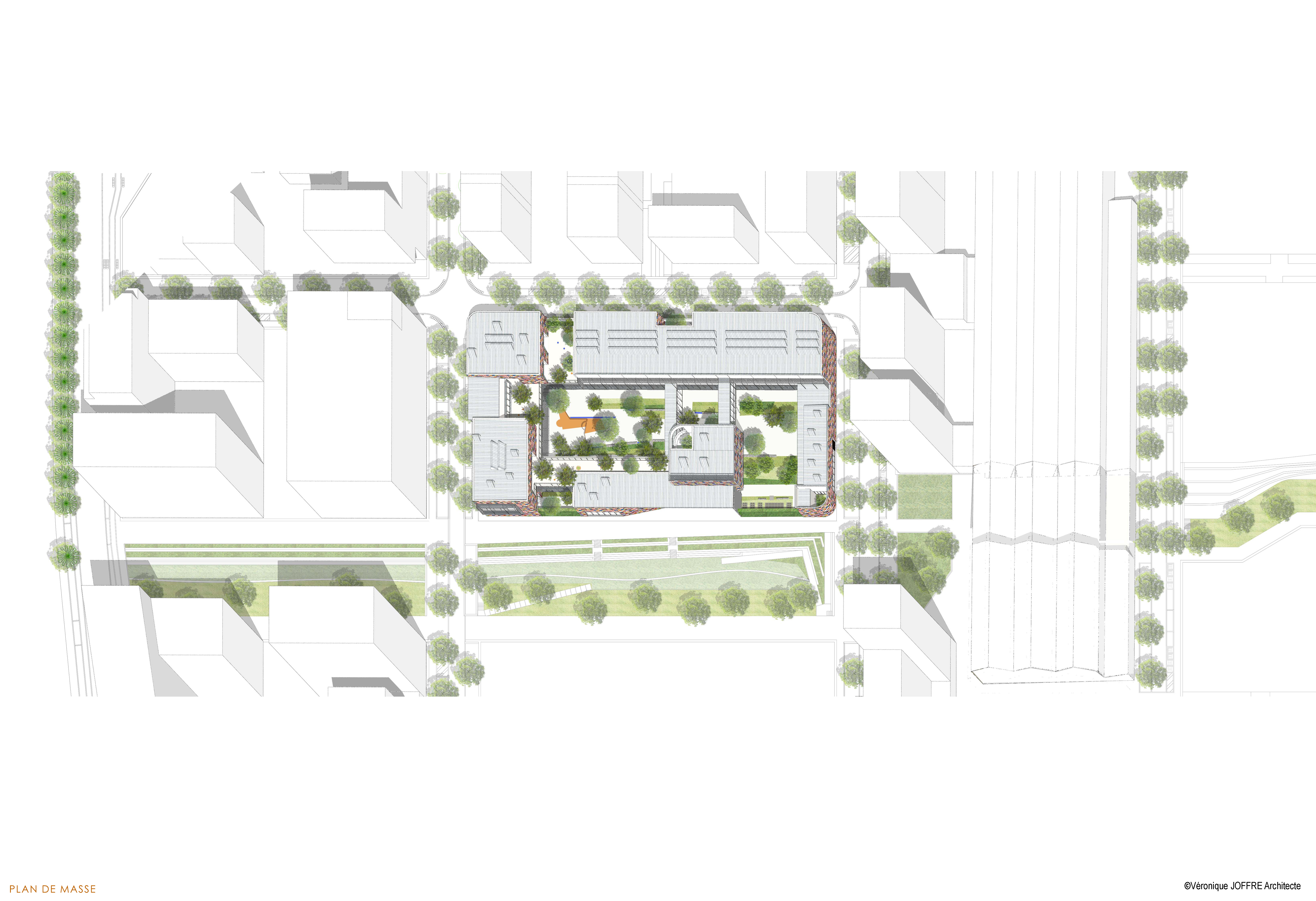 A l'alignement sur la rue alternent bâti, cours et terrasses plantées : un contexte de biodiversité, d’ambiance saisonnière. La texture de l'enveloppe installe une qualité propre à l'édifice, la métrique est donnée par la matière : la vêture de terre cuite, en référence à celle qui fonde la culture de cette région où alterne terres naturelles et émaillés. A l'intérieur le bois naturel en plafond et pour le mobilier, la lumière naturelle multiple en façade et zénithale accompagne les enfants dans des lieux à l’atmosphère apaisée autant pour l'apprentissage que pour la recréation de l’attention