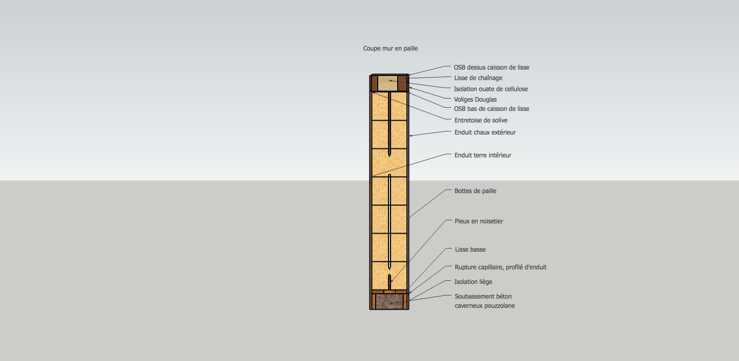 Descriptif technique : Les murs en paille porteuse d'une résistance thermique de 7 reposent sur des fondations en béton et un soubassement en béton caverneux de pouzzolane isolé en périphérie intérieur et extérieur par 5 cm de liège extrudé. Une rupture capillaire protège les lisses basses qui supportent les bottes. La paille est précontrainte avant la pose de la charpente par des sangles qui liaisonnent la lisse basse au caisson de lisse haute. Tout le solivage est monté à 2,70 mètres sur étais avant le remplissage paille afin de protéger le chantier des intempéries. Il est redescendu dès que les murs sont alignés, afin de participer à la compression. Les pré-cadres de portes coulissent dans les lisses afin de permettre la compression des murs. Cette compression est anticipée en début de chantier par le calcul du module d'élasticité des bottes, et des descentes de charge du bâtiment. Tous les pieds de poteaux qui soutiennent les sommiers, ainsi que les ossatures de la serre sont réglables, de manière à accompagner la compression des botes. L'étage est réalisé en voutes Philibert Delorme en chevrons contre-cloués de 2 planches Douglas 30*220mm, isolées en ouate de cellulose avec une finition intérieure en bardage peuplier. La couverture en bardeaux de mélèze sciés débordent de 50 cm des façades faisant office de pare soleil. Les enduits extérieurs chaux, et intérieurs terre, apportent une part de l'inertie thermique et le contreventement des murs paille. Ce contreventement est renforcé par les liens du poteau poutre intérieur qui soutient les sommiers du solivage d'étage dans le plan Est Ouest, et par la jonction des arches Philibert au décrochement des deux parties. Les finitions intérieures sont des enduits naturels en terre plâtre, terre chaux, stucs chaux. Le sol du rez de chaussée est une dalle ciment finition béton ciré. Une serre ossature bois et châssis fixes est intégrée au bâtiment en façade Sud.