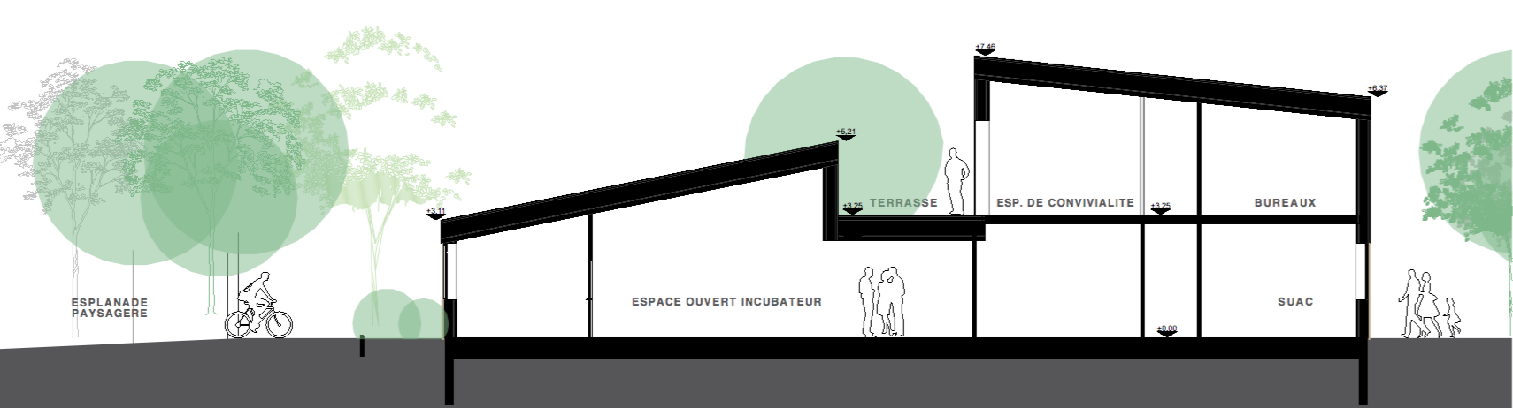 Approche environnementale : Conception bioclimatique : les façades sont conçues et orientées de façon à maximiser les apports solaires en hiver et de réduire les surchauffes en été. Le bâtiment est compact, limitant les déperditions thermiques. La structure bois et la distribution des fluides permettent de modifier le cloisonnement. L’eau de pluie est récupérée dans des noues paysagères. Le réseau de chaleur urbain possède déjà 63 % d’énergie renouvelable. En complément, des panneaux photovoltaïques sont installés.