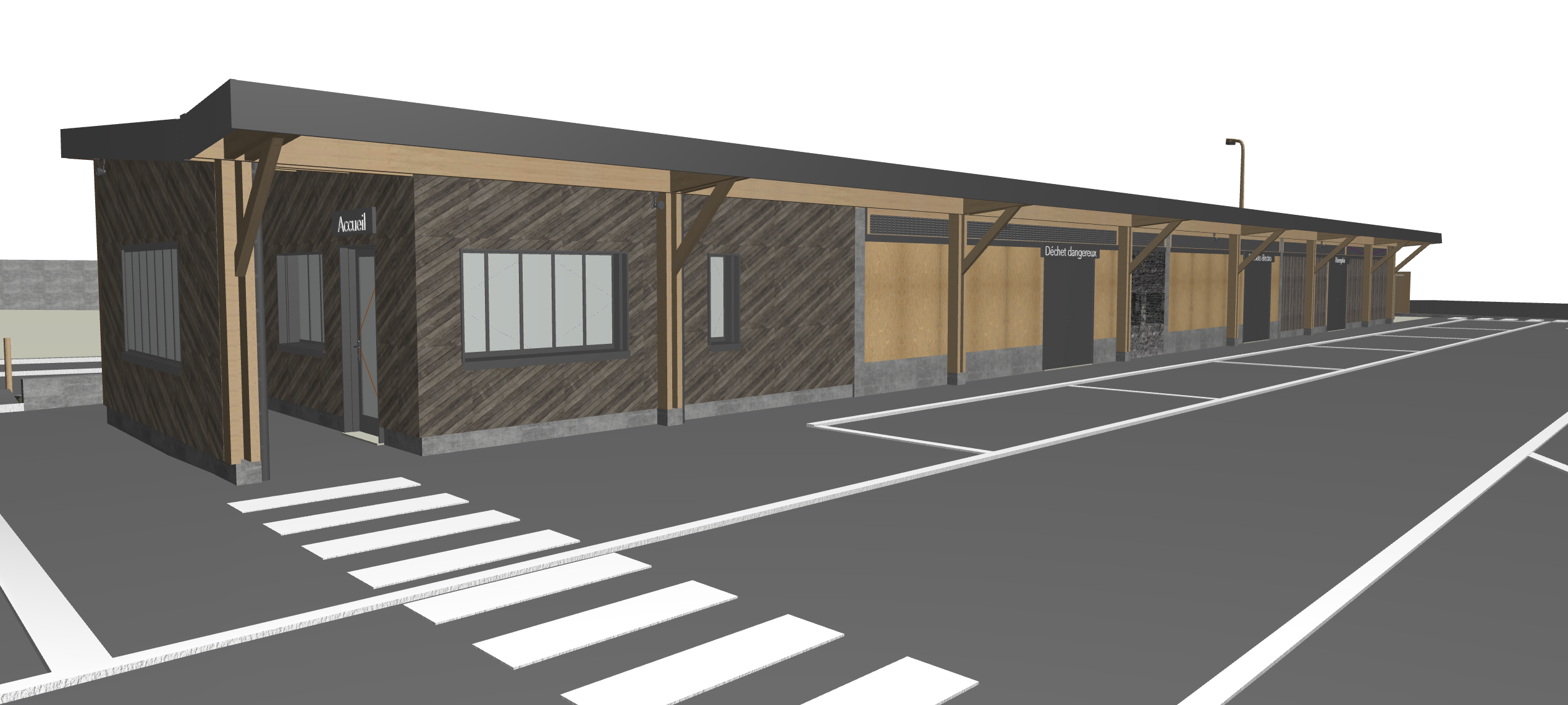 La forme est simple, un rectangle de plein pied, une charpente bois, avec une toiture en bac acier; un local gardien en ossature bois et bardage bois isolé RT 2012, un local déchet dangereux et déchet électroménager en béton habillé avec un enduit chaux teinté à la terre à l'est et à l'ouest un mur en terre bauge avec carrée en chêne massif. Enfin un local réemploi en ossature bois et bardage bois non isolé. La ventilation des locaux non isolés est prévue grâce à un système en haut des murs sur les façades est/ouest avec des caillebotis en acier galva laissant l'air passer librement.