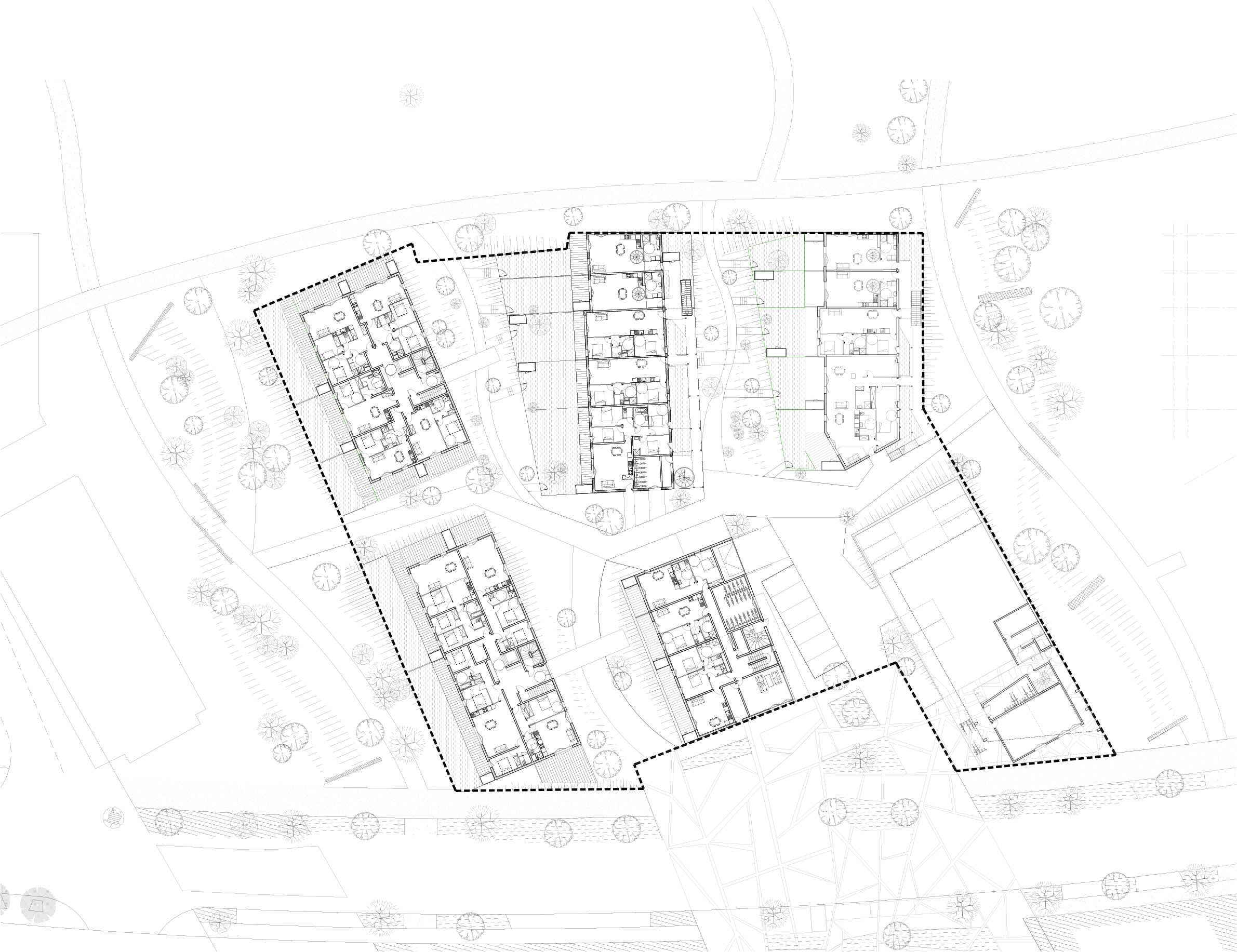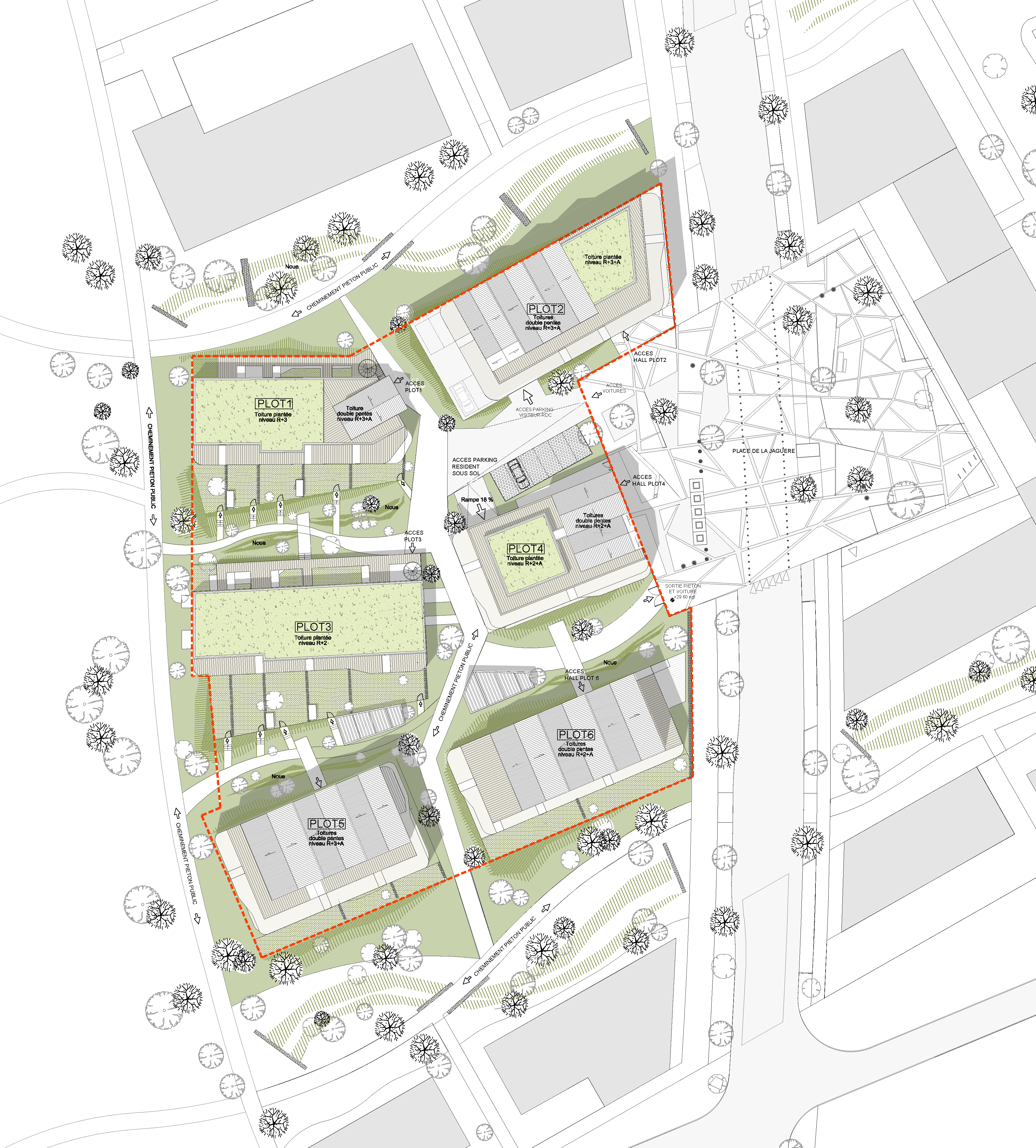 Concilier « densité » et « parc en infiltration » : Une parcelle hameau. L’îlot 5 est un espace de transition, tant dans sa géographie, la topographie du lieu que dans son rôle dans le paysage. Sa localisation dans le paysage rural rezéen et les nouvelles zones urbanisées lui offre un rôle majeur dans l’insertion du projet urbain dans le grand paysage. C’est une parcelle-hameau à travers laquelle on passe de l’urbain au grand paysage par les notions de vie de quartier, de jardins privatifs, de sentes piétonnes, d’espaces communs.