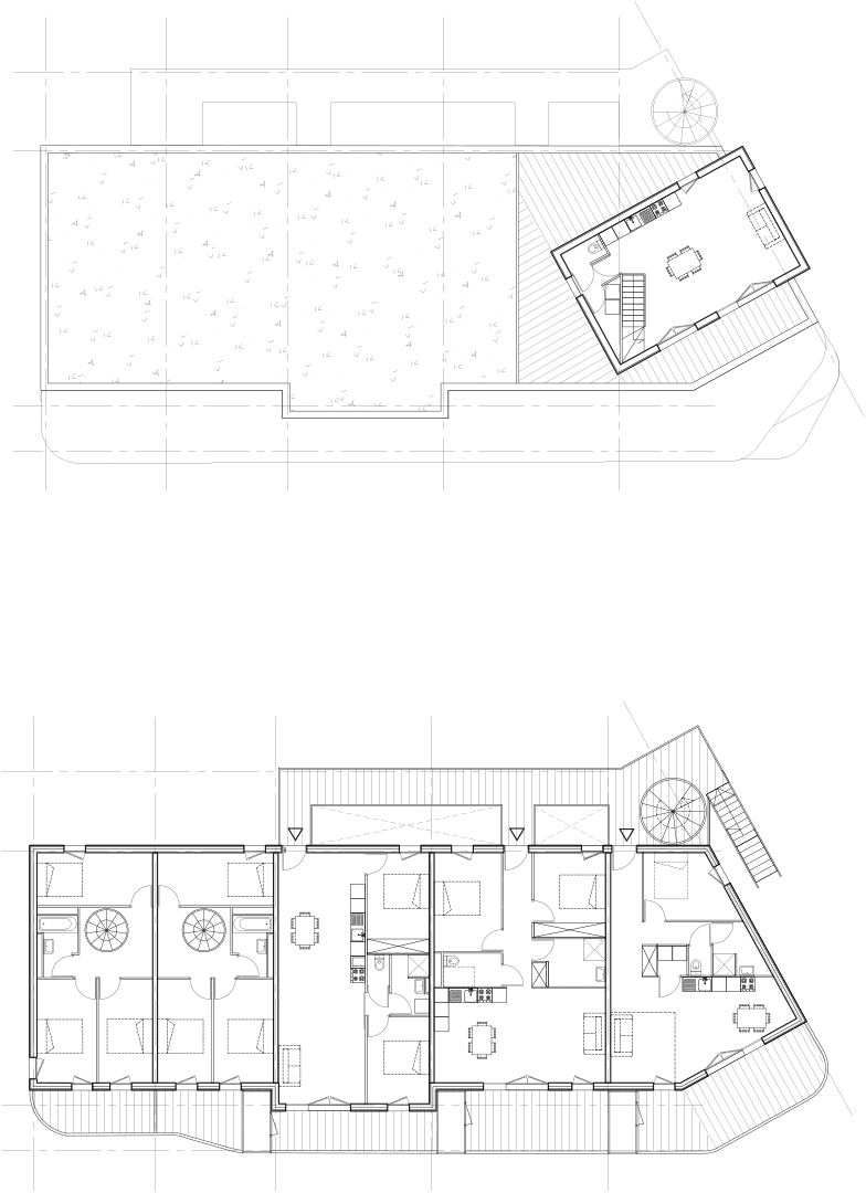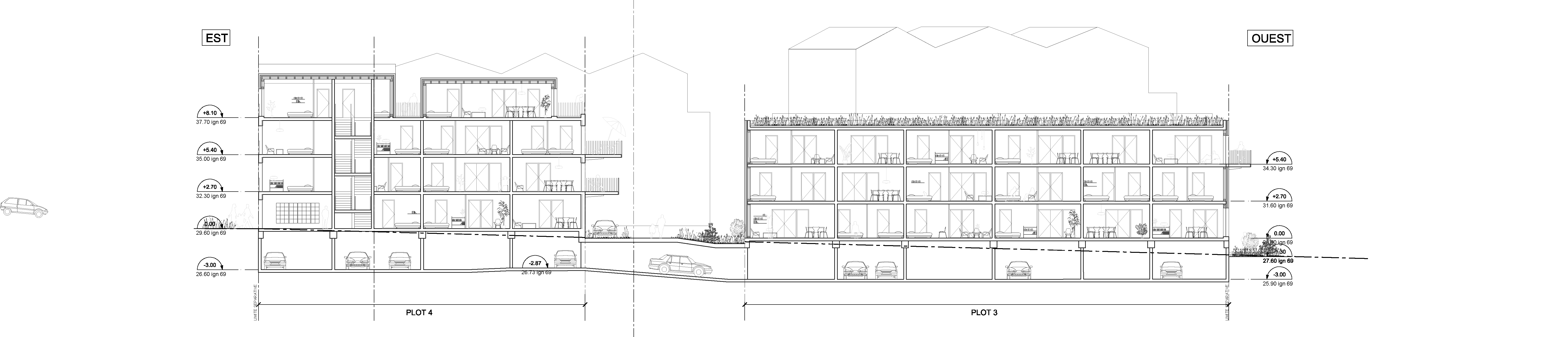Descriptif technique : Construction mixte bois béton : dalles et refends béton, FOB filant bois en mur manteaux Isolation dans l'ossature Attique en charpente bois et "maisons sur le toit" en bardage douglas naturel purgé d'aubier Bardage douglas naturel classe 3 Coursives mixte bois/béton par procédé AIA (plancher collaborant sur poutres bois) PEFC (Gestion forestière durable) FSC (Gestion forestière responsable) CTB A Traitement des bois en oeuvre NF Vantaux de portes planes NF Ameublement NF Logement Habitat et Environnement