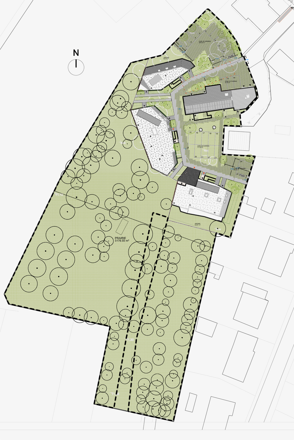 Approche environnementale : Le projet privilégie une haute approche environnementale et sociale, par une conception bioclimatique "tout bois", maximisant l'emploi de matériaux biosourcés et géosourcés, une isolation performante (R moyen des parois périphériques = 8), une étanchéité à l’air maitrisée (résultat essai Q4 entre 0.3 et 0.4), permettant d’atteindre les niveaux équivalents E+3/C-2, et équivalent label biosourcé niveau 3 (>36kg/m2 SP).