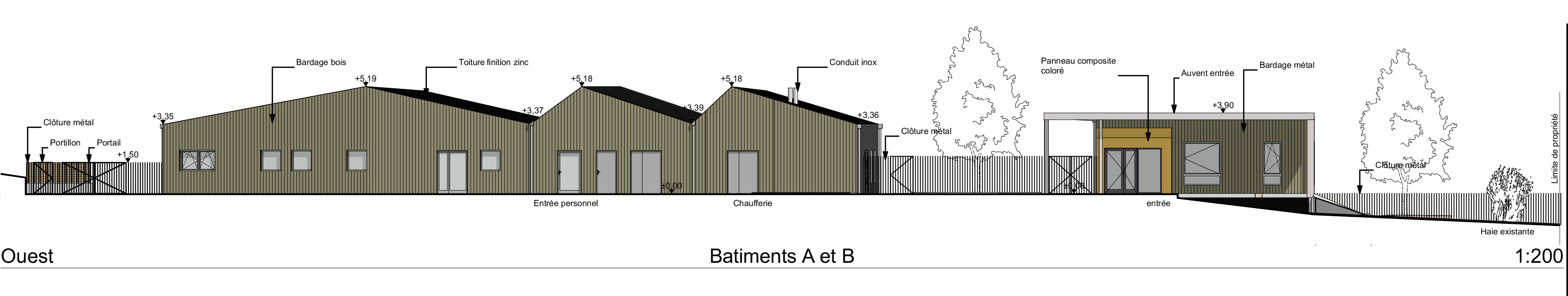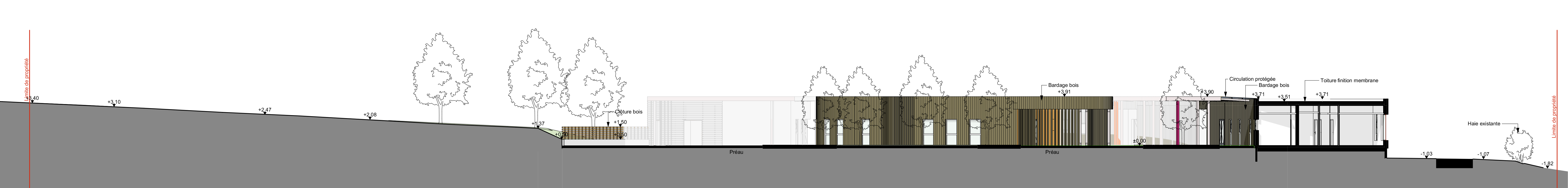 Approche environnementale : RT2012 démarche environnementale, conception bioclimatique // L’organisation générale du projet s’appuie sur l’ambition de répondre aux enjeux de la qualité d’orientation des façades. En effet, pour profiter de l’orientation « Sud », le projet propose d’orienter les espaces de vie communes et de certains espaces de travail vers le sud. Le projet est conçu de telle manière que chaque espace en fonction de son usage profite de la meilleure orientation. Les espaces extérieurs sont également une composante forte avec le développement de cour-jardin récréative, pédagogique, et d'espace sportif