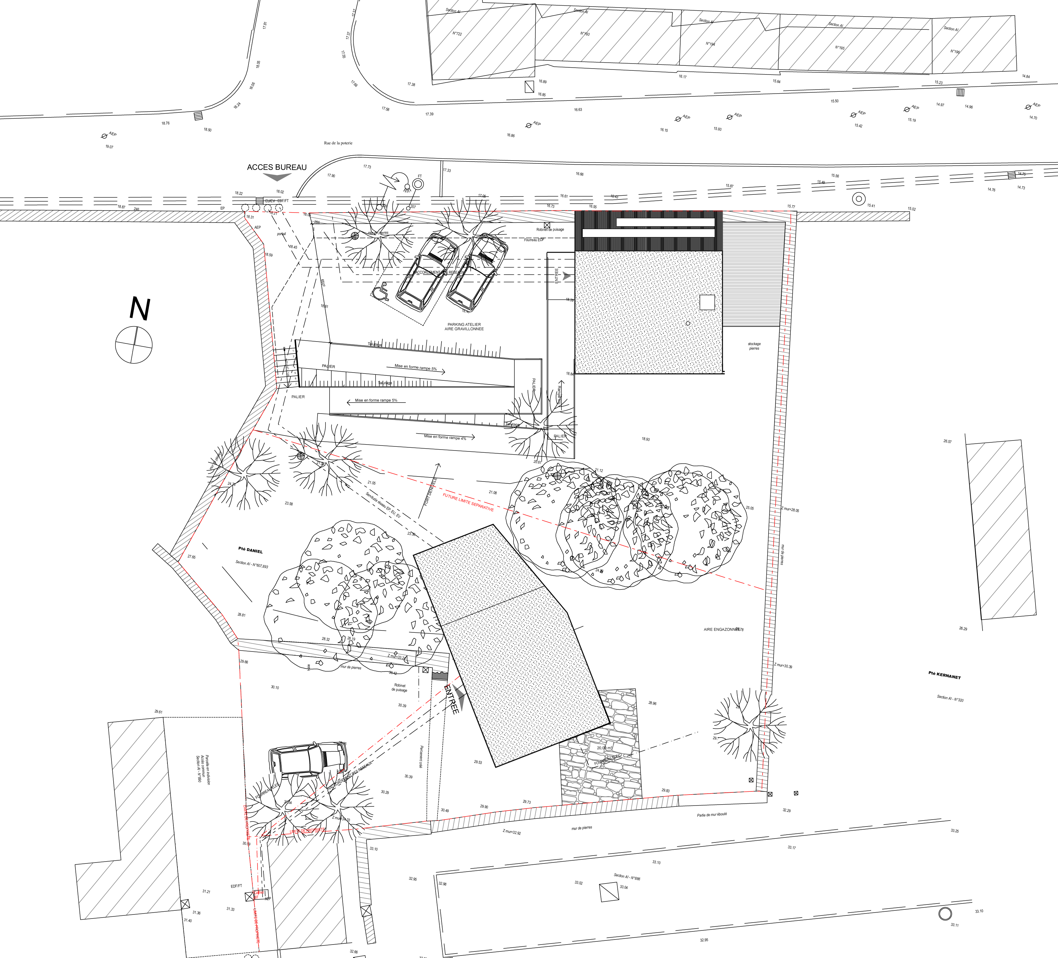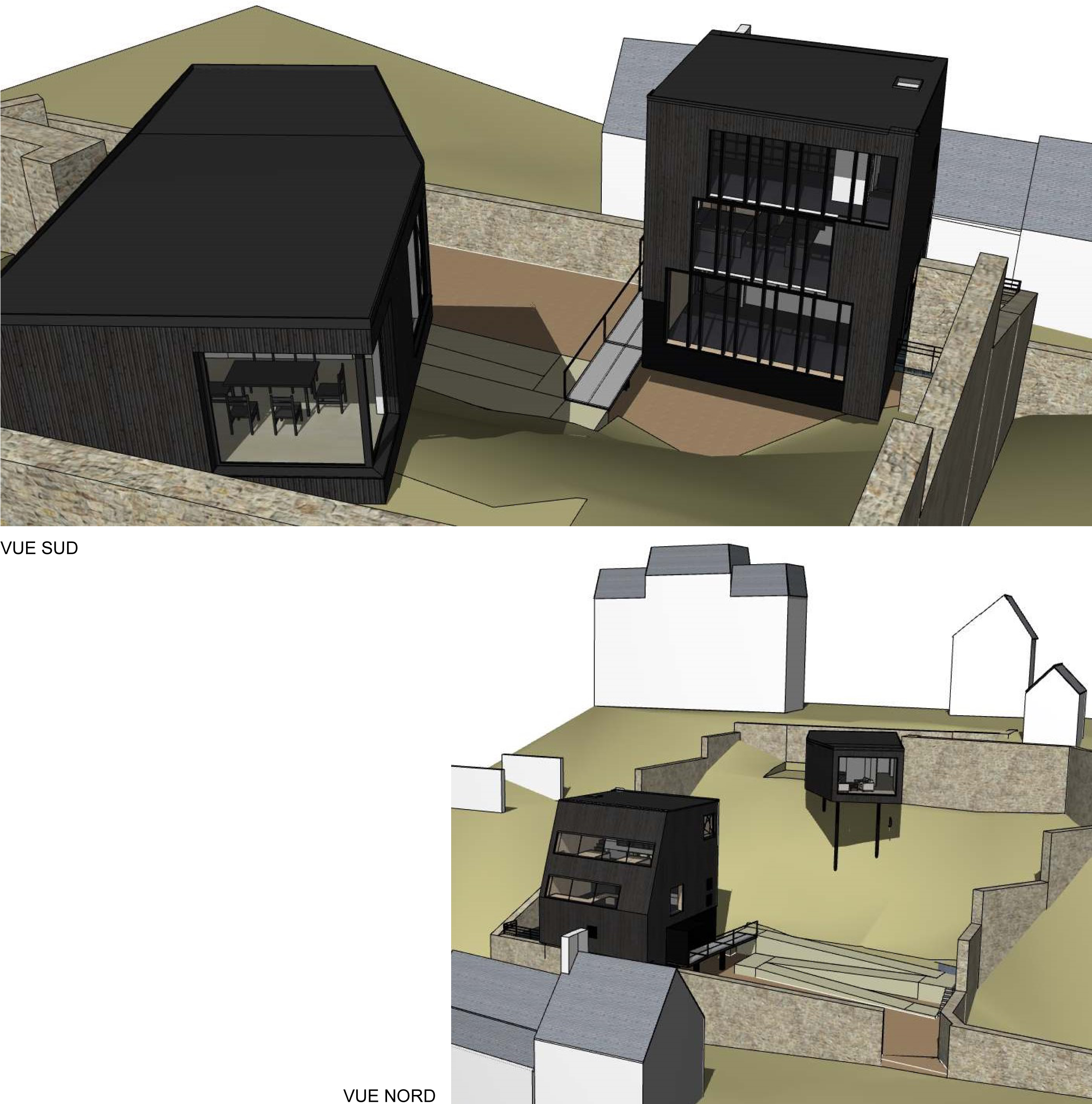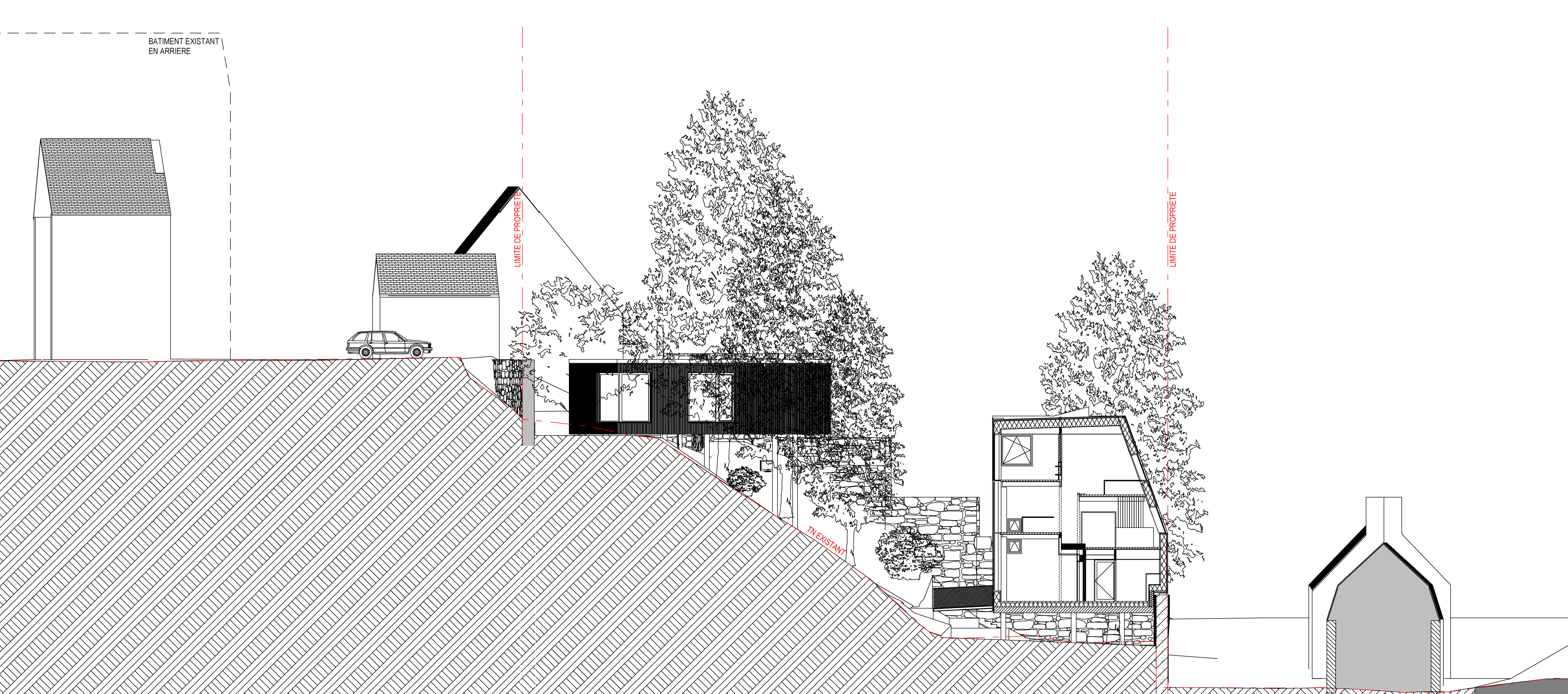 Notre atelier d’architecture et un studio de location-exposition s’installent dans un espace boisé en cœur de ville. Le terrain cerné de murs présente une déclivité de 15 m. Il s’ouvre sur la vallée, avec en ligne d’horizon les escaliers et l’église de Brélévenez. Dans ce site parfait pour une composition, nous avons recherché un équilibre entre l’atelier compact, qui s’élève comme une tour pour la lumière, et un studio effilé axé sur le panorama. Les volumes coupés s’insèrent dans le site, aidés par le bardage pigmenté noir. Des cadrages simples organisent les espaces intérieurs selon l’ensoleillement. Le studio plat dialogue avec l’atelier sur cinq niveaux décalés et ouverts.