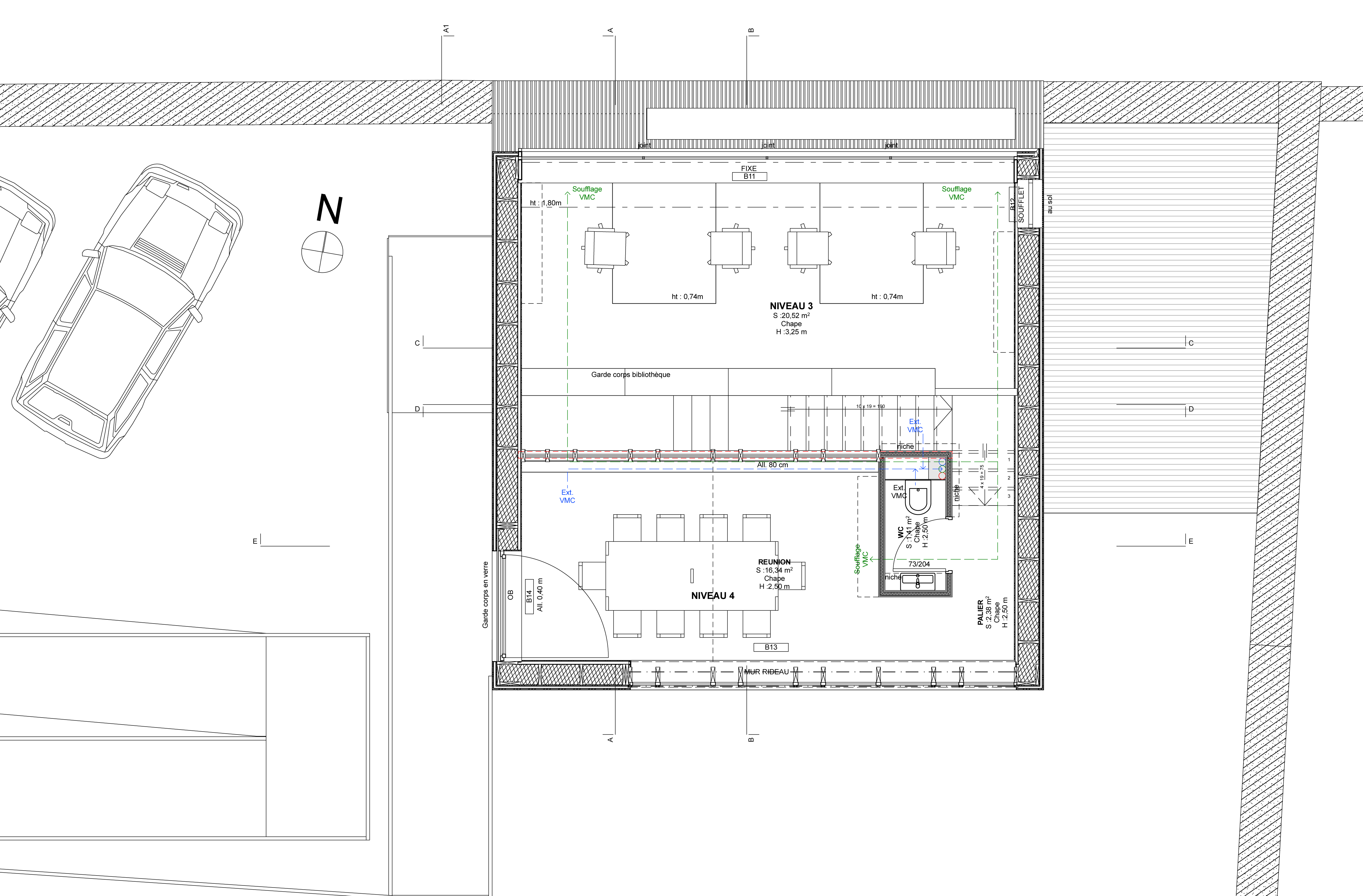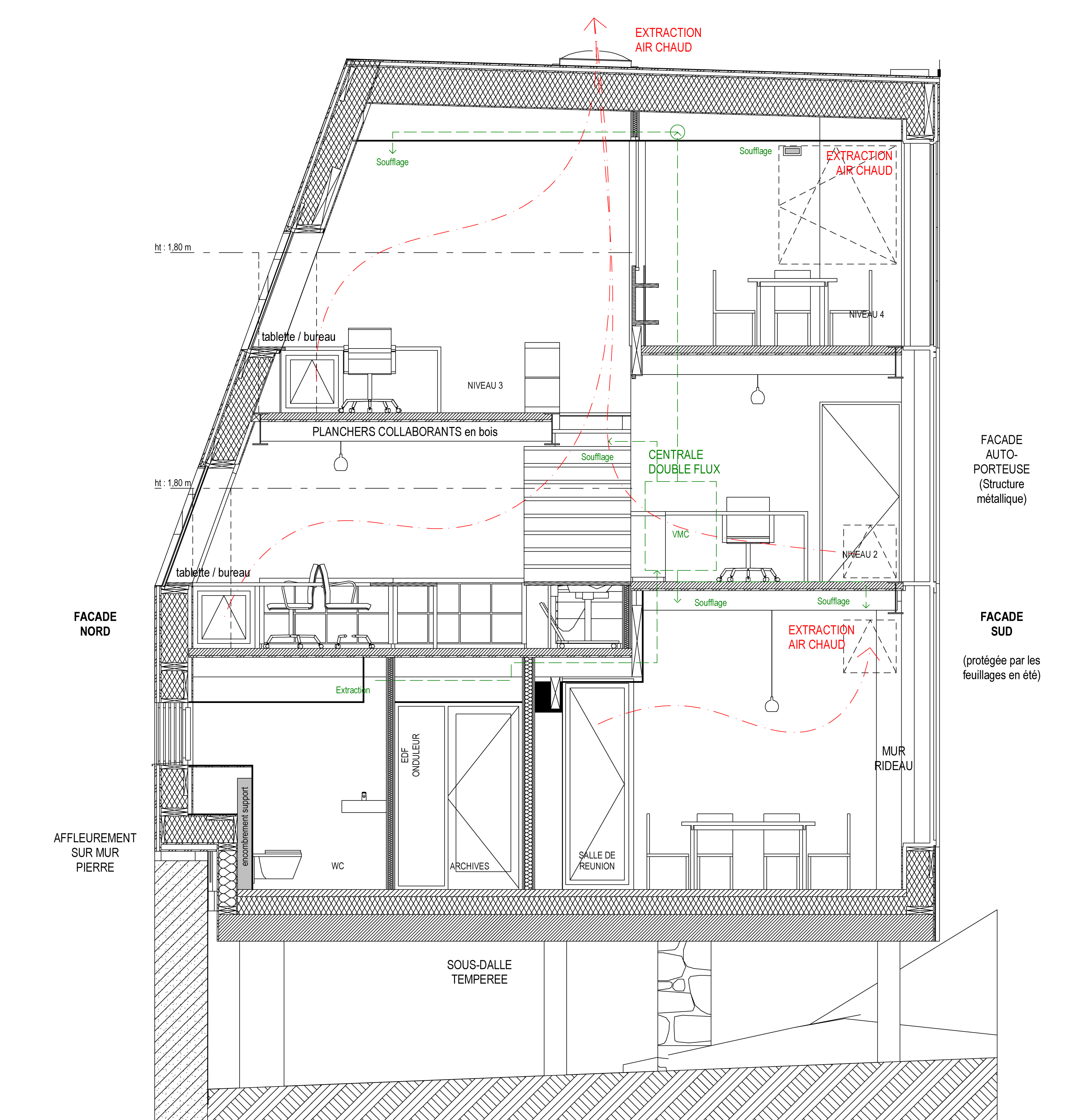Approche environnementale : L’approche environnementale est basée sur la compacité des bâtiments, l’orientation des vitrages en s’appuyant sur le masque des arbres, l’inertie recherchée à travers les planchers intermédiaires en béton quartzé, les menuiseries mixtes et murs rideaux en triple vitrage, la centrale double flux haut rendement, et les trois radiateurs électriques (2+1) nécessaires au chauffage. Le bâtiment est très proche du standard Passivhaus. La ventilation naturelle est traitée par des petites ventelles carrées dissimulées derrière le bardage, et dont l’exutoire se fait par un châssis de toit sur l’étanchéité en membrane caoutchouc. Les matériaux sont pour la plupart biosourcés. Test d'étanchéité à l'air Atelier : 0,08 (Q4) Test d'étanchéité à l'air Studio : 0,21 (Q4)