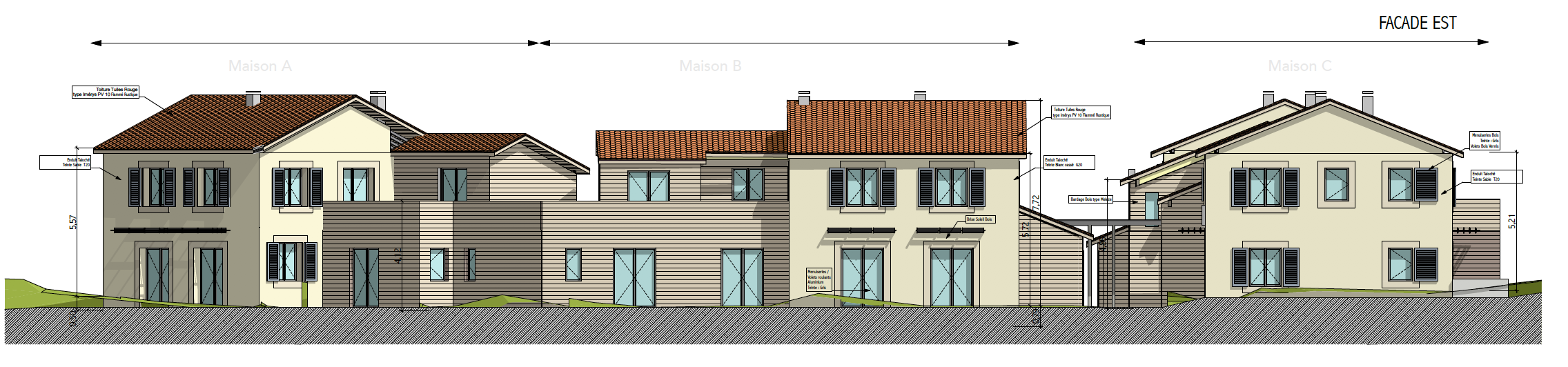 Descriptif technique : L'ensemble construit mixte 2 techniques constructives, les ossatures bois et la maçonnerie traditionnelle brique. Ce choix permet d'associer les plus values techniques de ces techniques constructives en limitant leurs faiblesses (performances thermiques, déphasages lents et inertie renforcée. Les maisons sont chauffées par les pompes à chaleur air/eau à hautes performances (diffusion par plancher chauffant) , la production de l'ECS est assurée par des ballons thermodynamiques. Les murs extérieurs sont isolés en ITE et ITI afin de limiter au maximum les ponts thermiques.