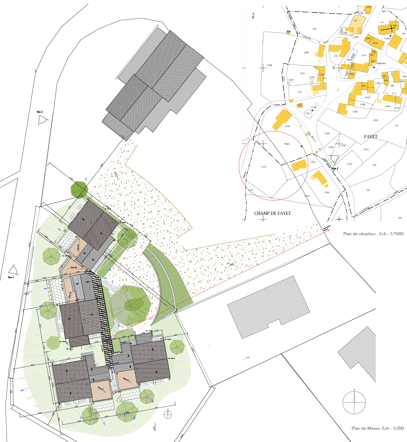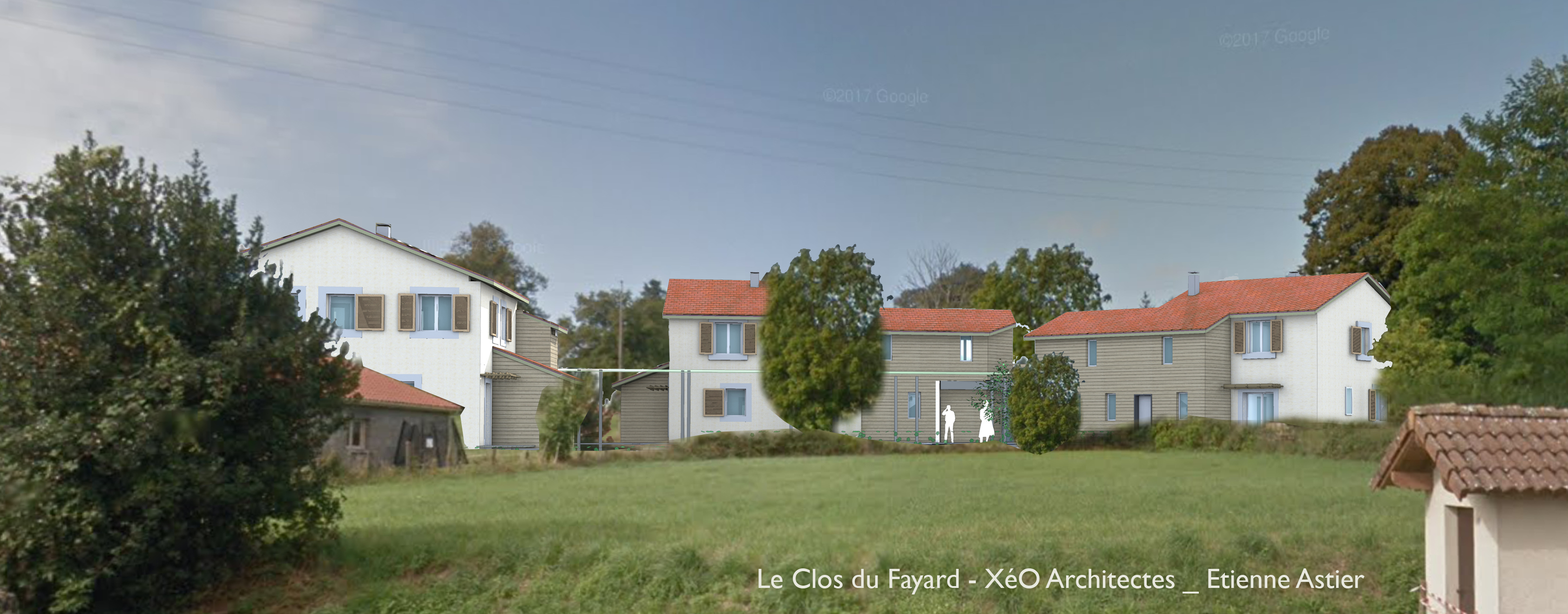 Le terrain de la construction est situé en limite Sud du Bourg de Fayet-le-Château dans le prolongement de la salle polyvalente réhabilitée en 2013. Les 4 maisons intergénérationnelles sont couplées, elles se développent autour de la place du Fayard. Les 2 premières maisons suivent les lignes initiées par la salle polyvalente, les 2 suivantes se retournent sur l'axe Est-Ouest marquant ainsi le front bâti Sud du bourg. Les maisons ré-interprètent l'architecture vernaculaire présente dans la commune en mêlant le bois et le minéral. Les jeux des volumes rythment l'ensemble construit