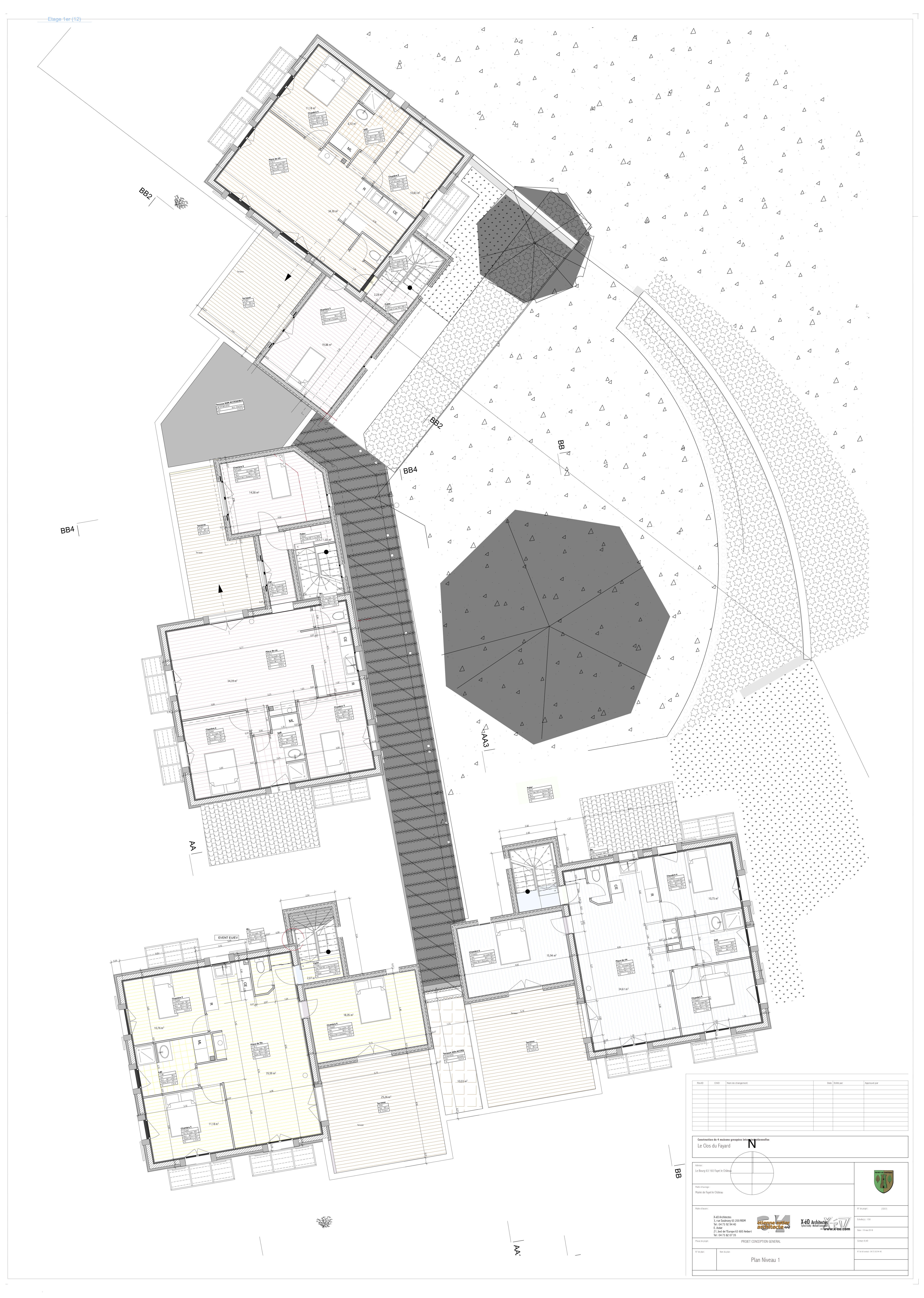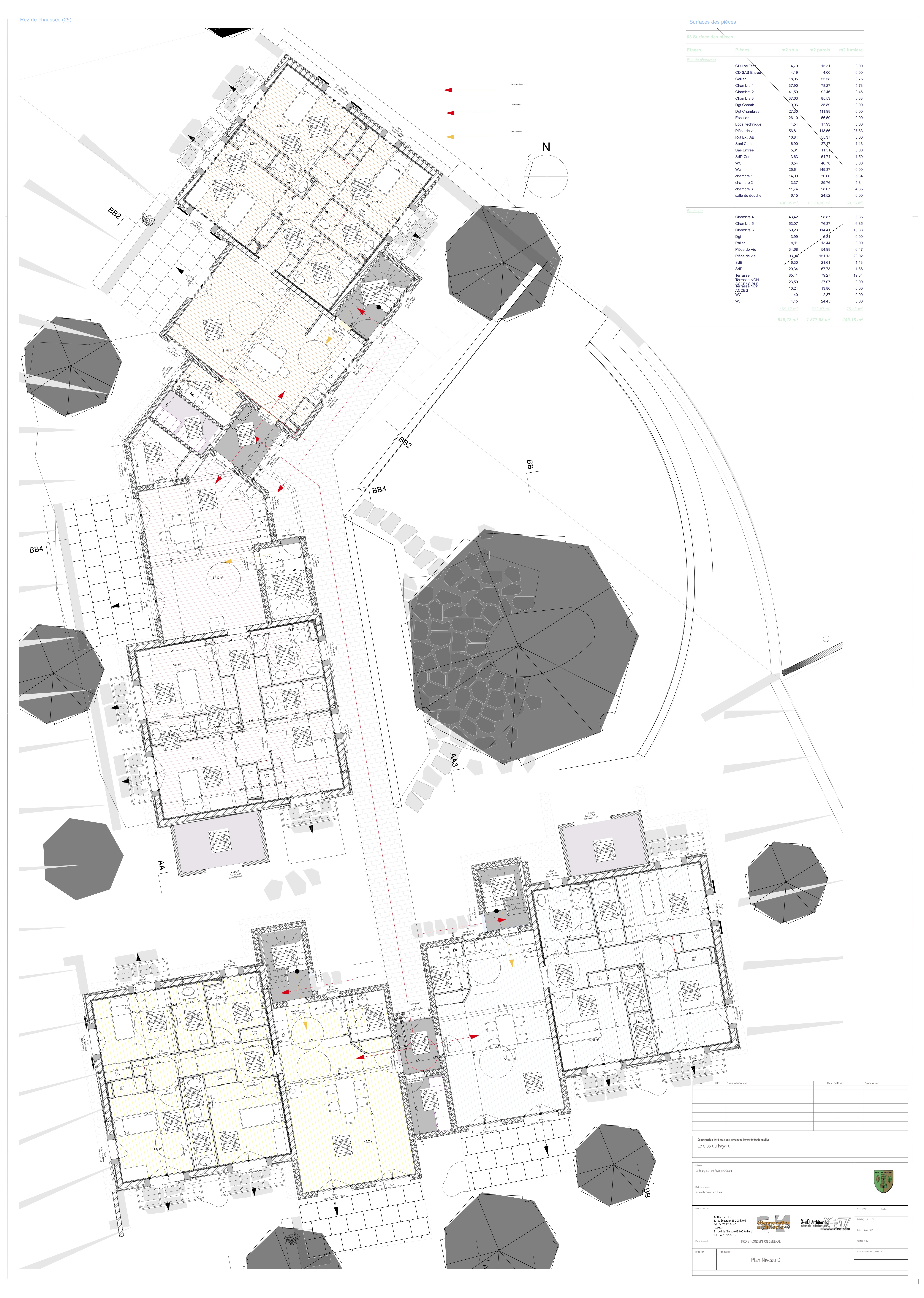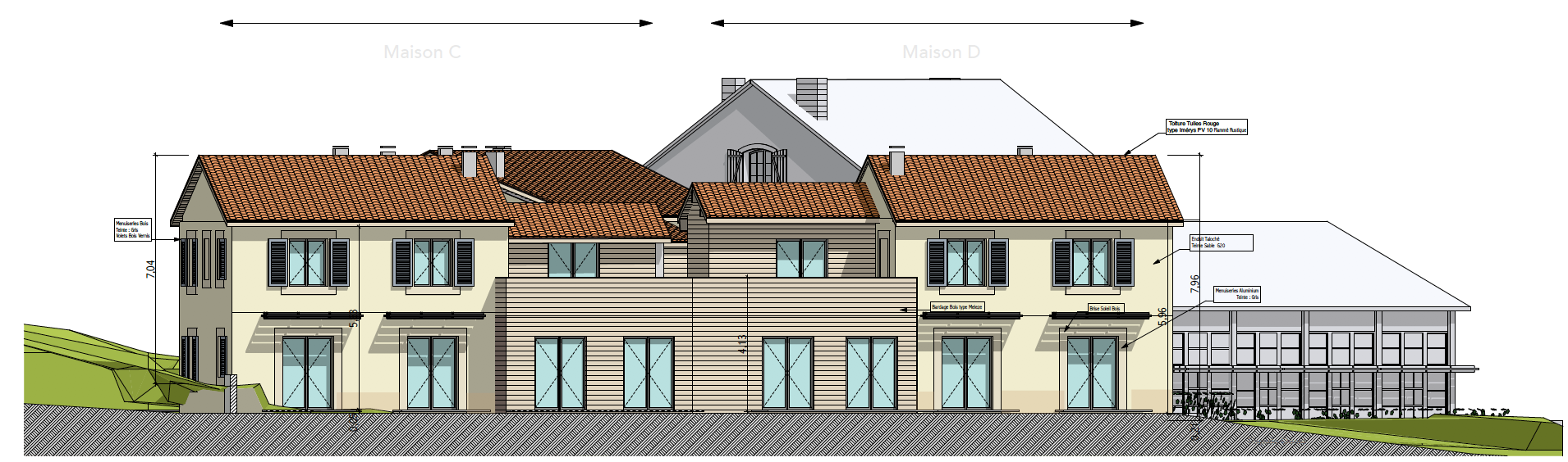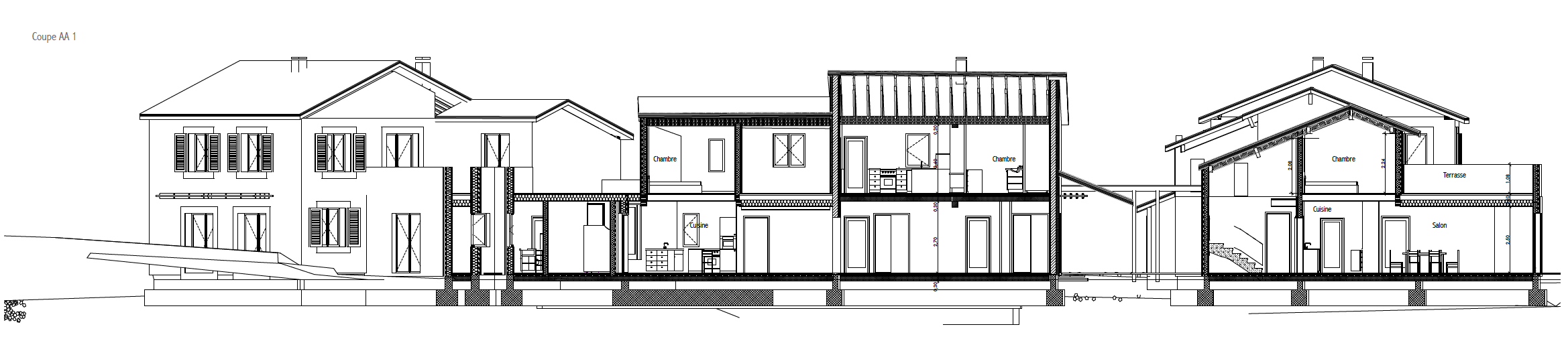 Descriptif technique : L'ensemble construit mixte 2 techniques constructives, les ossatures bois et la maçonnerie traditionnelle brique. Ce choix permet d'associer les plus values techniques de ces techniques constructives en limitant leurs faiblesses (performances thermiques, déphasages lents et inertie renforcée. Les maisons sont chauffées par les pompes à chaleur air/eau à hautes performances (diffusion par plancher chauffant) , la production de l'ECS est assurée par des ballons thermodynamiques. Les murs extérieurs sont isolés en ITE et ITI afin de limiter au maximum les ponts thermiques.