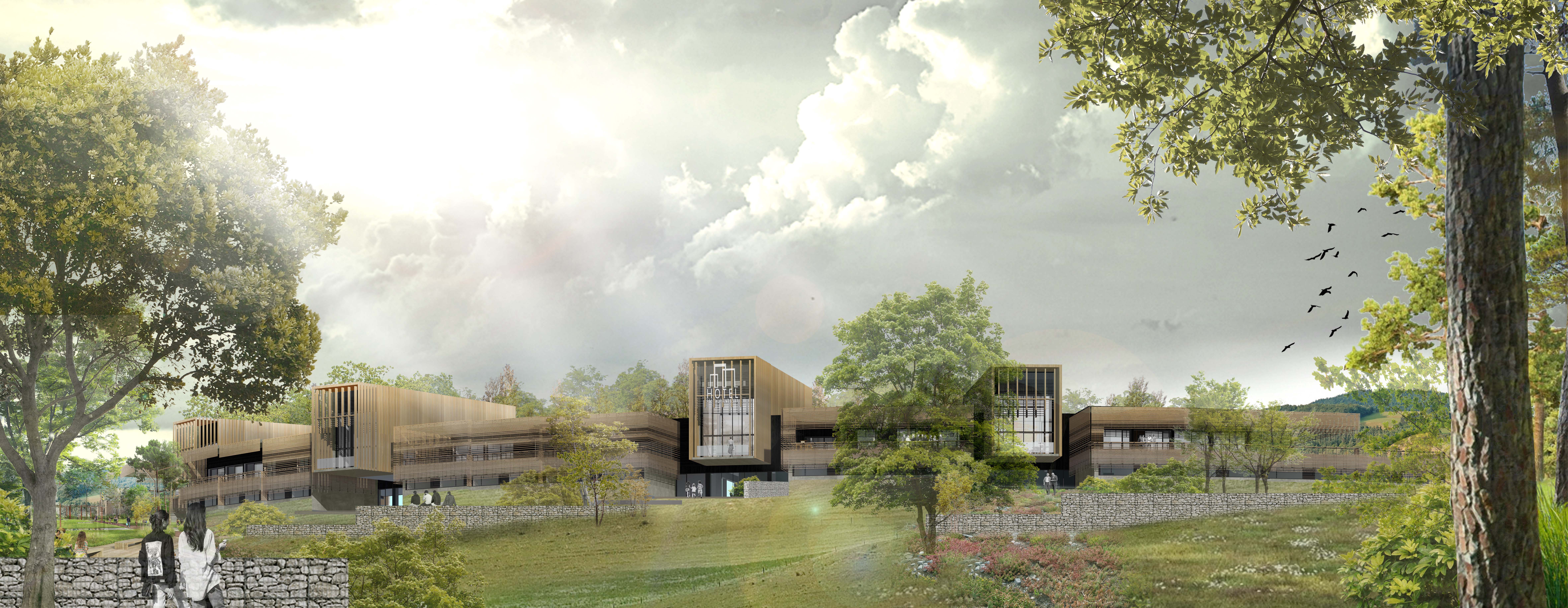 La présence d’un paysage naturel intact et puissant, influence notre parti architectural à s’attacher tout particulièrement à la mise en place d'une réponse forte en termes d’intégration paysagère. Le projet doit, dans ses rapports d’échelle et de matérialité, s’immerger dans le site et la nature, avec humilité et sobriété. L’intégration à la topographie nous conduit à insérer le projet le long des courbes de niveau et à s’encastrer en partie dans le sol. Nous souhaitons que chaque usager puisse être absorbé depuis n’importe quel endroit du projet, dans le paysage et la nature environnante. L’architecture reste contextuelle dans sa matérialité, exprimant ainsi son lien au patrimoine local.