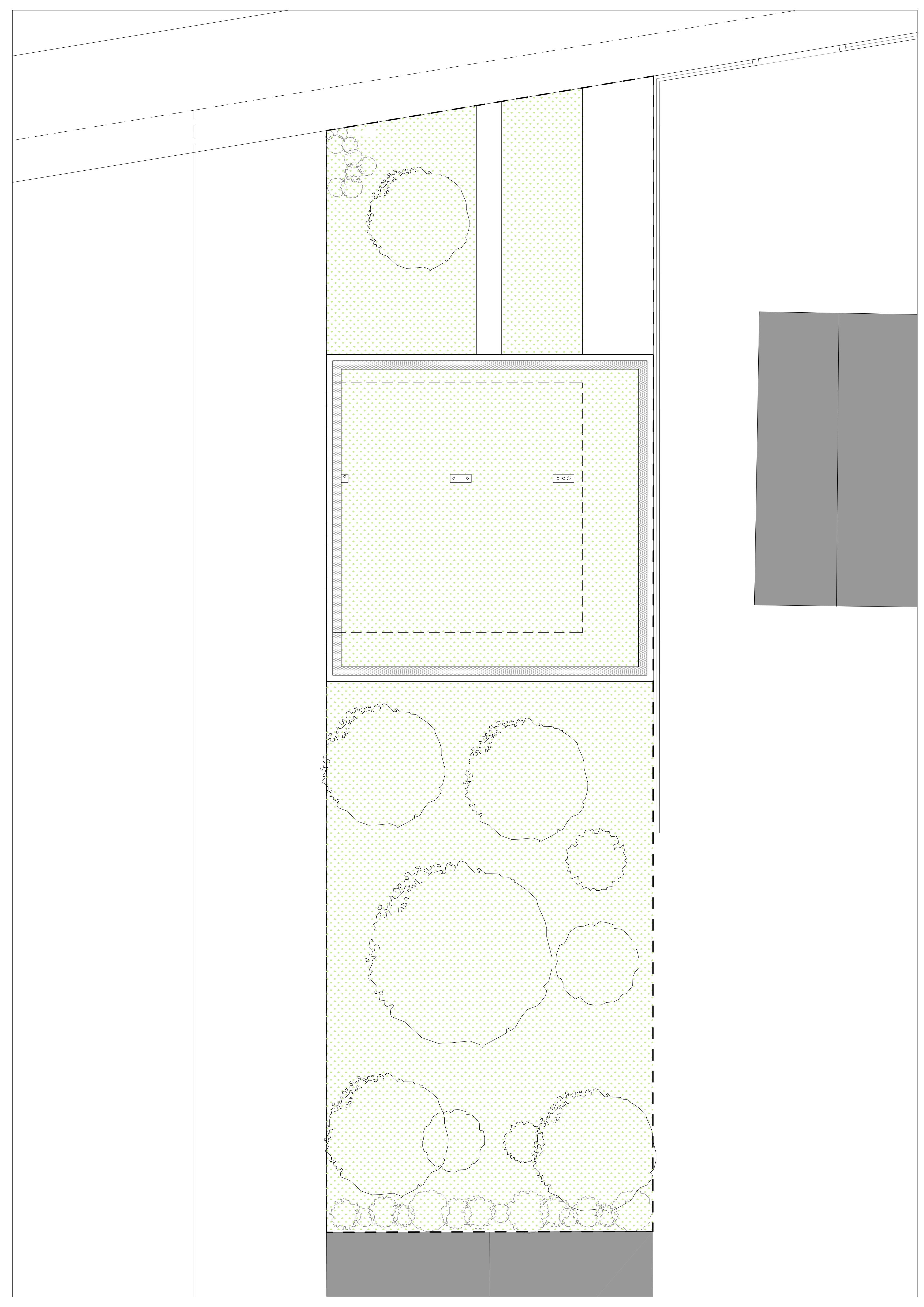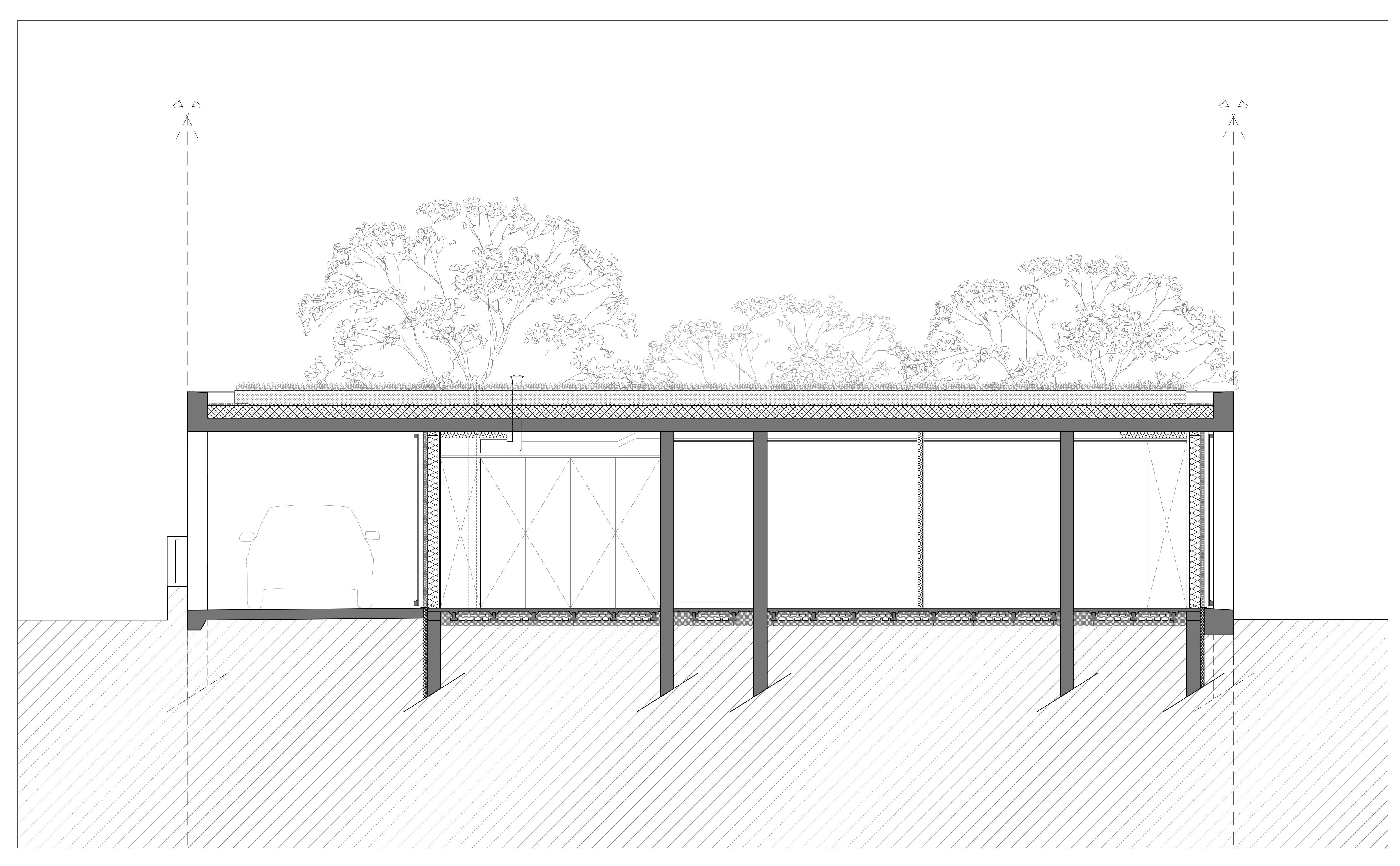 Descriptif technique : Les murs ossatures bois sont utilisés ici de manière non structurelle, pour délimiter l'habitation sous cette canopée minérale. Composés de montants en épicéa vosgien, d'isolants bio-sourcés (laine de bois souple entre montants et fibres de bois en extérieur) et d'un bardage en bois de mélèze non traité, leur traitement extérieur avec des encadrements en tasseaux mélèze rappelle les modénatures des séchoirs à tabac locaux. Un isolant en fibres de bois est installé en toiture-terrasse permettant un déphasage important en été. La toiture est végétalisée de manière intensive. PEFC (Gestion forestière durable) FSC (Gestion forestière responsable) CTB A Traitement des bois en oeuvre