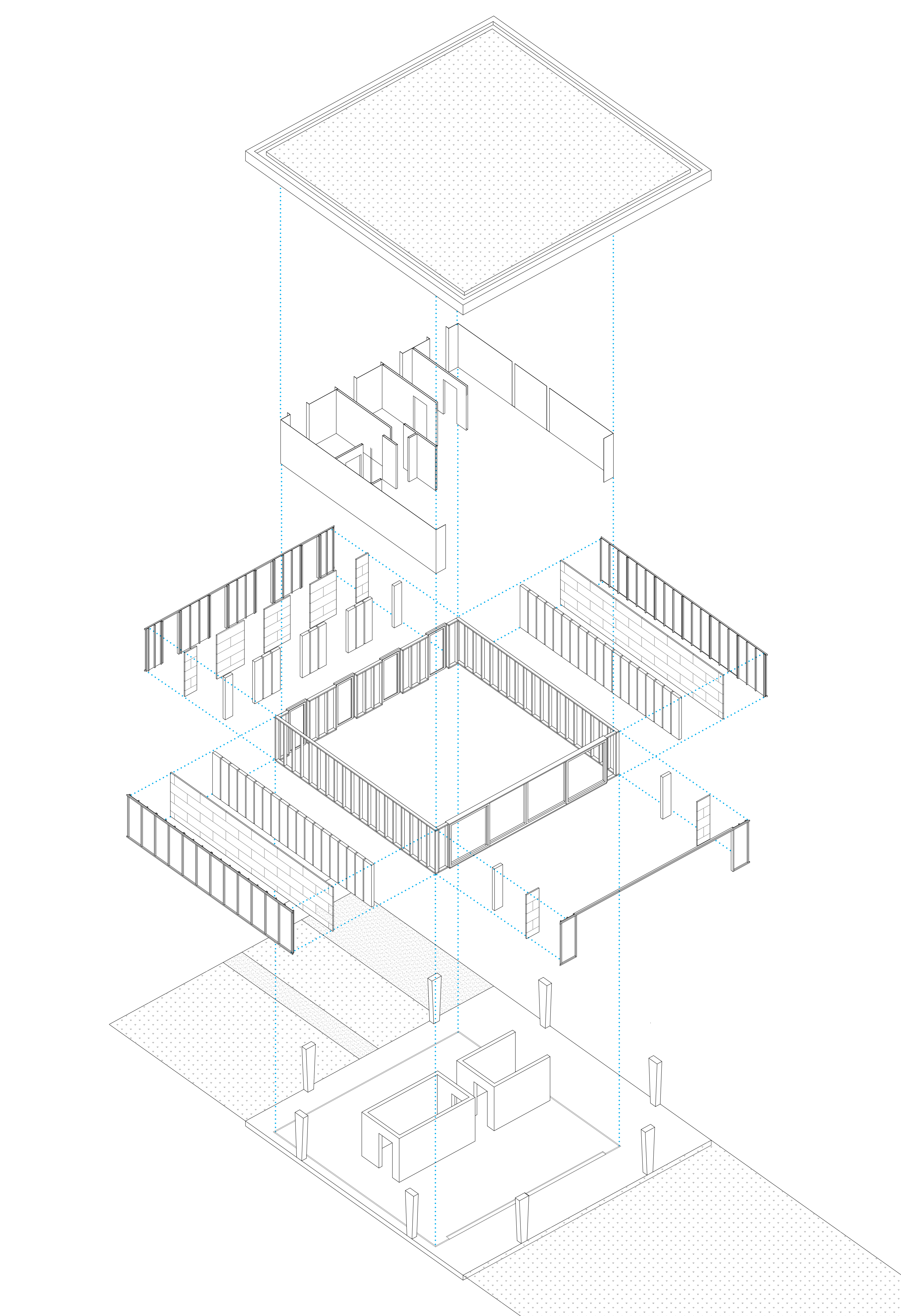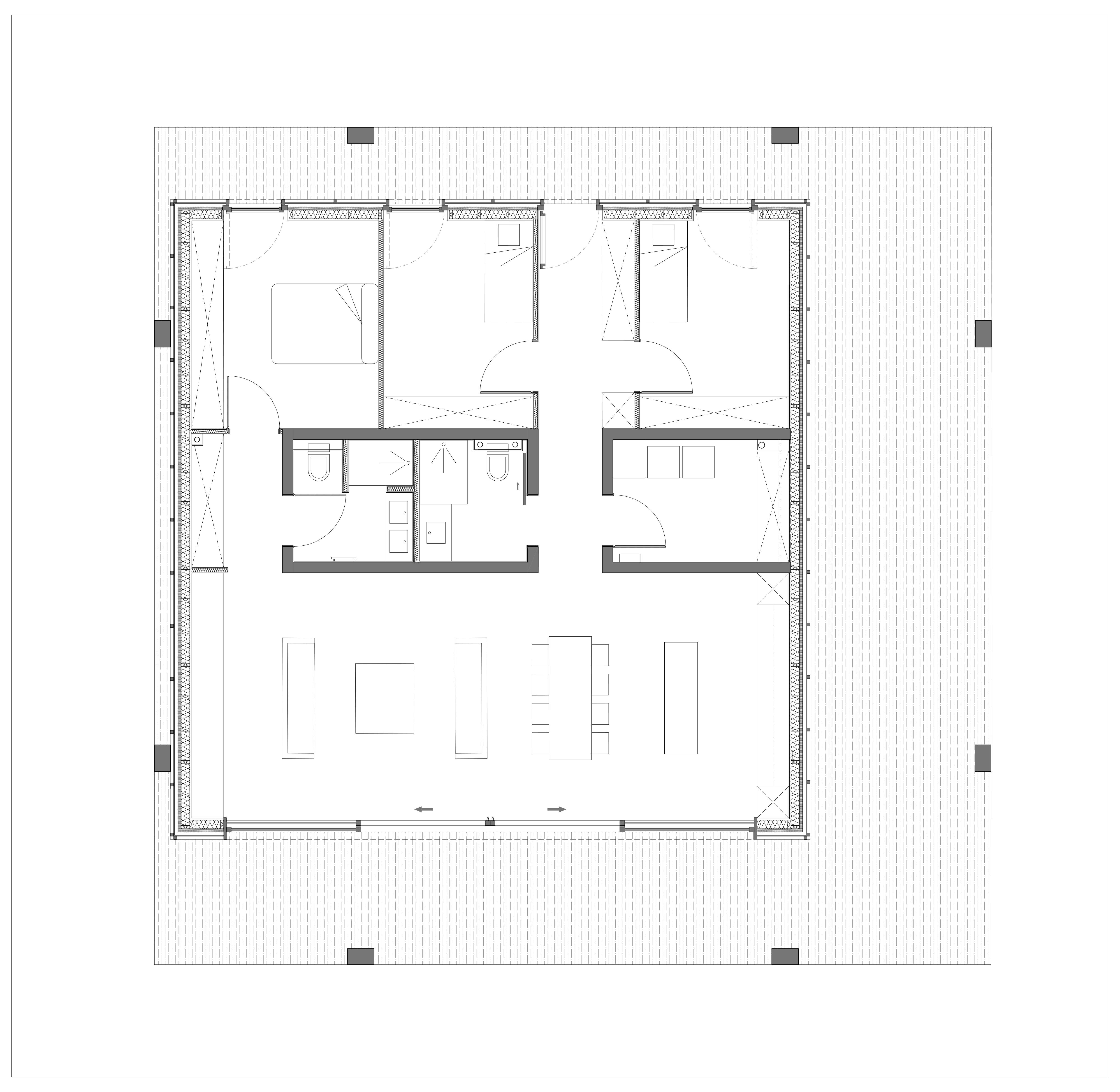 La vaste structure en béton soutenue par 8 porteurs périphériques et 2 noyaux centraux réinterprète l’esthétique et l’ingéniosité structurelle messienne, dans une variation minérale, baroque et champêtre, à l’image d’Ebersheim. Un volume en bois se glisse sous cette canopée quasi archaïque et apporte une matérialité chaleureuse et contextuelle sur ce terrain entre champs et vergers. Les larges baies coulissantes en bois permettent d'effacer aux beaux jours la limite intérieur-extérieur et de profiter de l'orientation et des vues vers le sud-ouest et le Haut-Koenigsbourg veillant au loin.