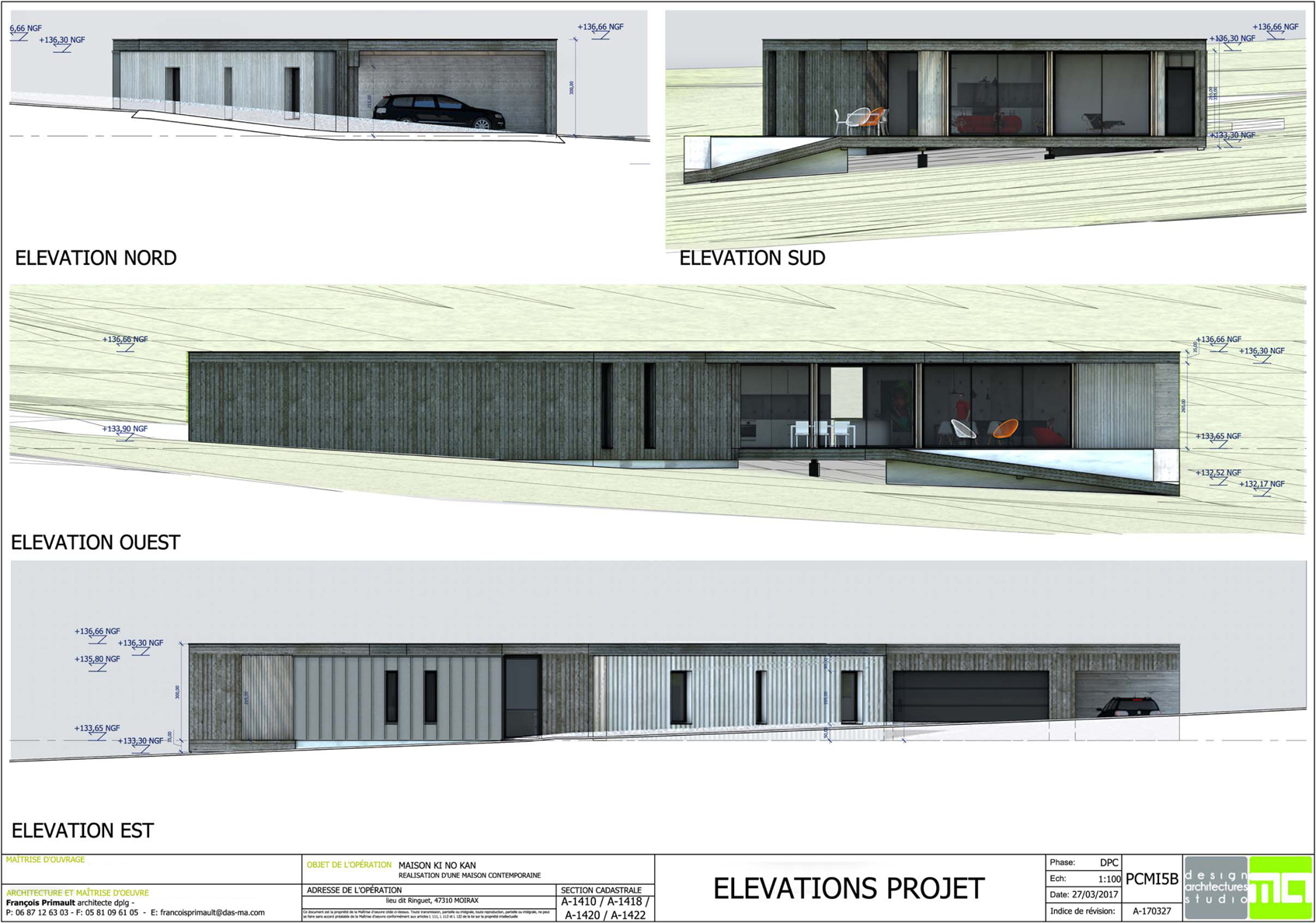 Descriptif technique : Fidèle à ma pratique et ma conception de l'architecture, j'ai voulu un projet offrant à la fois, par des matérialités brutes, de l'inertie enveloppé dans une construction en ossature bois performante en isolation et aux murs bois. Pour être dans la totale allégorie de l'entropie des matériaux naturelle, les bardages extérieures alternent entre Zinc Quartz, Mélèze laissé naturel et grisant avec le temps, et un bardage en bois (du douglas) brulé, remise au goût du jour d'une ancestrale technique japonaise permettant de conférer une protection naturelle au bois.