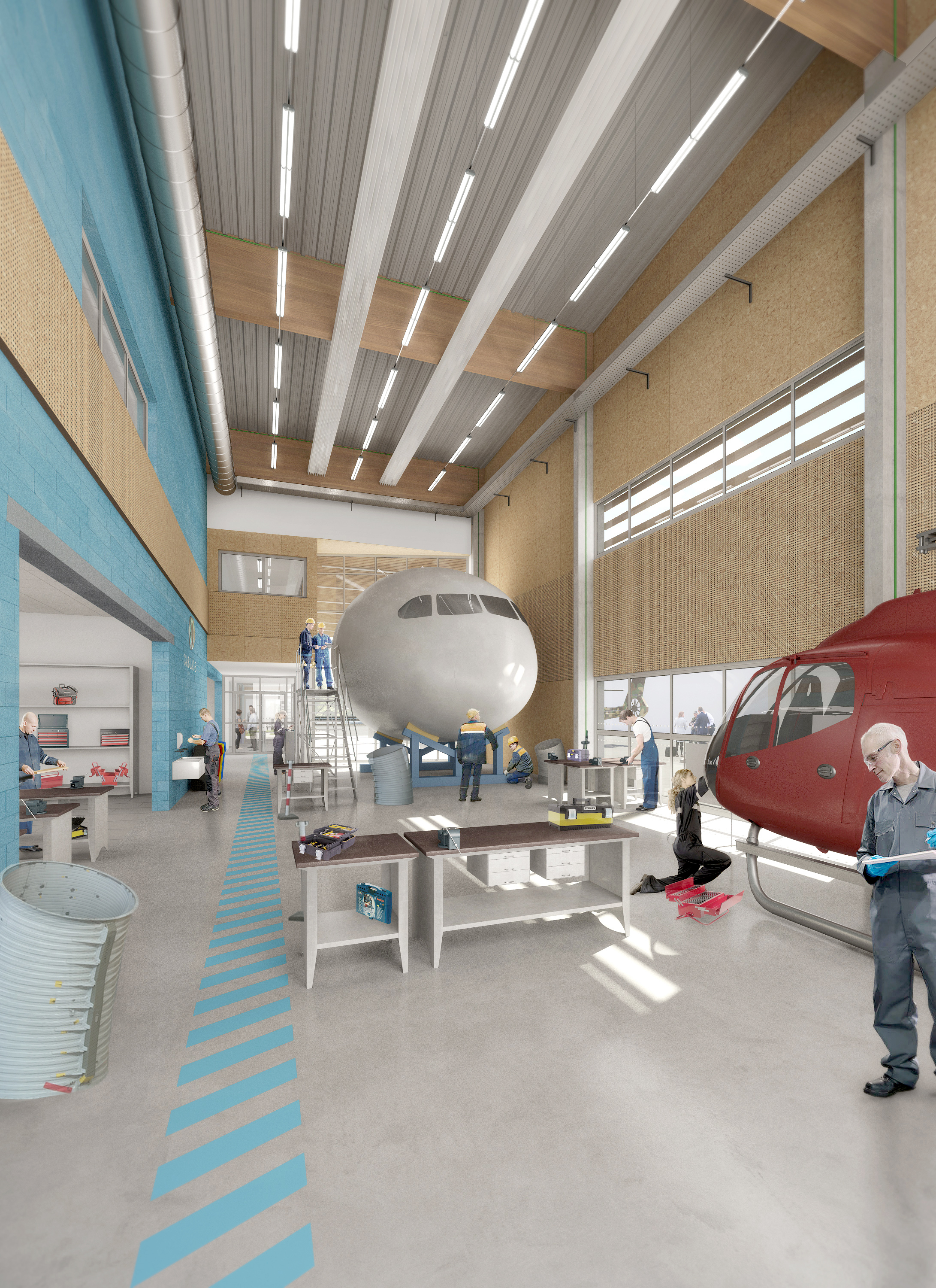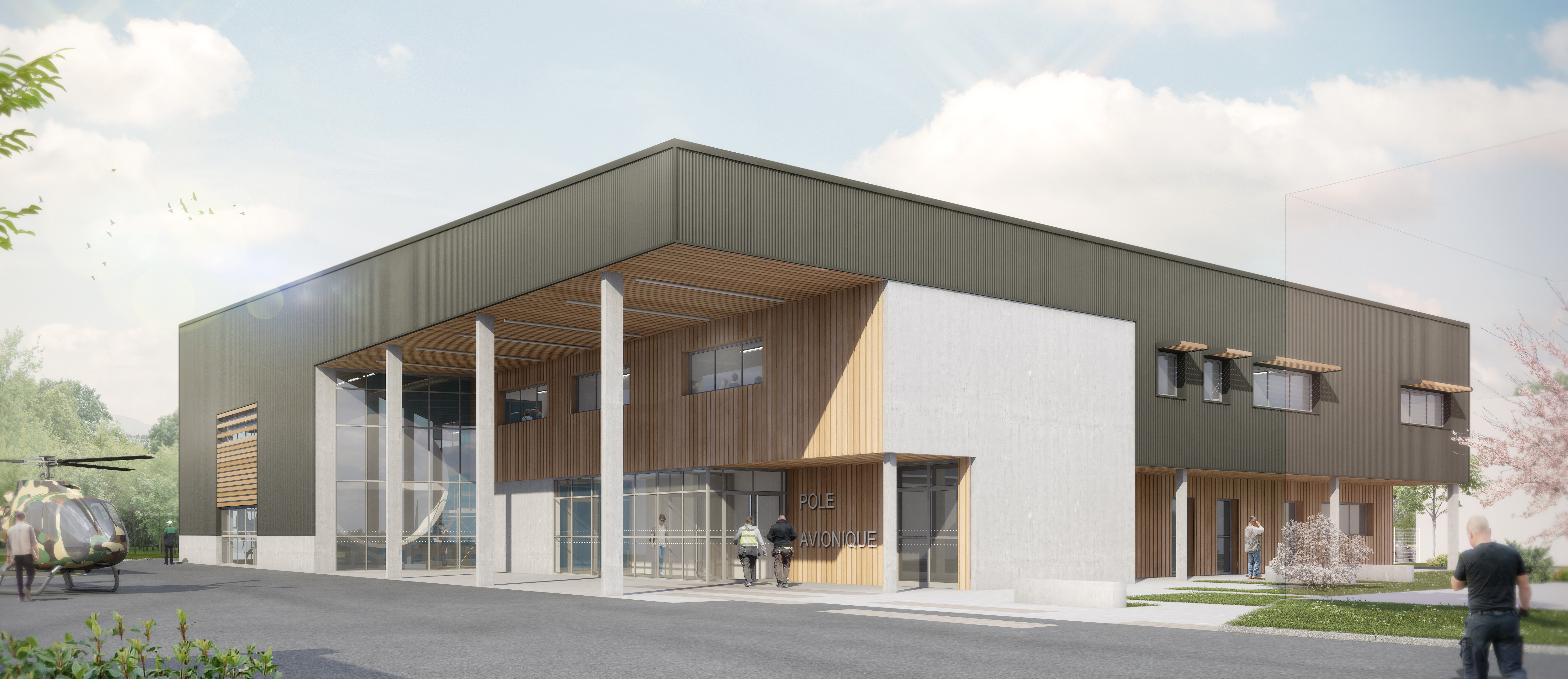 L’entrée et la façade du pole avionique sont en retrait, prolongent la cour d’un parvis sous un large débord de couverture. La halle avionique (qui abrite le plateau technique) s’ouvre en vitrine aux visiteurs, sur la cour en façade Ouest. L’éventualité du déplacement de l’actuelle chaufferie et de la requalification de la cour nous ont conduit à ouvrir la façade Ouest vers ce cœur du site. L’espace entre la cour et l’entrée joue un rôle de mise en scène, de protection solaire et abrite les visiteurs et les étudiants des intempéries.