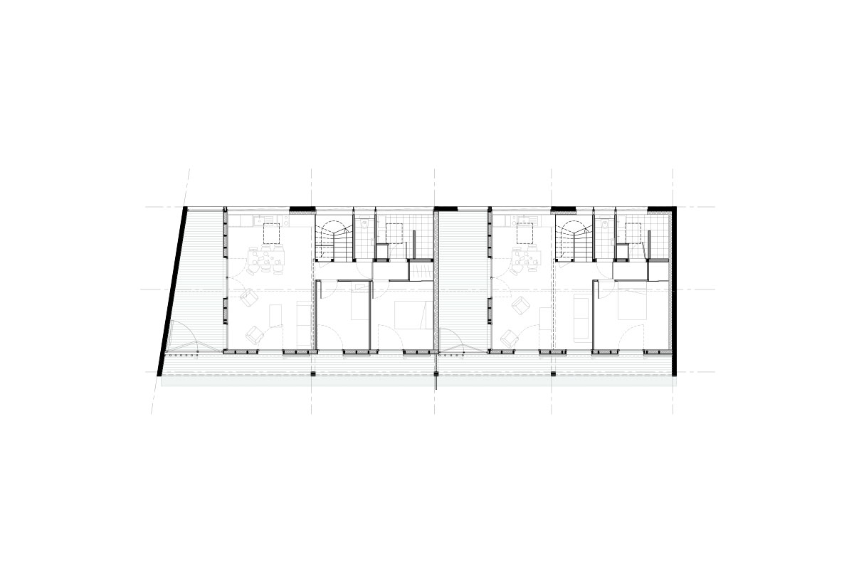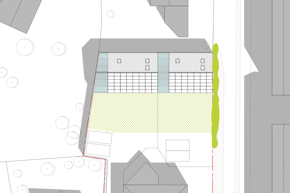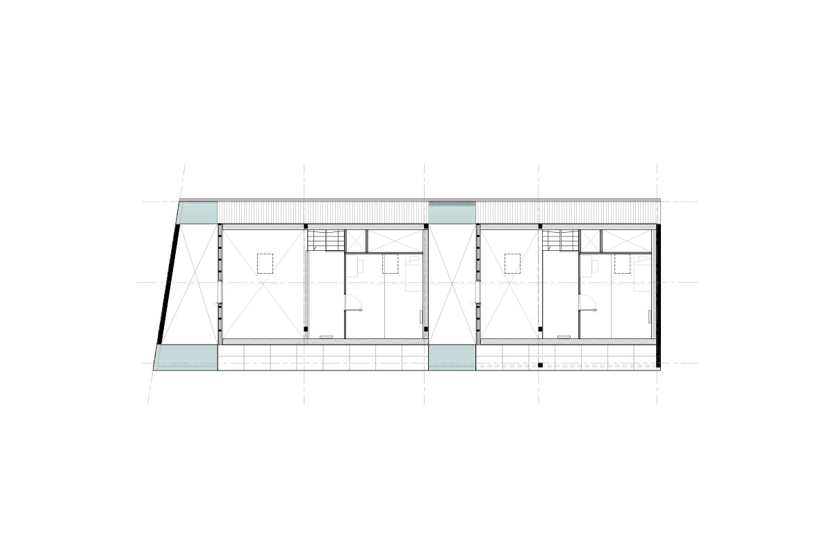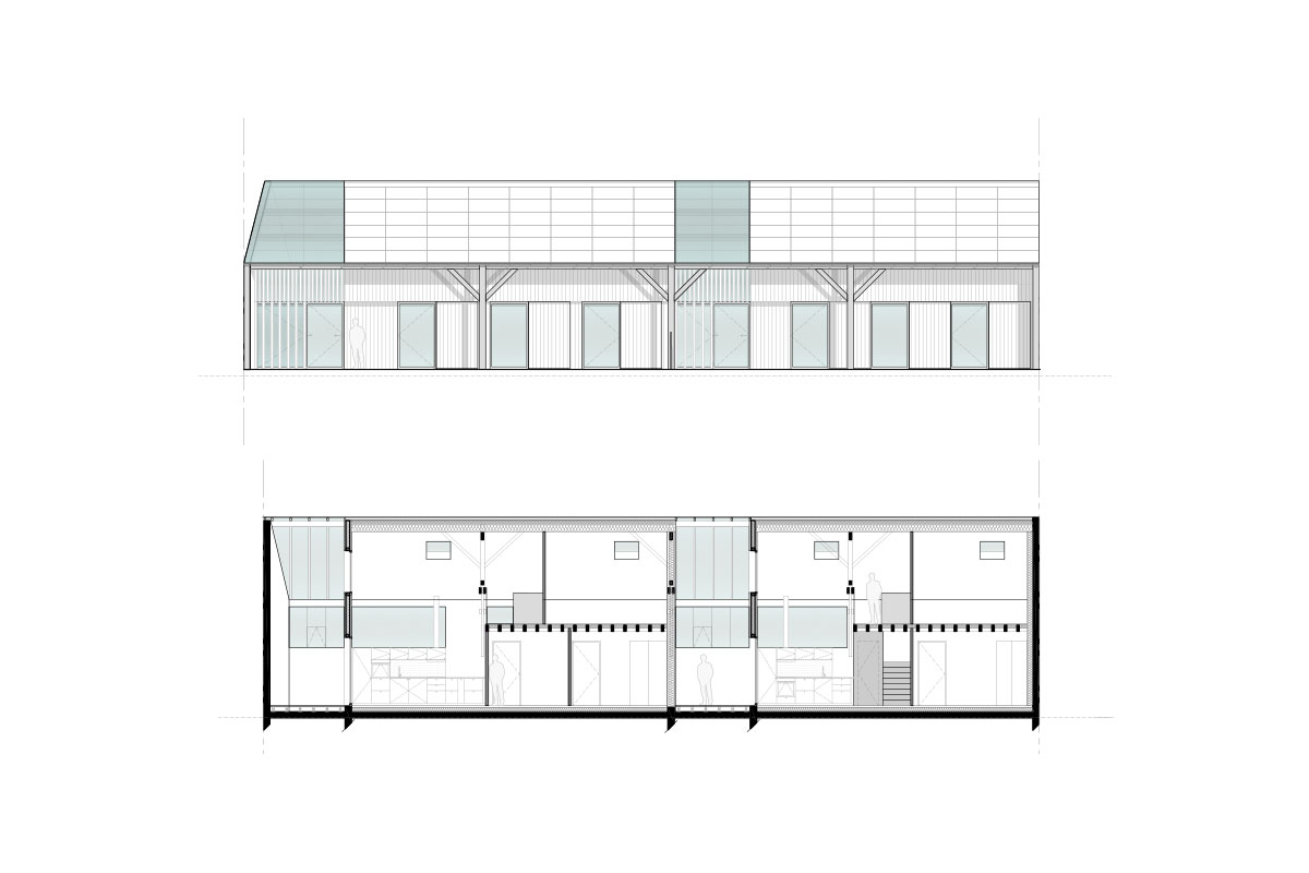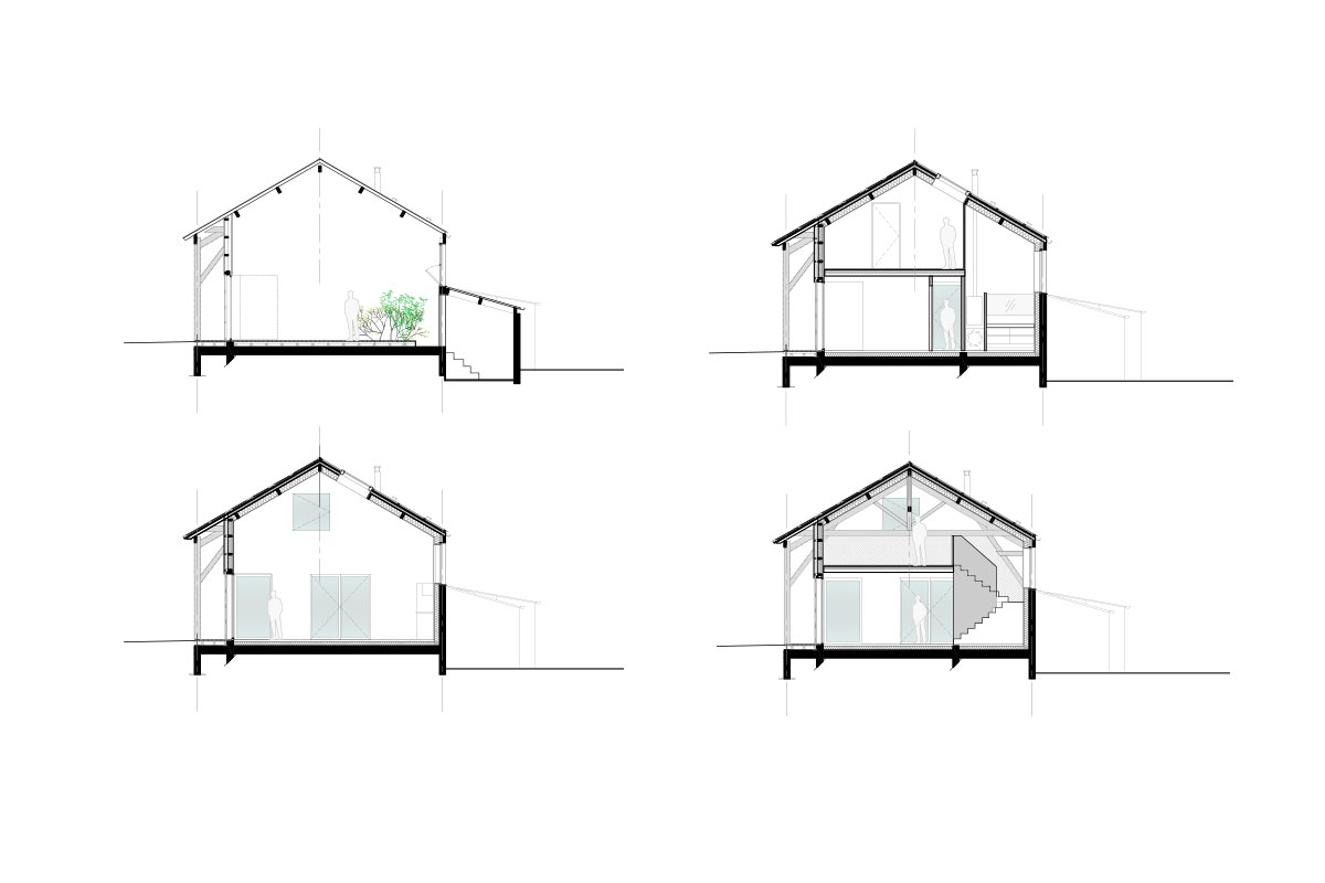 Hangar agricole construit au milieu des champs, il devient rapidement un hangar industriel au milieu d’une zone pavillonnaire. Au départ en retraite du propriétaire, celui-ci souhaite valoriser son ancien lieu de travail en le transformant en logements. La volumétrie et les fermes existantes en chêne sont conservées : elles constituent les traces de son passé industriel. Elles deviennent l’ossature de deux nouvelles maisons. La structure historique est mise en valeur et réemployée. Le projet joue de la contradiction et du rapport complexe entre le low et le high tech.