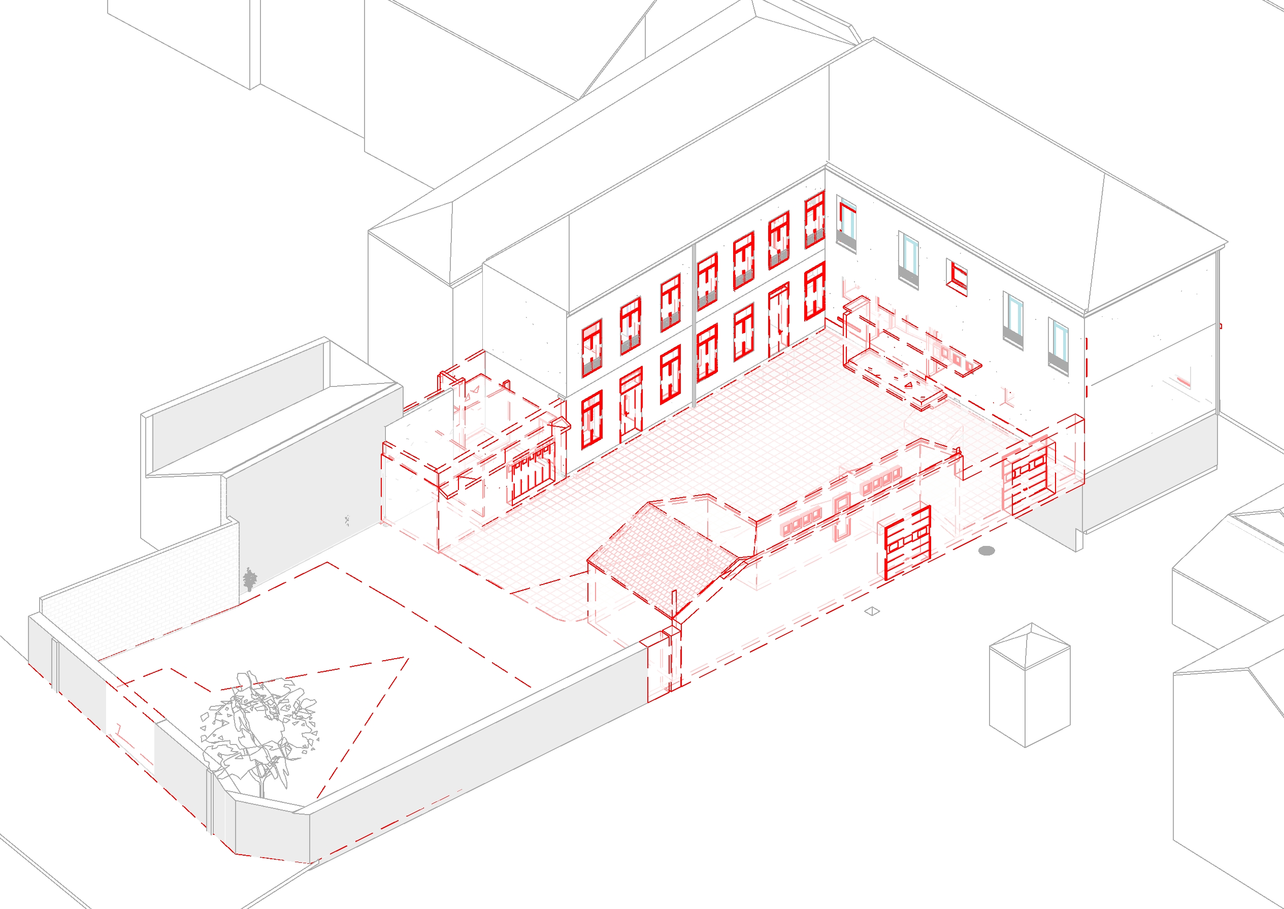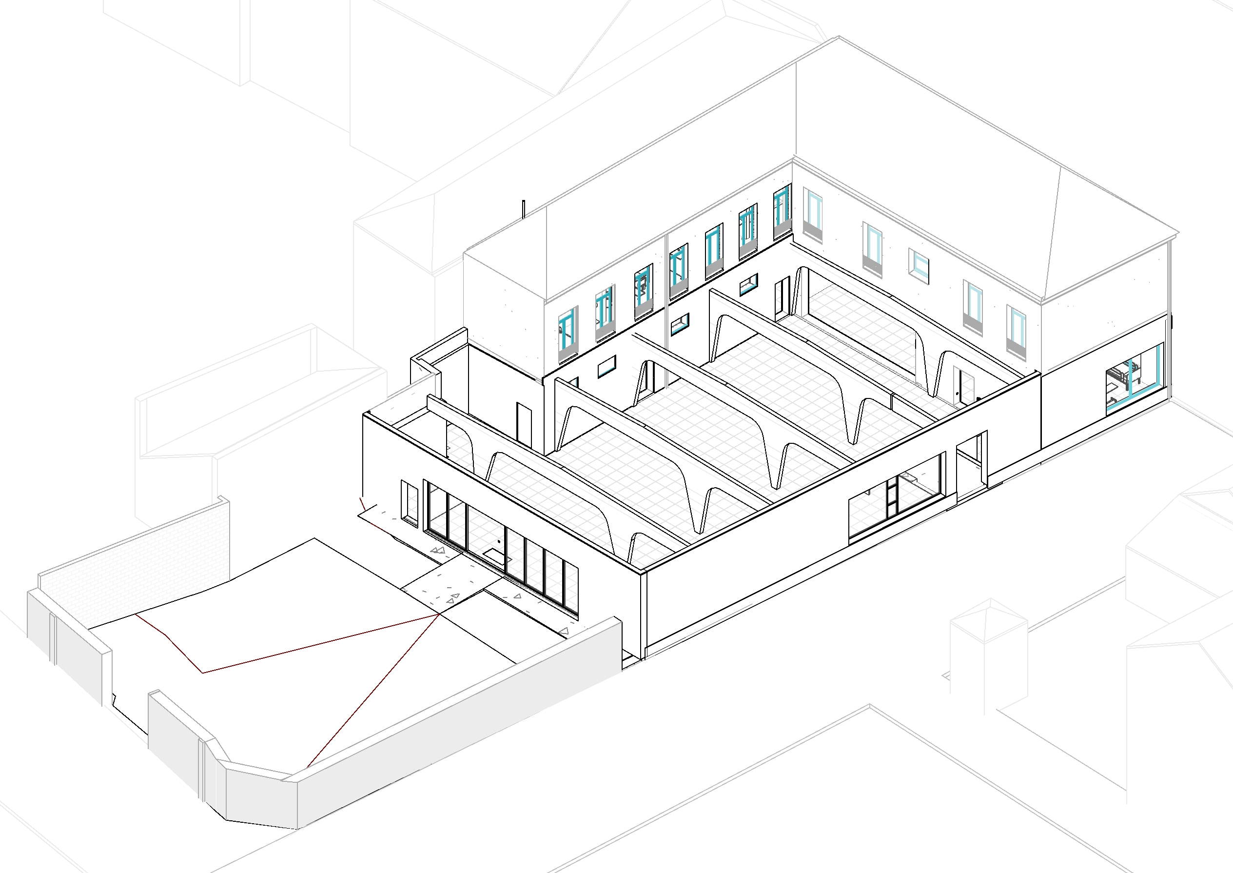 Approche environnementale : Selon nous, la meilleure manière d'économiser de la matière et de réduire notre empreinte carbone est de réutiliser l'existant. Nous avons cherché à ne rien démolir ou presque. L'extension a été réalisée avec le moins de matière possible : une dalle béton, des murs en parpaing isolés, une charpente et des portiques en bois CLT recouverte d'une toiture végétalisée. Il n'y a que le minimum de doublage.