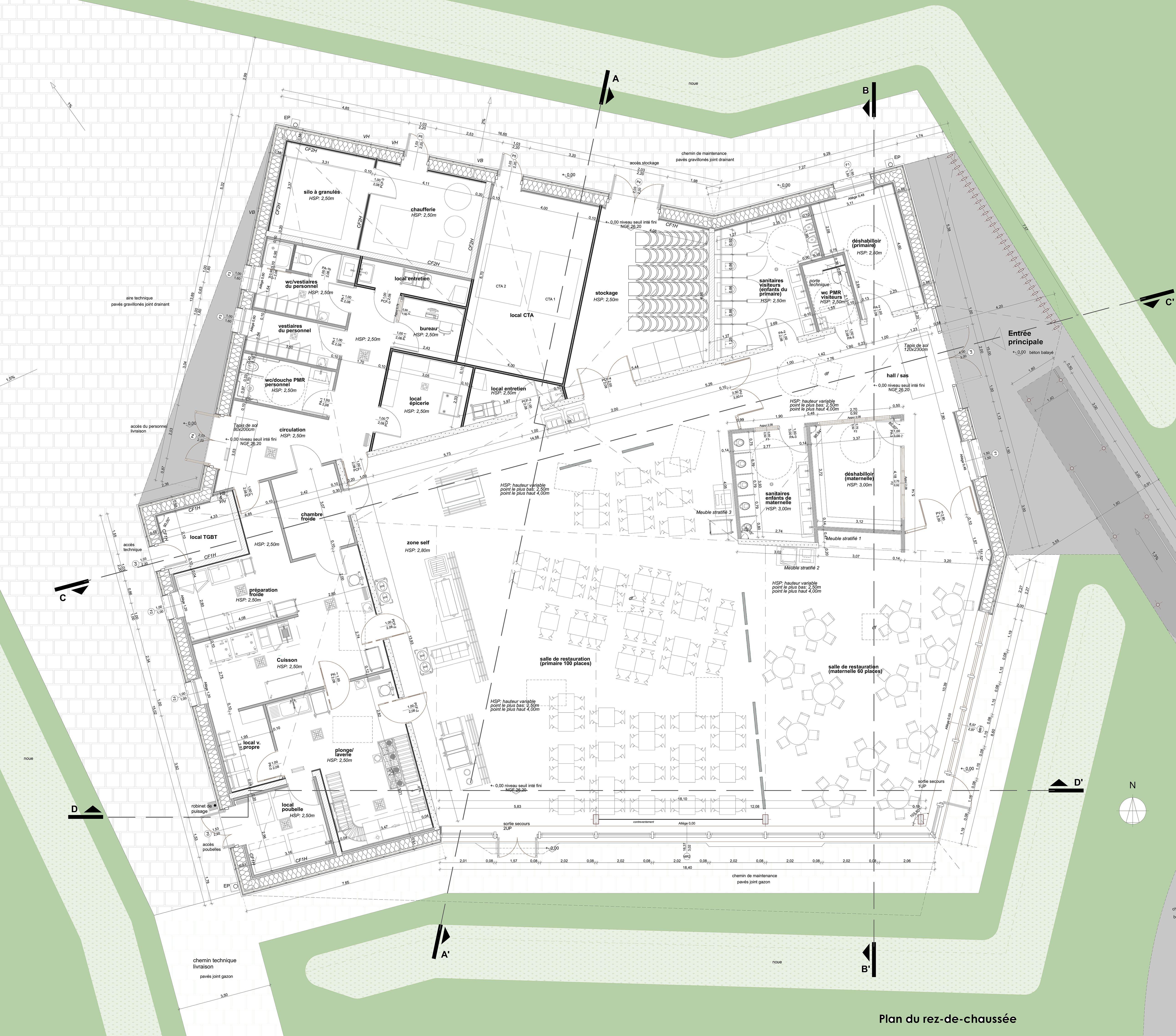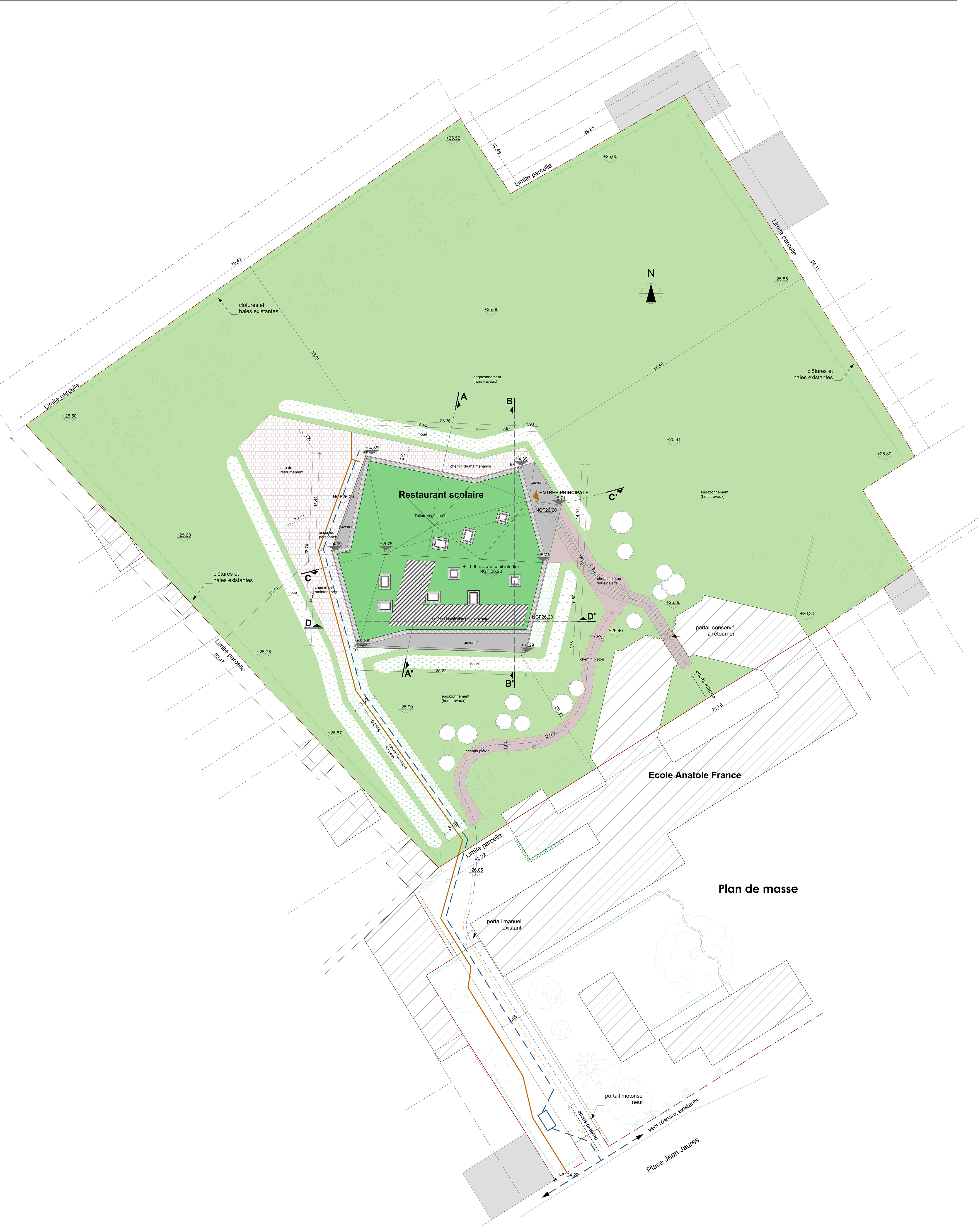 Le projet porte sur la construction d’un restaurant scolaire à destination des 3 écoles élémentaires voisines qui sert à améliorer le service de restauration. L’objectif est de réaliser un bâtiment environnementalement et thermiquement exemplaire au niveau PassivHaus. Bâtiment en plain-pied qui accueille quotidiennement 160 enfants. C’est surtout sur l’implantation et la conception du bâtiment que le travail s'est porté pour parvenir à optimiser apports solaires, lumière naturelle et ombrages, ceci en modulant les ouvertures, la forme des façades et les différentes protections solaires.