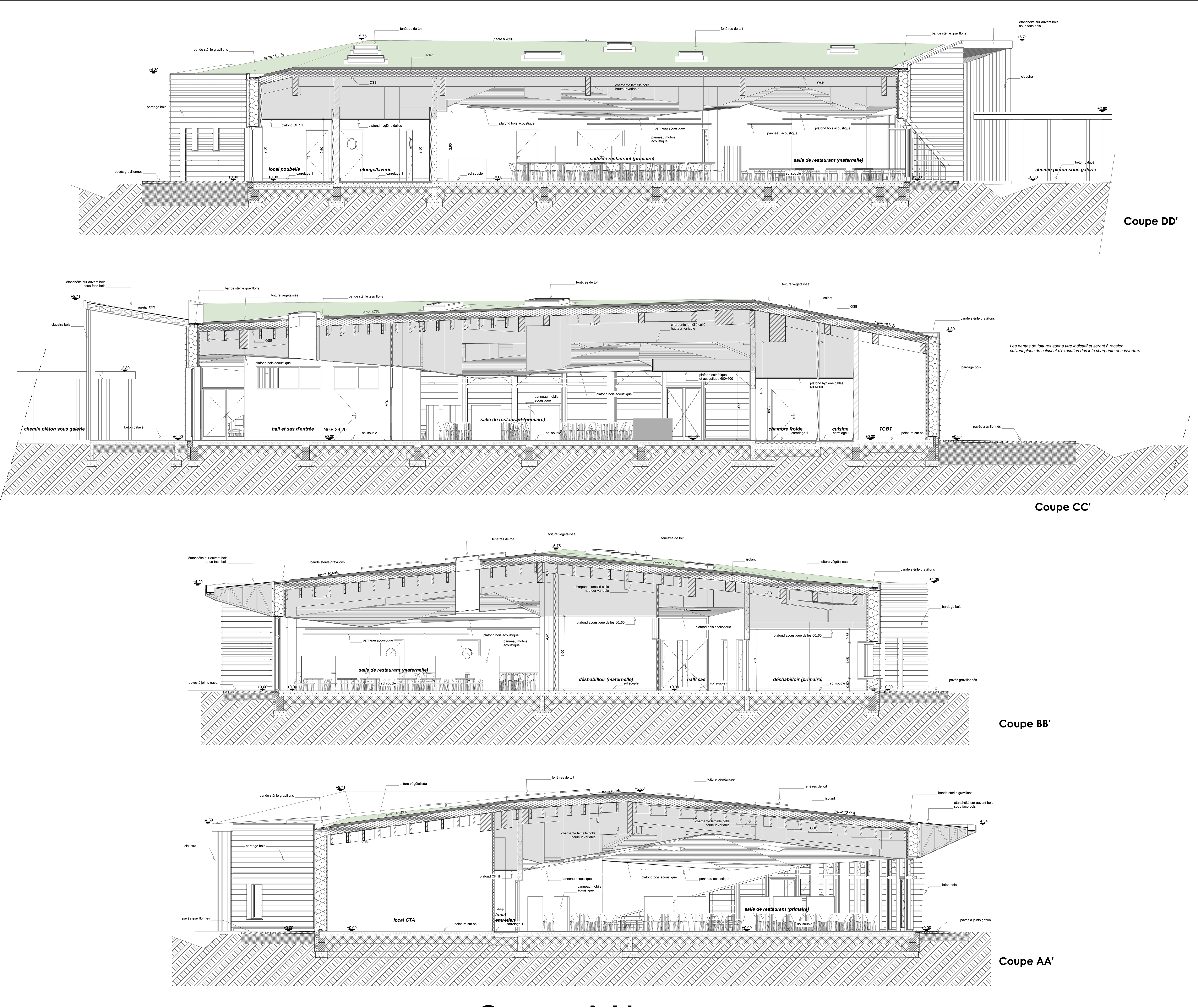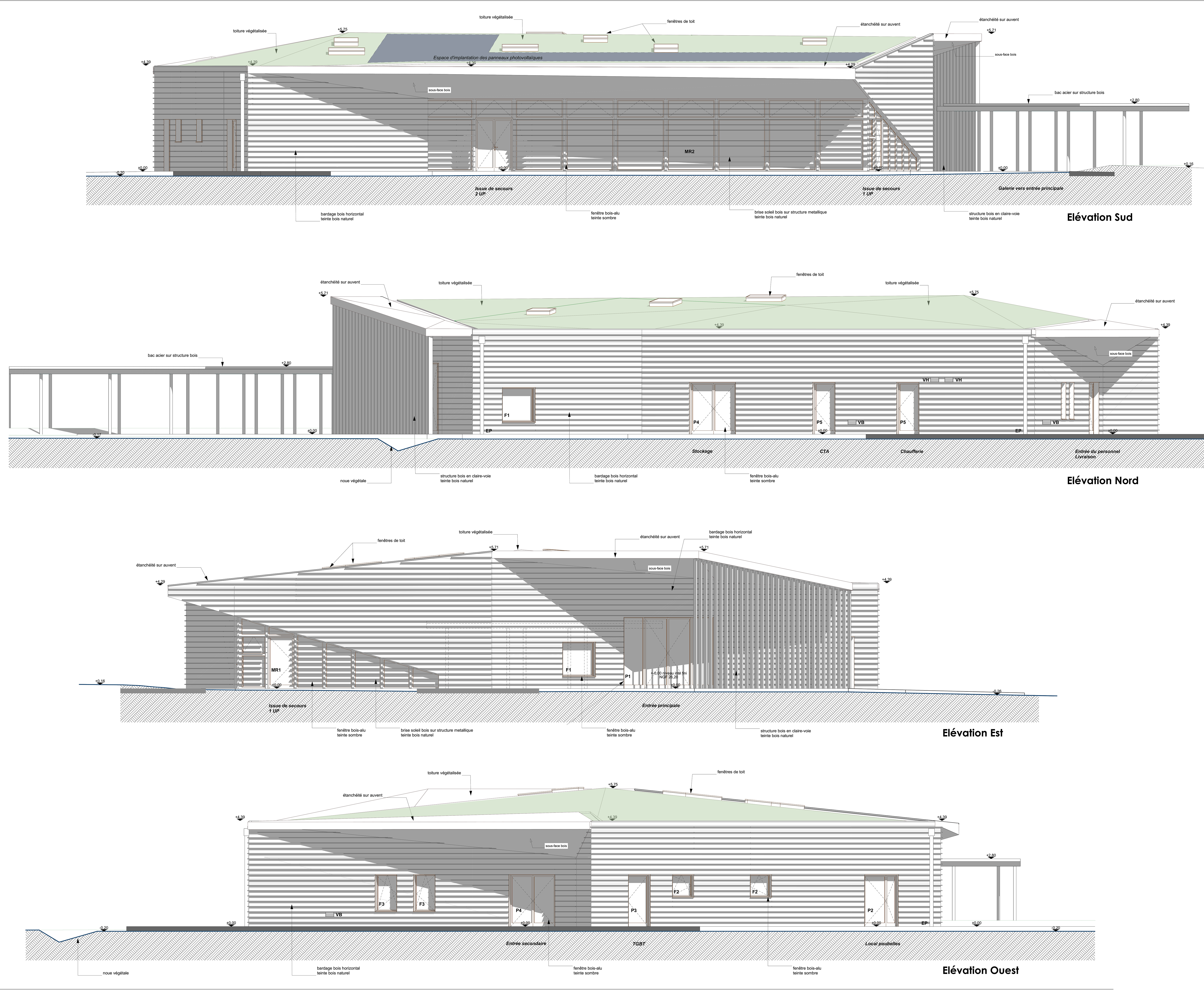 Descriptif technique : Matériaux biosourcés : Ossature bois + Isolation en Ouate de cellulose (Ossature) + Fibre de bois (Pare pluie) + bardage bois naturel / Inertie : Dalle béton, chape et murs refends en béton préfabriqué / Menuiseries Bois Alu triple vitrage / Protection solaire extérieure amovible en façade sud + auvent / Étanchéité à l’air / VMC double flux / Ventilation naturelle (ouvrants en imposte et fenêtres de toit) / Toiture végétalisée / Panneaux photovoltaïque / Eléments acoustique décoratif / Infiltration de l’eau de pluie vers des noues végétalisées / Chaudière bois à pellets