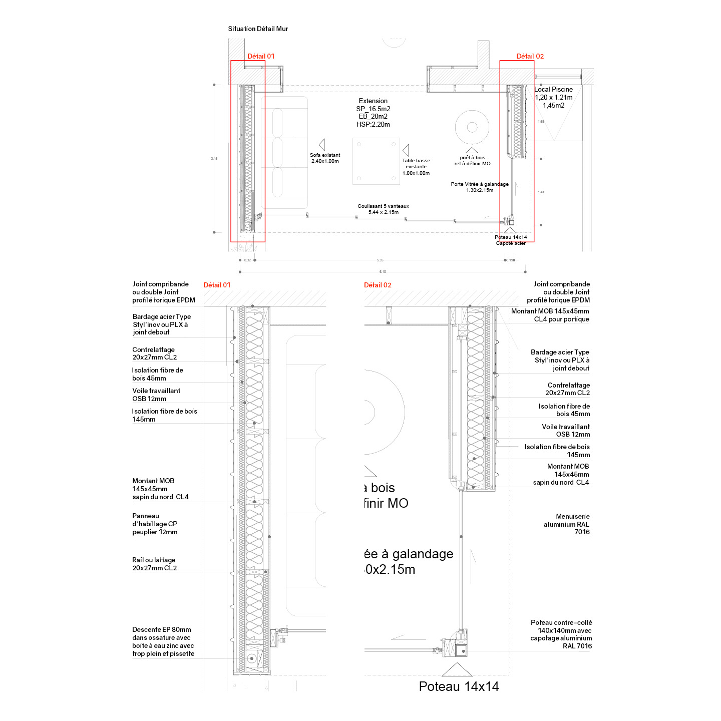 Approche environnementale : L’emploi du bois vient renforcer la notion « garden lodge » avec la mise en place d’un poêle à bois qui vient réchauffer l’espace. De même, dans l’espace d’entrée le choix d’un agencement en peuplier réalisé sur mesure viens faire écho, tout en modifiant l’ancien salon, maintenant transformé en bureau cloisonné par une verrière également conçue sur-mesure par le ferronnier d’art Luc Martin.