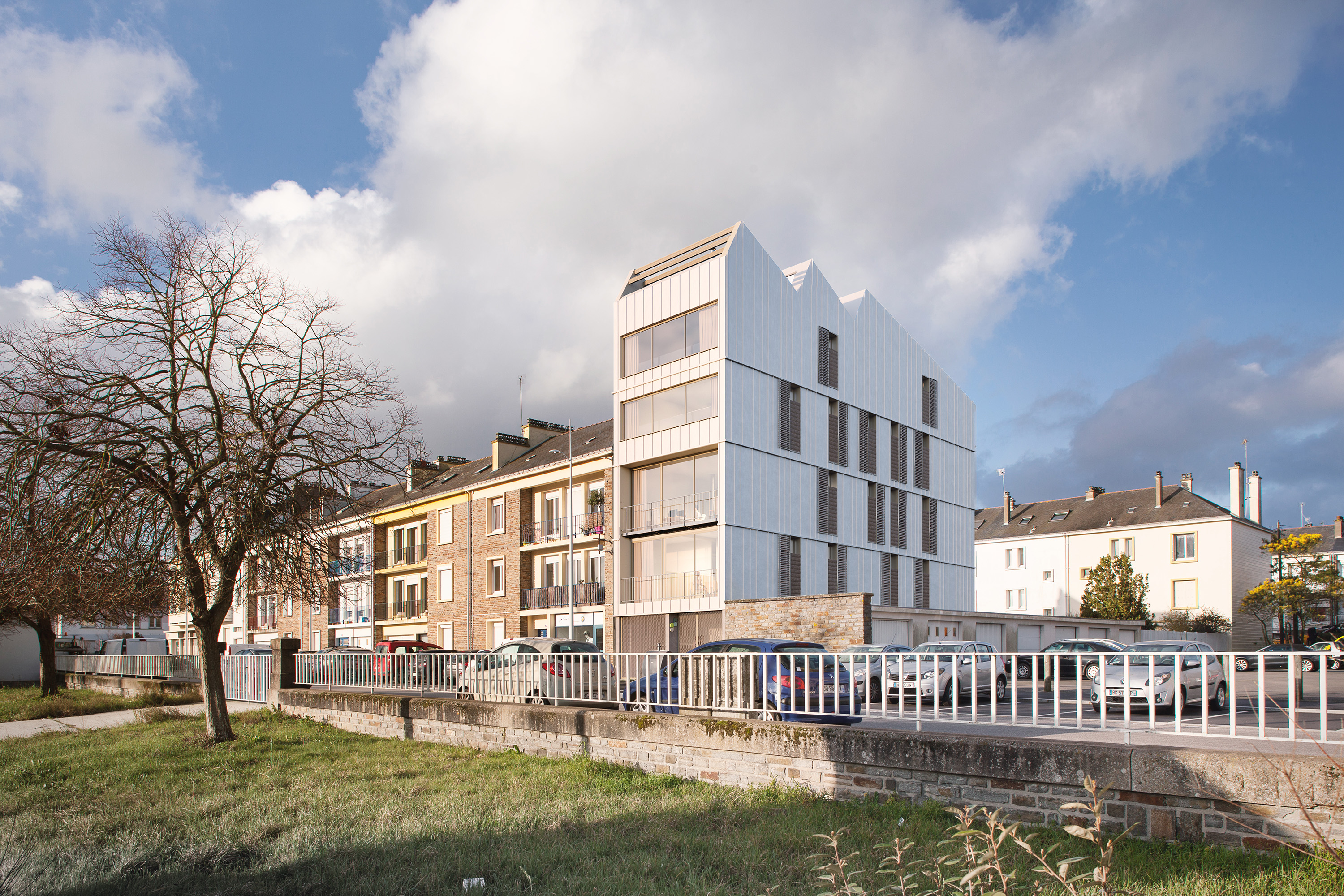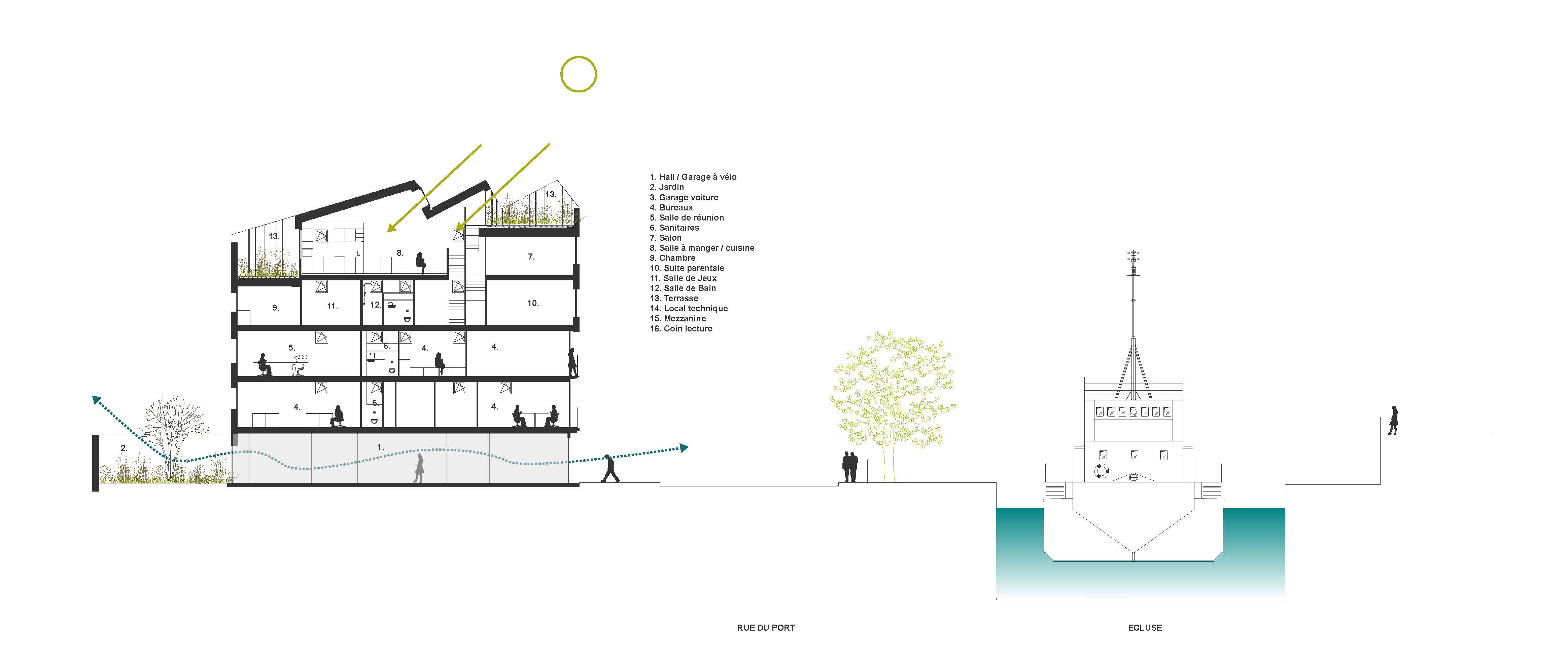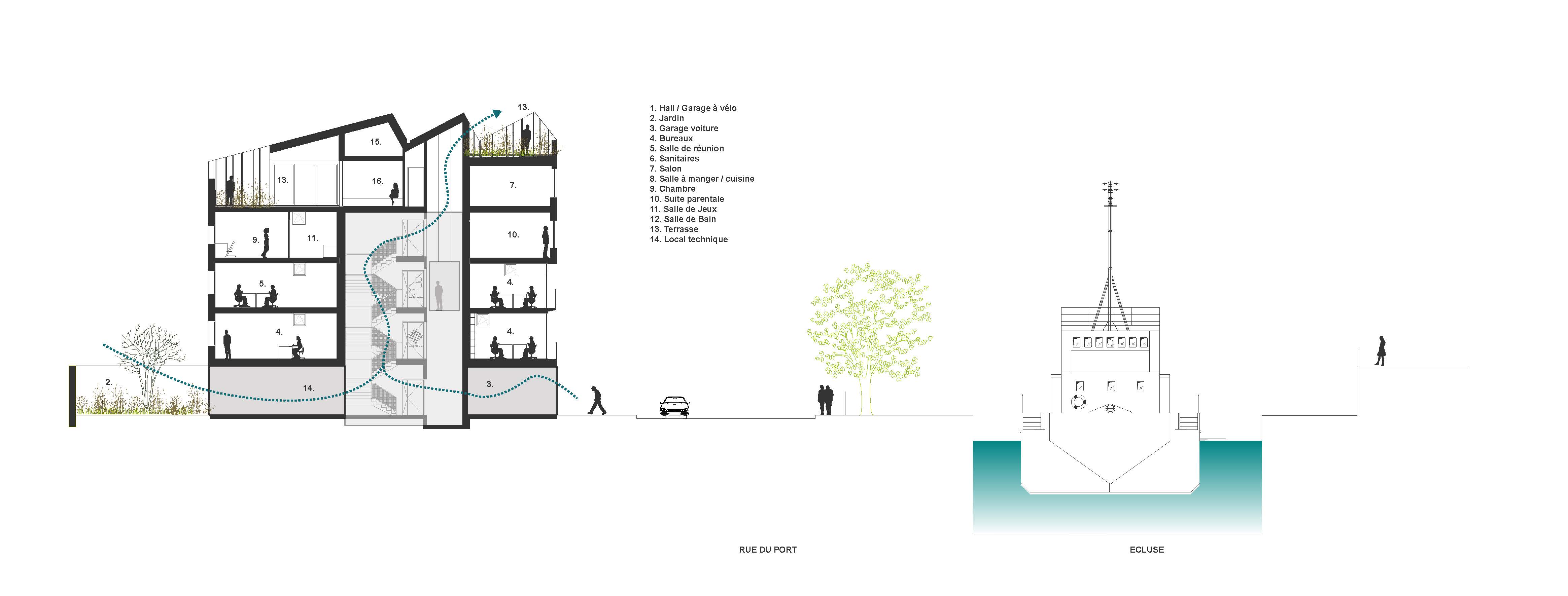 Niché dans une dent creuse de 6.00 m de large, surplombant une écluse, ce projet très étroit cumule les mixités. Mixte par son système constructif BOIS / BETON, mixte par ses usages de bureaux couplés à une habitation. Le terrain étant très profond, la question des apports lumineux est vite apparue. La façade principale offre des grandes baies toute hauteur et toute largeur permettant d’oublier la façade au profit du paysage industriel exceptionnel qu’est cette écluse.
