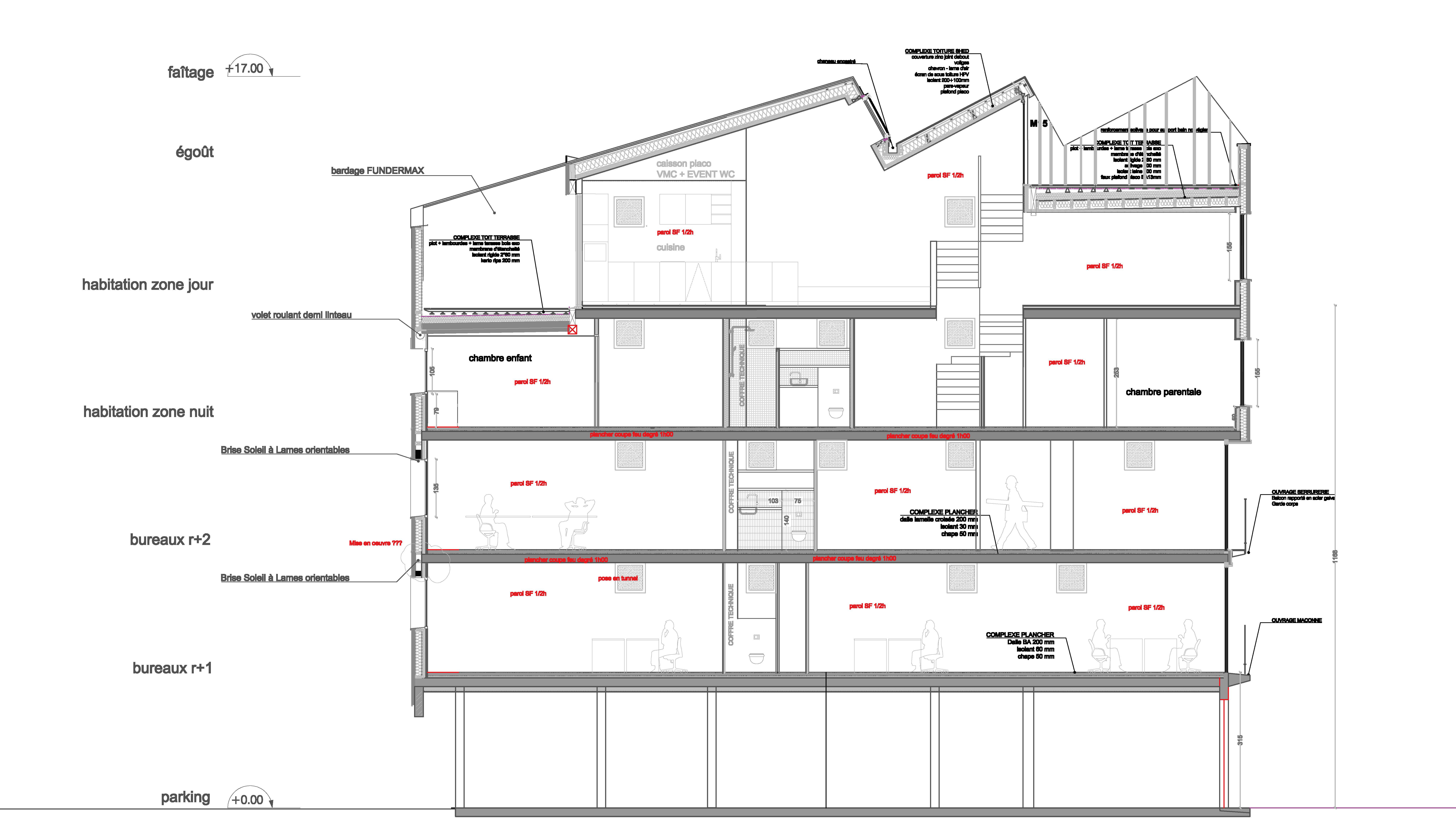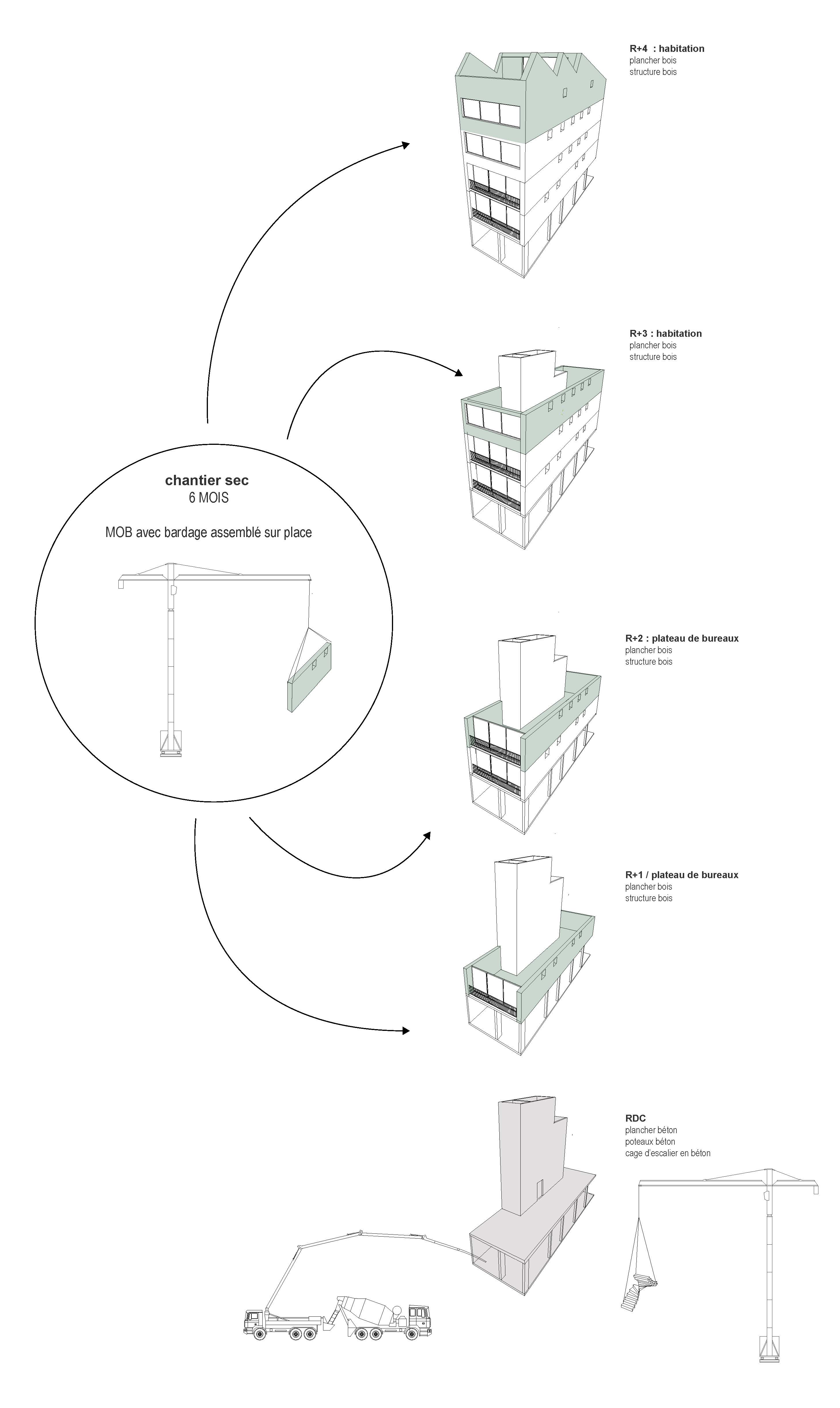 Descriptif technique : Les murs des étages R+1 à R+3 sont en ossature bois épicéa classe 2 préfabriqués en atelier. Le RDC et la cage escalier ascenseur sont en prémur béton préfabriqué également. L'accès au chantier de 6m de large ne permettait pas de s'étendre, l'optimisation maximale des techniques constructives était le leitmotiv de ce chantier.