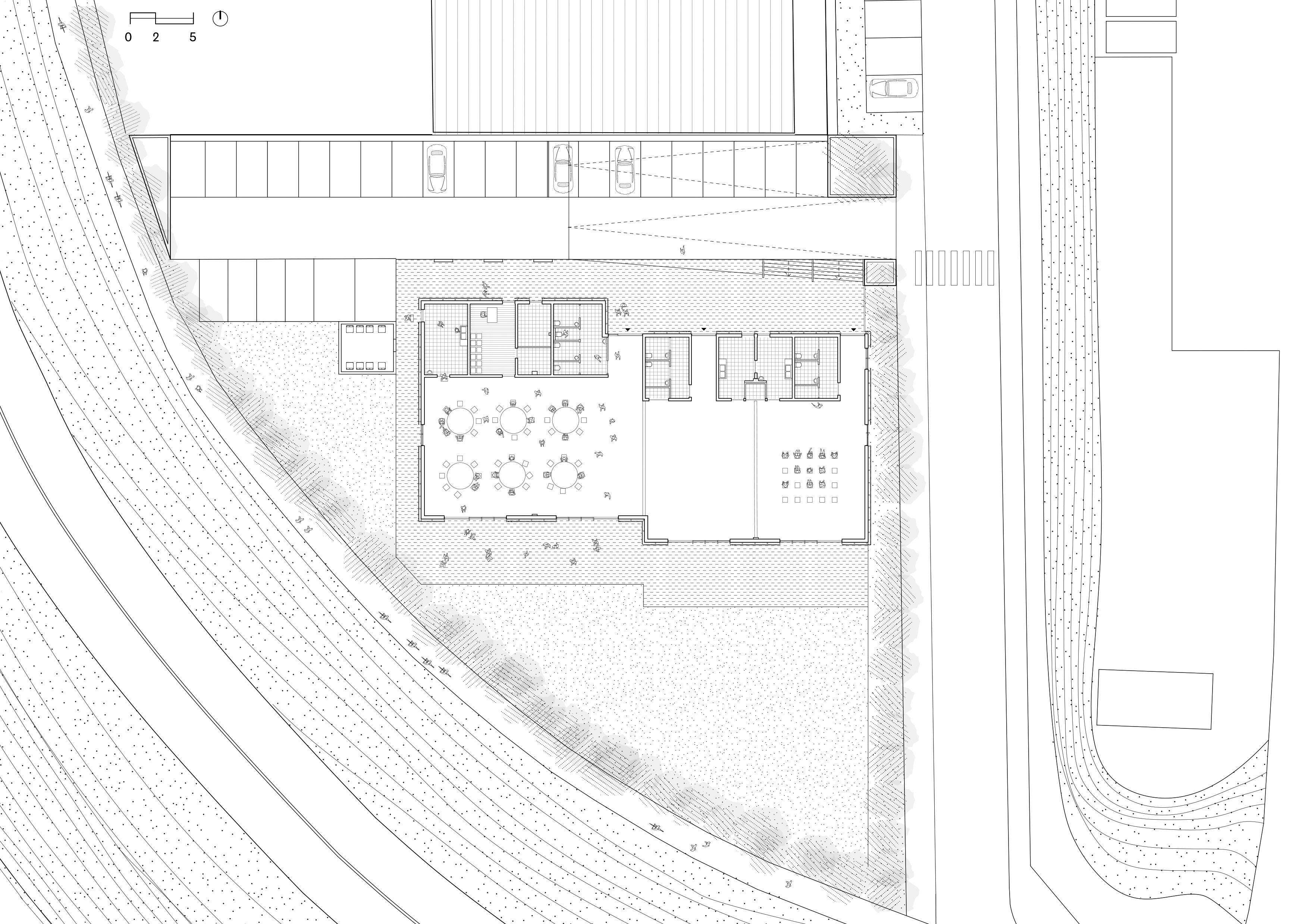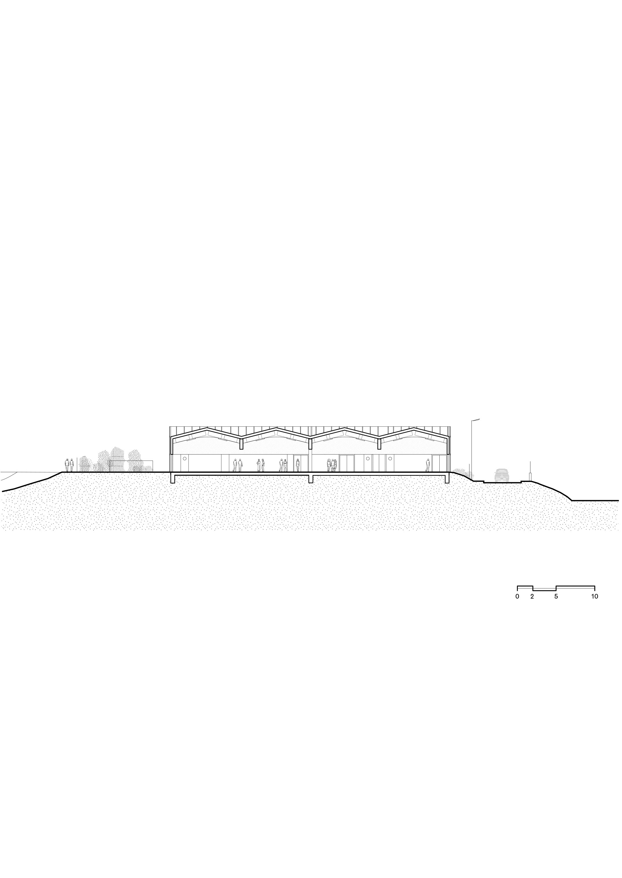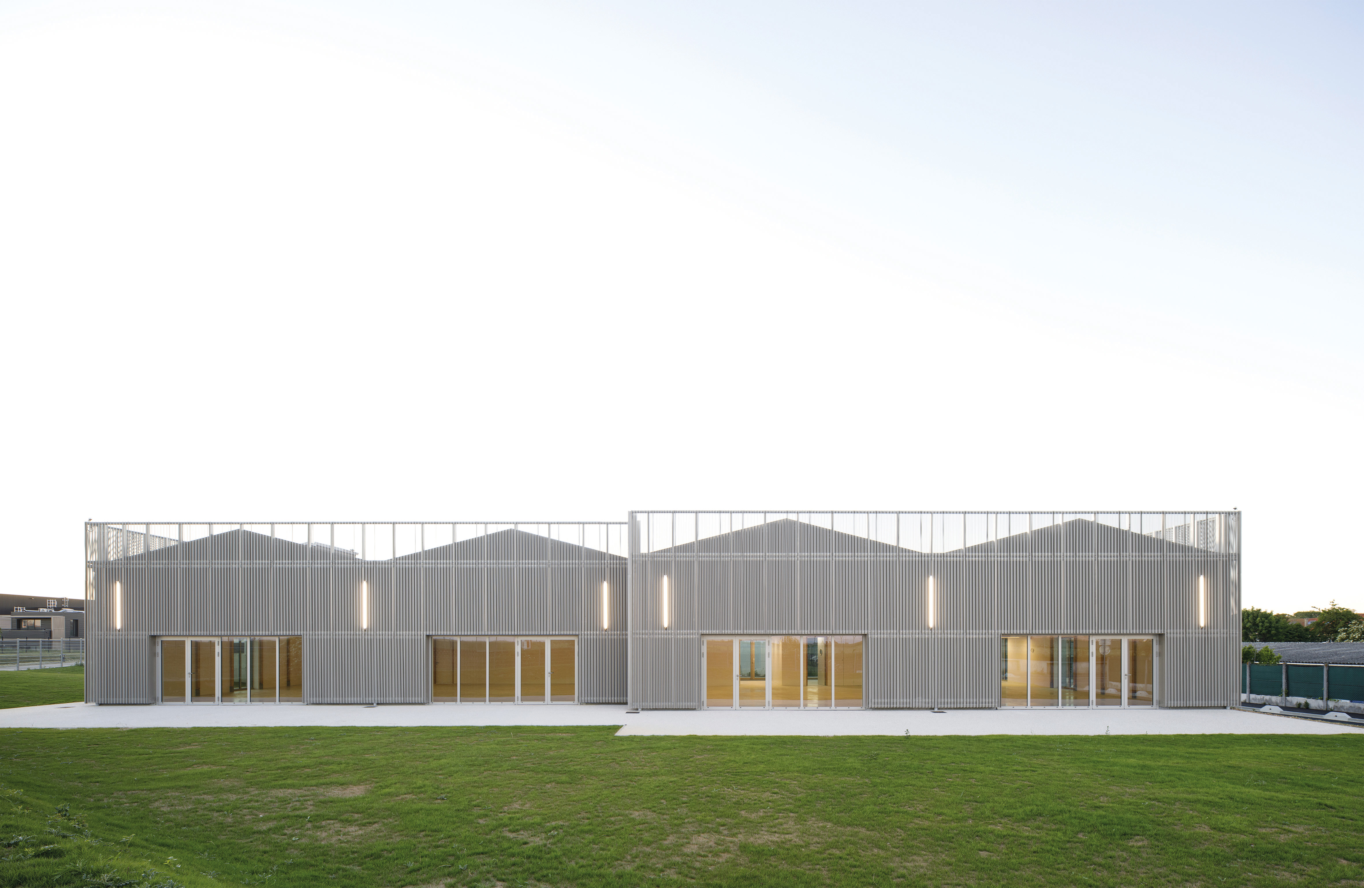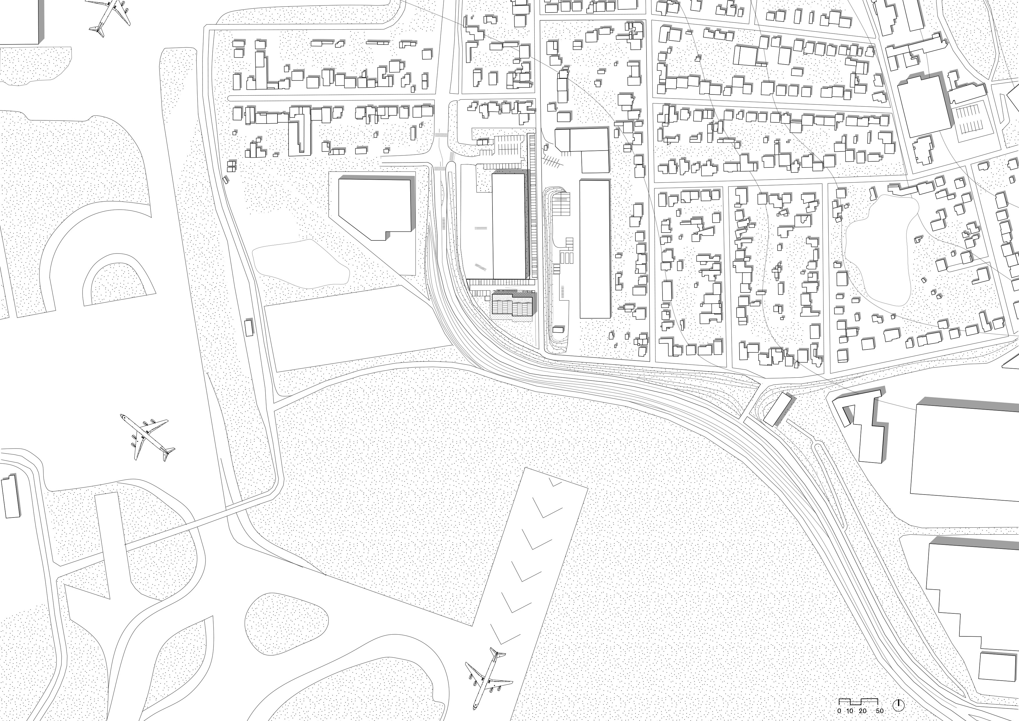 Le territoire d’Orly connu surtout pour ses activités aéroportuaires est avant tout un territoire habité. Le site semble un lieu à part, appartenant à la fois au grand paysage de l’aéroport et à l’intimité de cette frange de ville composé d’un tissu pavillonnaire et de bâtiments logistiques. Orientées face aux pistes, les salles se déploient suivant deux volumes cubiques de mêmes dimensions qui tentent de s’éloigner de la typologie du hangar pour se rapprocher de l’échelle domestique de l’habitation tout en bénéficiant d’une visibilité à l’échelle du territoire.