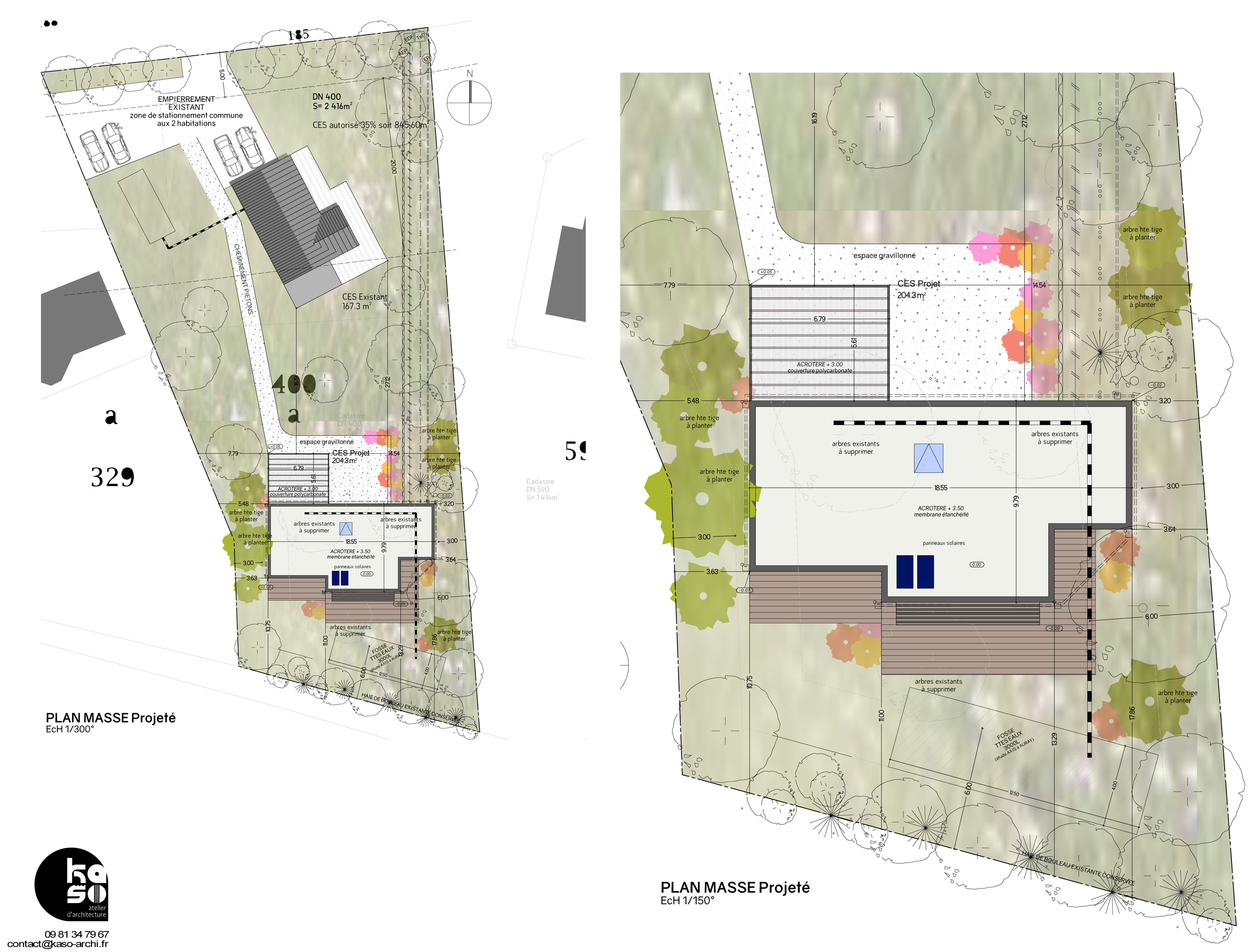 Situé en fond de parcelle, la nouvelle construction se tourne entièrement vers le sud, afin de profiter de l'ensoleillement et du réchauffage "passif", la maison répondant à la norme des bâtiments passifs. La construction est de plain-pied, et les matériaux volontairement écologiques et environnementaux. Le volume est volontairement sobre, avec de grandes ouvertures et un jeu de bardage bois et de panneaux composites permettant d'animer les volumes.