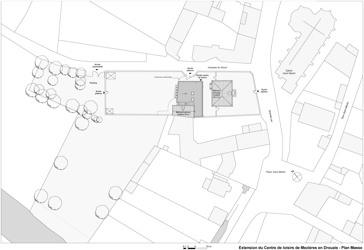Le projet se compose d'un volume simple en RDC implanté à distance de l'édifice principal et accolé au bâtiment annexe, en ménageant un "entre-deux", un espace de transition abritant les circulations. L'extension reprend l'alignement du bâtiment principal et offre à travers la grande salle des relations visuelles entre le centre de loisirs existant et le fond boisé de la parcelle. Le terrain fait partie du périmètre de protection "Monuments Historiques" de l'église classée de la commune. Malgré un terrain assez vaste, la zone inondable et les règles du PLU réduisent la surface constructible.