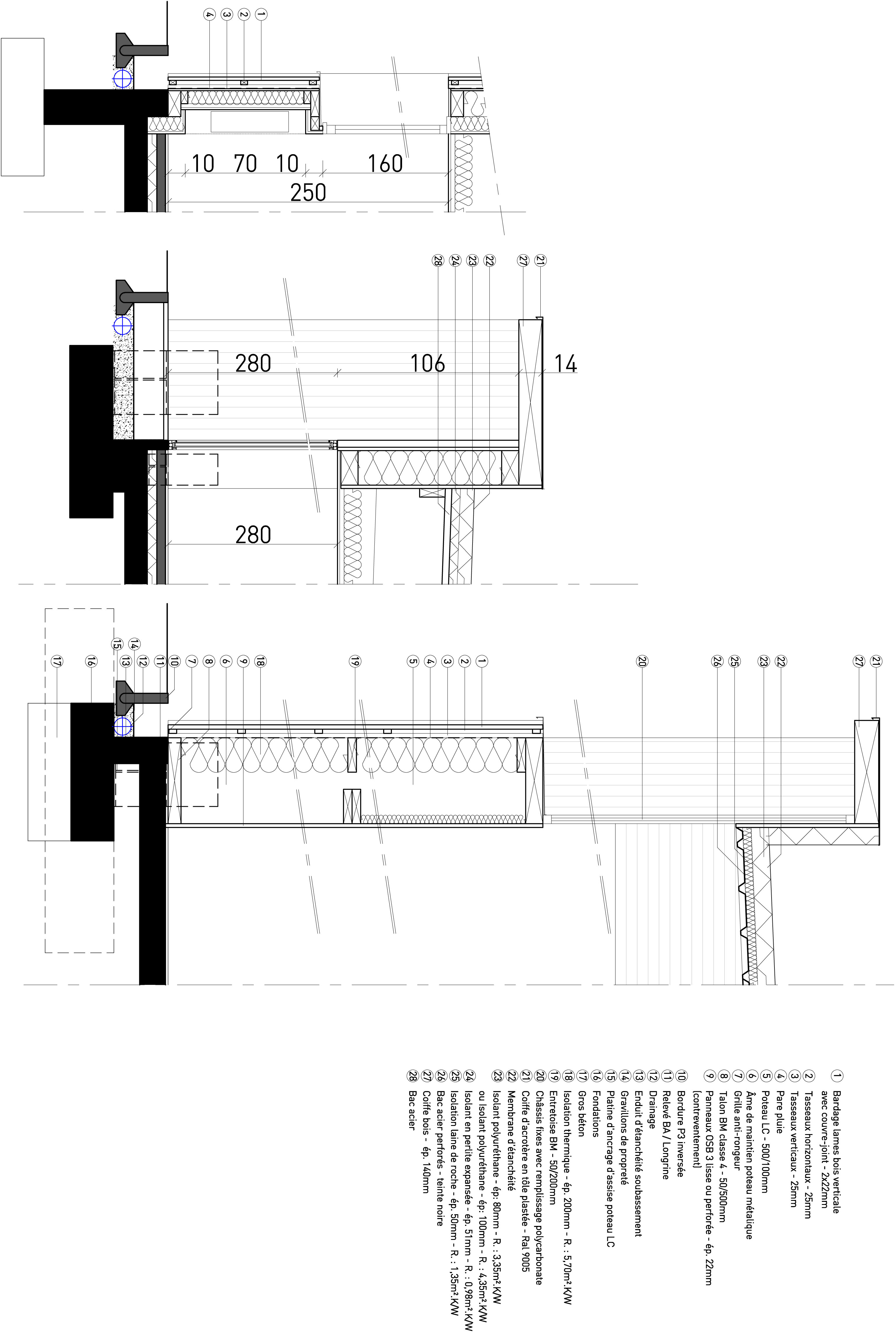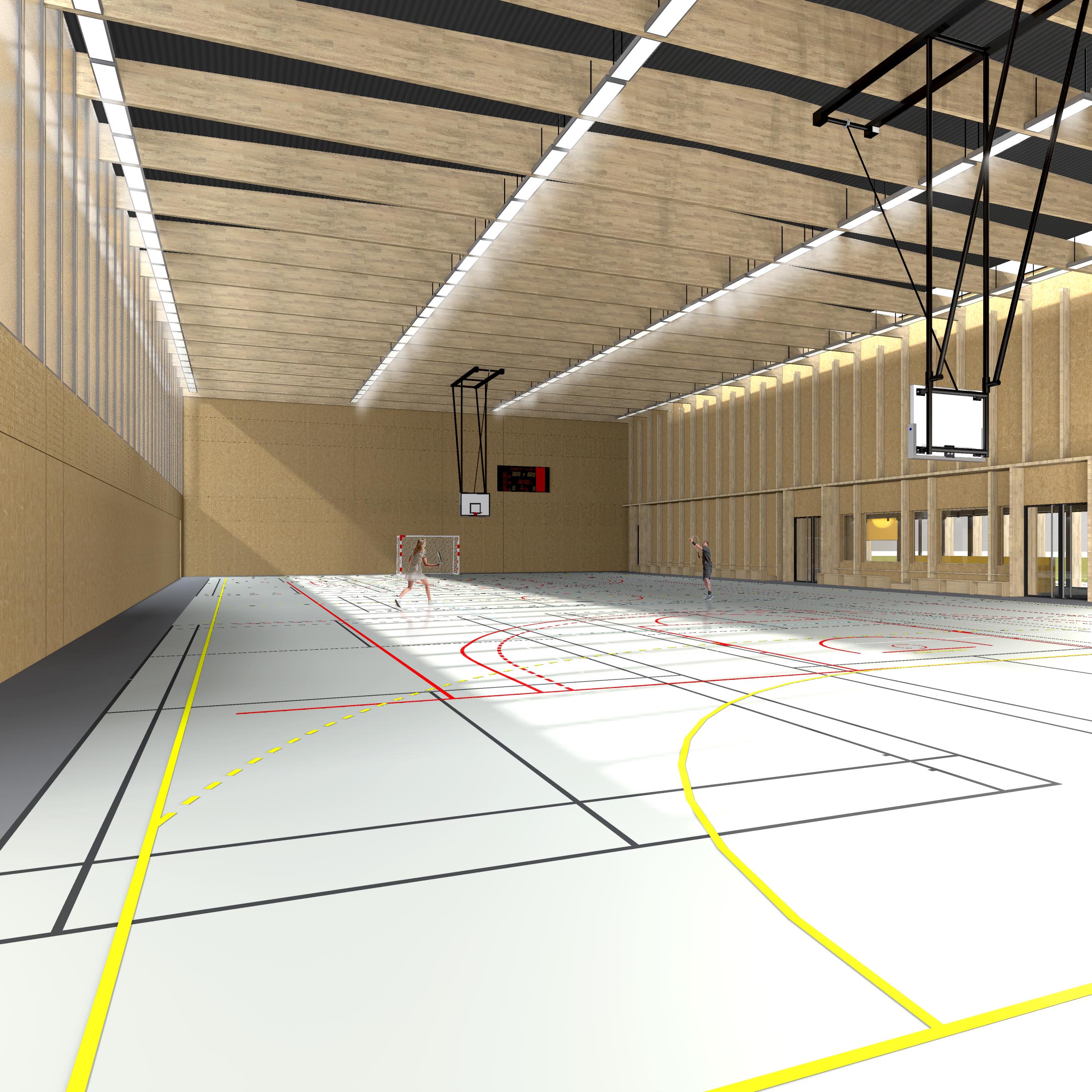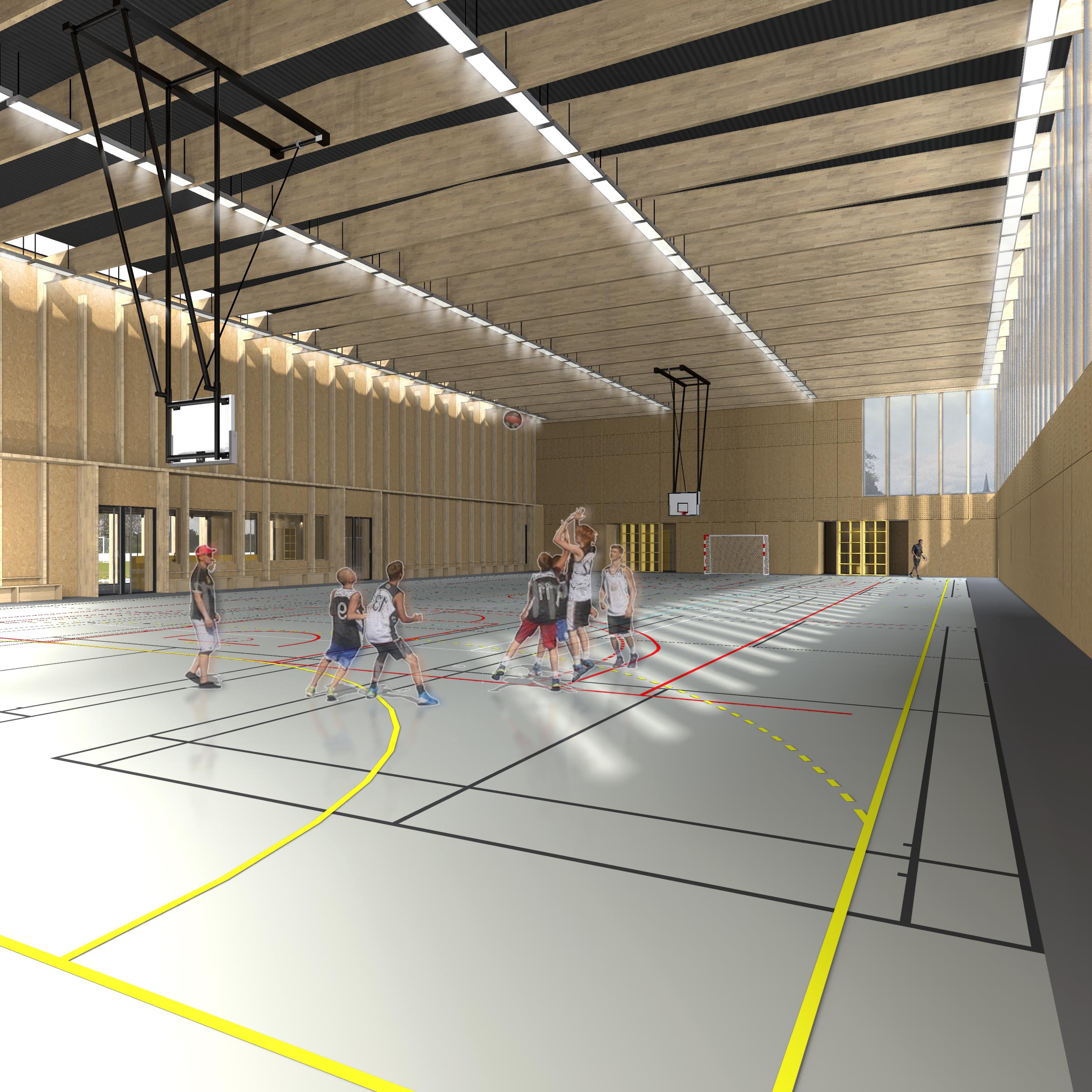 Descriptif technique : Les principes constructifs communs aux 2 opérations ont permis de démontrer que le choix conceptuel de l'architecte pour un système de portiques "lamellé-collé" d'entraxe de 2,40m recoupé verticalement par des poteaux tous les 1,20m reprenant le principe d'ouvrage à ossature bois, s'avérait plus économique qu'un structure classique par fermes d'entraxe 6,00m, au vu également du respect de la réglementation RT 2012 et acoustique.