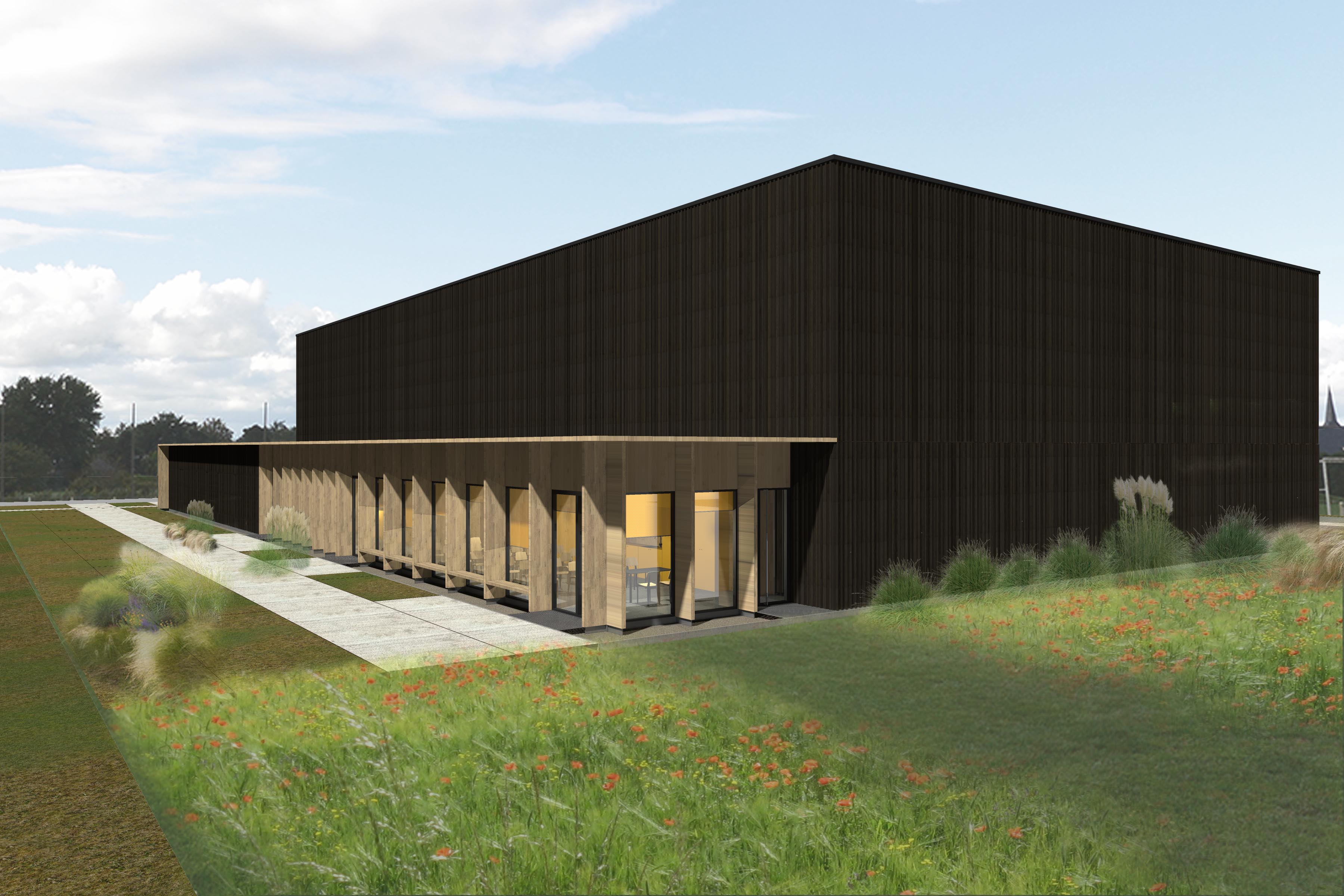 Approche environnementale : La volonté d'une harmonie dans le traitement de l'enveloppe malgré les différentes volumétries a conduit à l'utilisation d'un matériau unique. Inspiré par la présence d'anciens hangars agricoles en bois, l'utilisation d'un bardage en douglas vertical avec couvre-joints de teinte foncé, s'inscrit dans l'architecture locale. Ainsi le bâtiment se fond discrètement dans le paysage boisé.