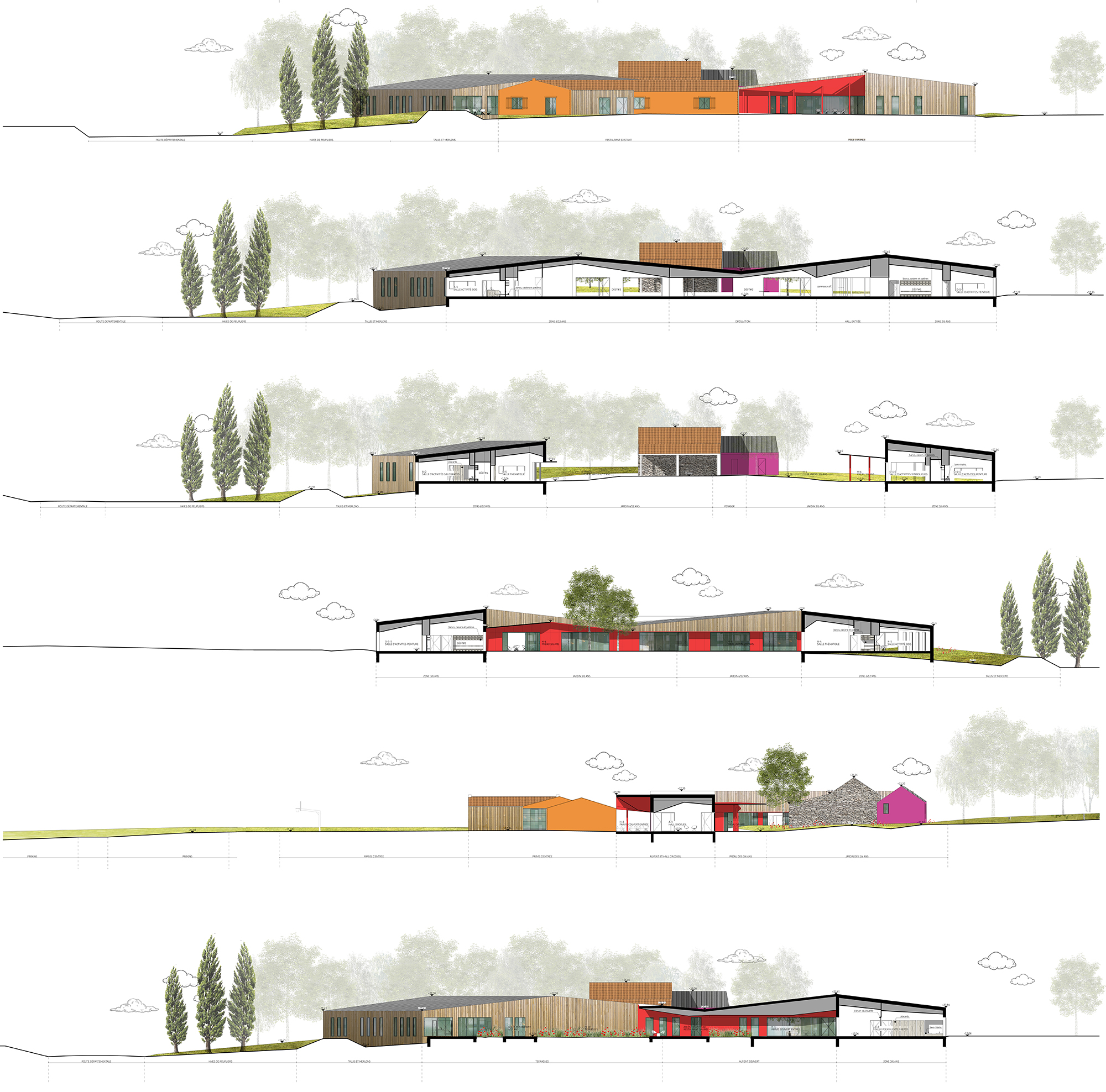 A Vertou, la Presse au Vin jouit d’une grande qualité paysagère : un front boisé, une vaste prairie en dévers, un hameau constitué d’un pressoir et d’une ancienne ferme, un bois à la topographie escarpée. Notre projet propose une architecture dialoguant avec ce paysage, composant une architecture simple, efficiente et confortable. Le Pôle Enfance est un volume réalisé en ossature et bardage bois à couvre-joints de lames de largeurs variées. L’entrée est marquée par les couleurs vives du auvent. Ces couleurs traversent le hall et habillent façades et auvents autour du pressoir sur la courée.