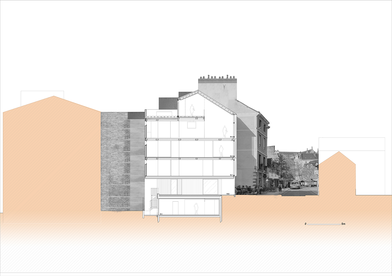 Approche environnementale : Ce projet s’inscrit dans la transition écologique et la dynamique de densification des cœurs de ville pour préserver les terres agricoles. Inspirée des pays nordiques, la démarche environnementale est low-tech, guidée par un travail soigné sur l’enveloppe et des systèmes mécaniques réduits au minimum. La construction en bois de pays a été le gage d’une empreinte carbone réduite. Avec un éclairage et une ventilation naturelle grâce au volume traversant, l’humain est au cœur du processus de conception. Malgré l’étroite parcelle, les eaux pluviales sont gérées par un puit perdu en fond de cour.